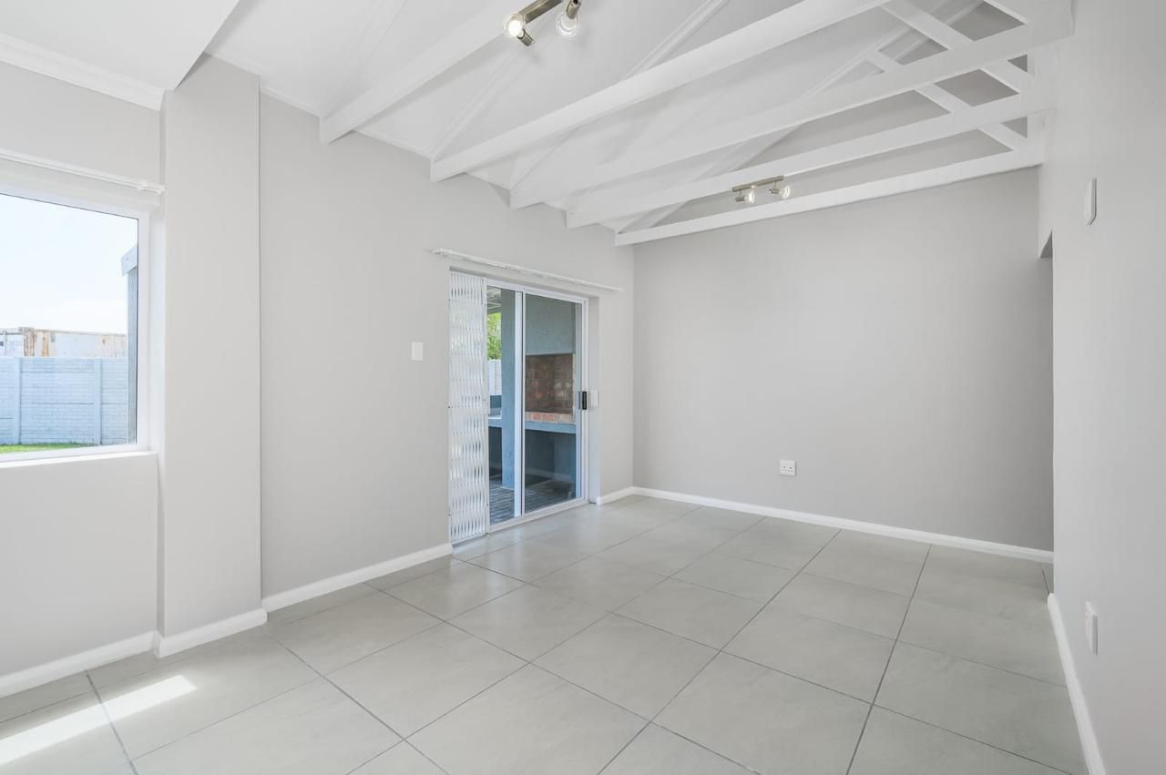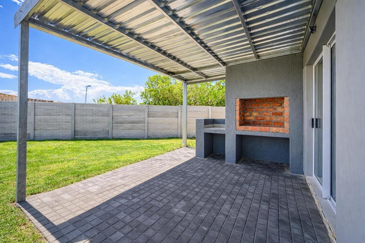 Offers a single garage with interleading access plus extra parking inside the yard. The open-plan kitchen features a gas stove and space for a double-door fridge, flowing into the lounge and dining area. Sliding doors lead to a covered braai patio overlooking a spacious garden.