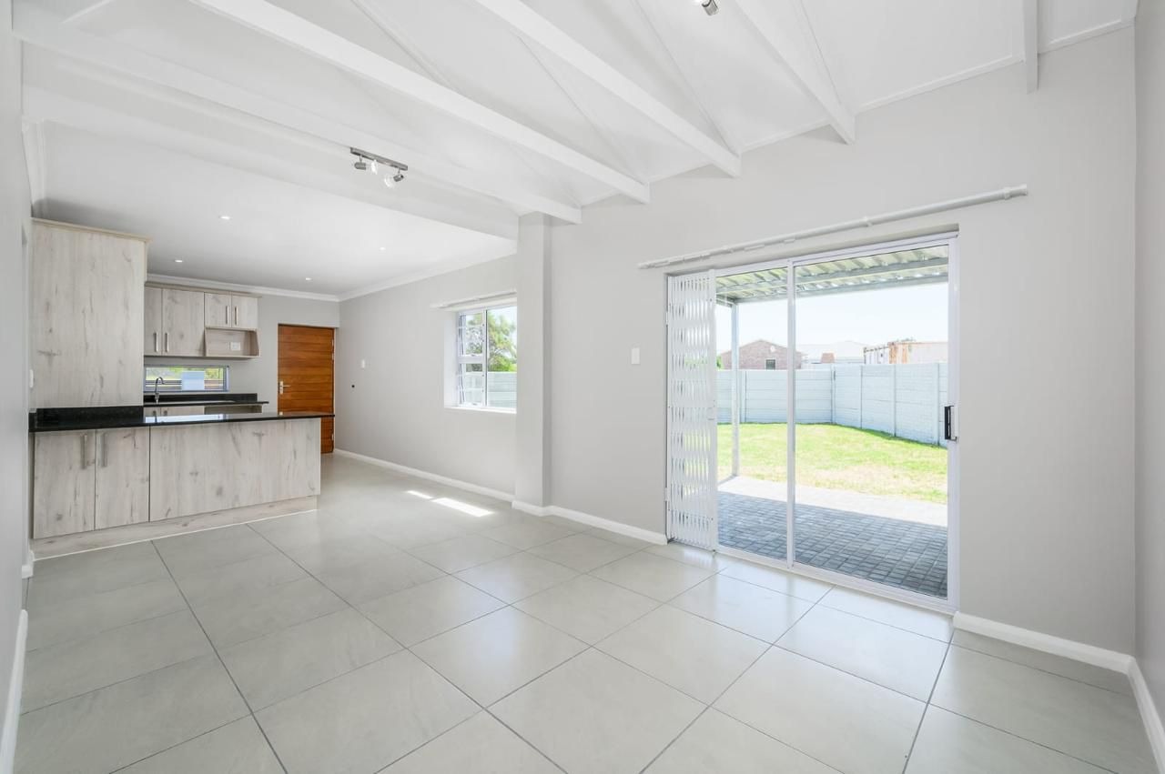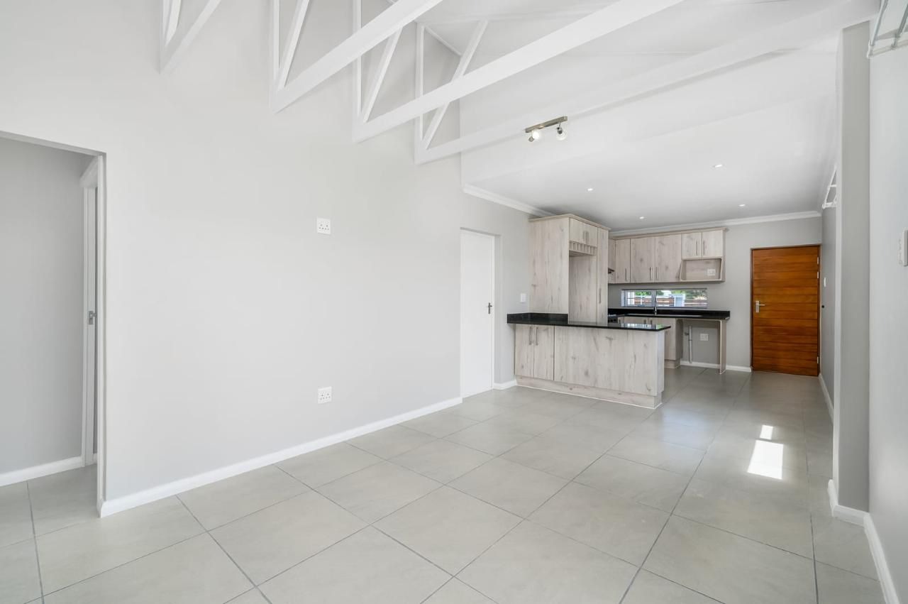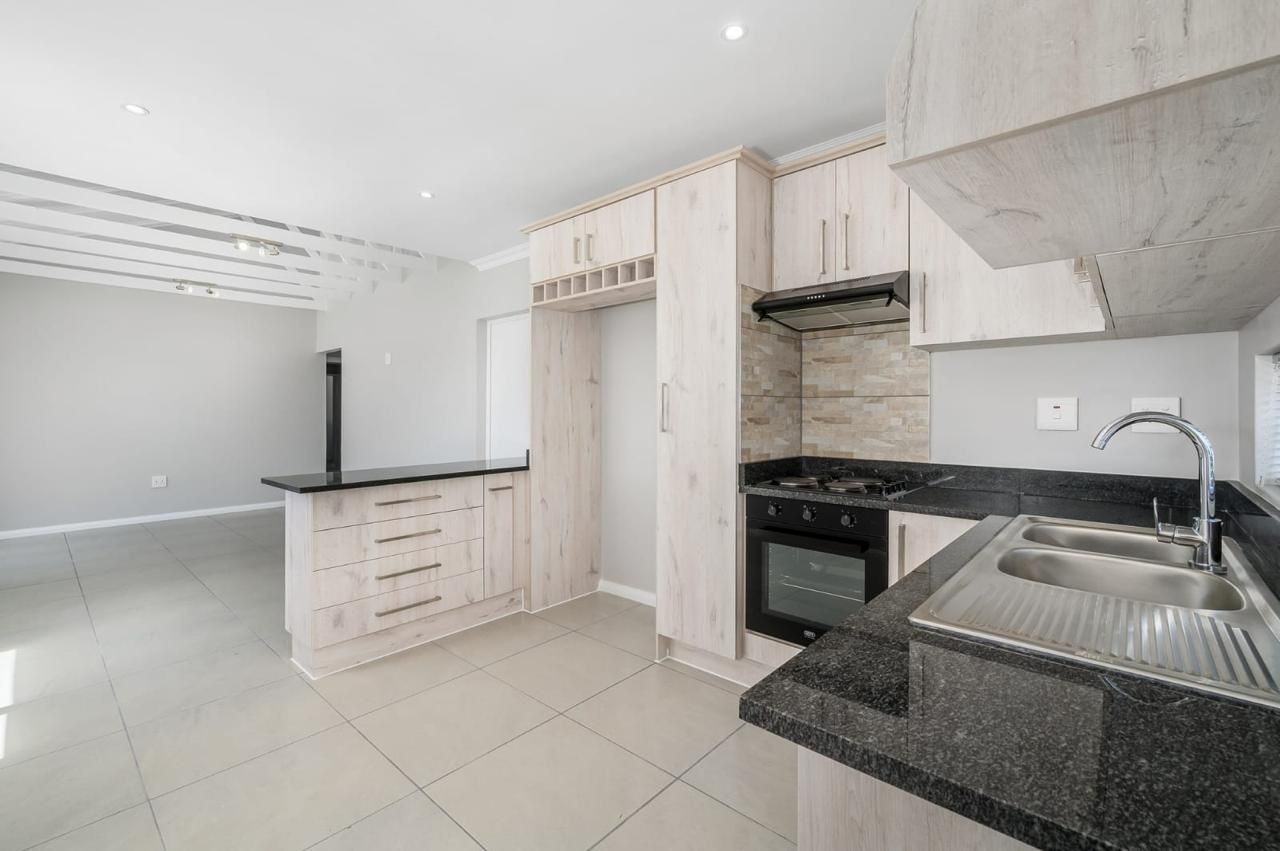 Offers a single garage with interleading access plus extra parking inside the yard. The open-plan kitchen features a gas stove and space for a double-door fridge, flowing into the lounge and dining area. Sliding doors lead to a covered braai patio overlooking a spacious garden.
