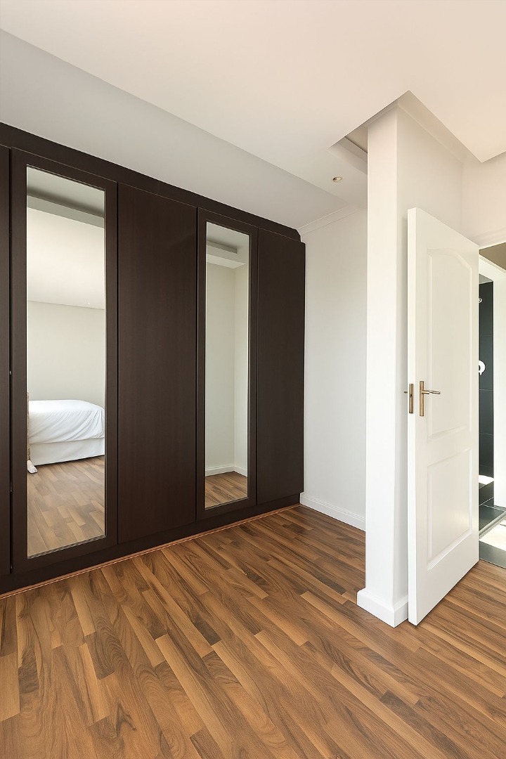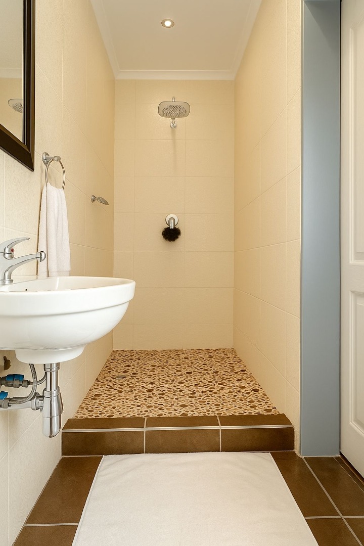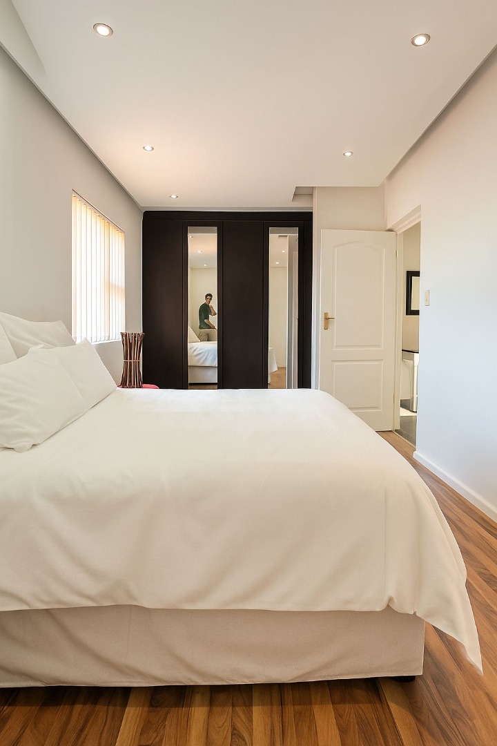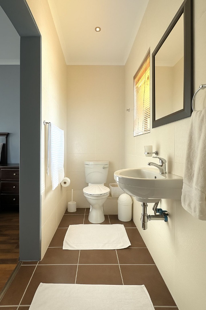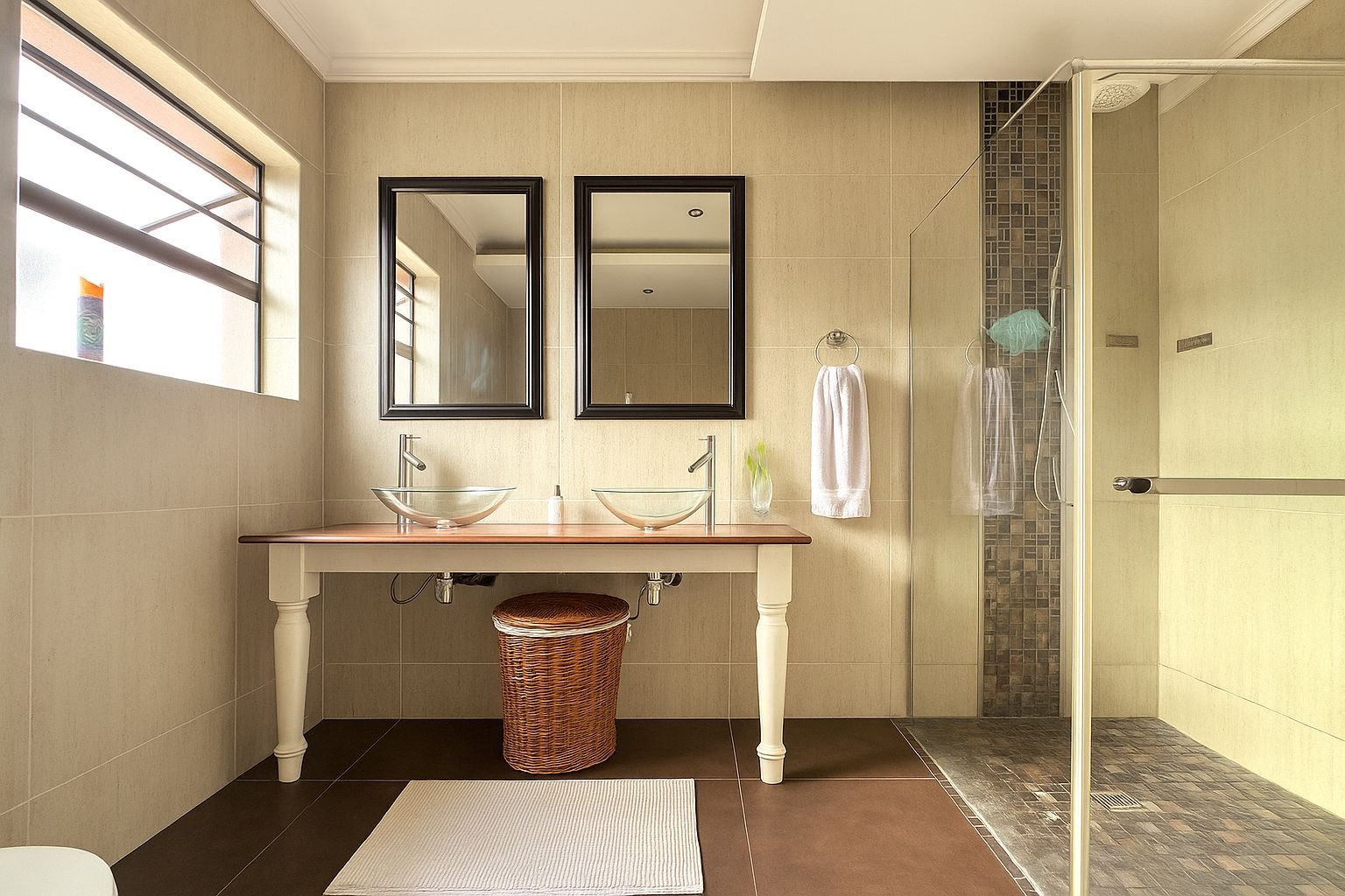 The ground floor offers two spacious bedrooms, including the main bedroom with a luxurious en-suite bathroom, while the second bedroom is also en-suite. A guest bathroom completes the lower level.