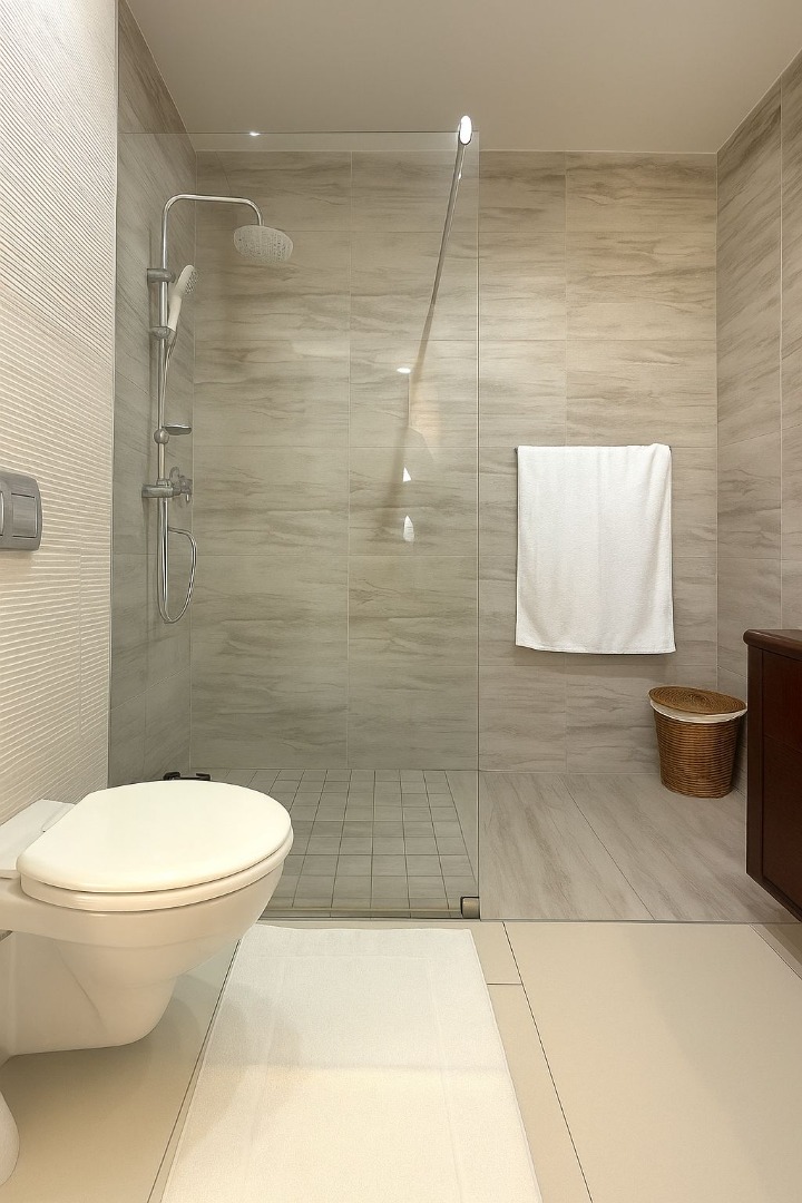 The ground floor offers two spacious bedrooms, including the main bedroom with a luxurious en-suite bathroom, while the second bedroom is also en-suite. A guest bathroom completes the lower level.