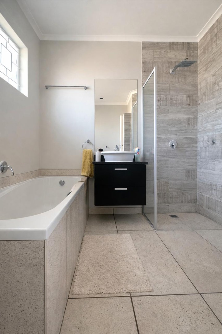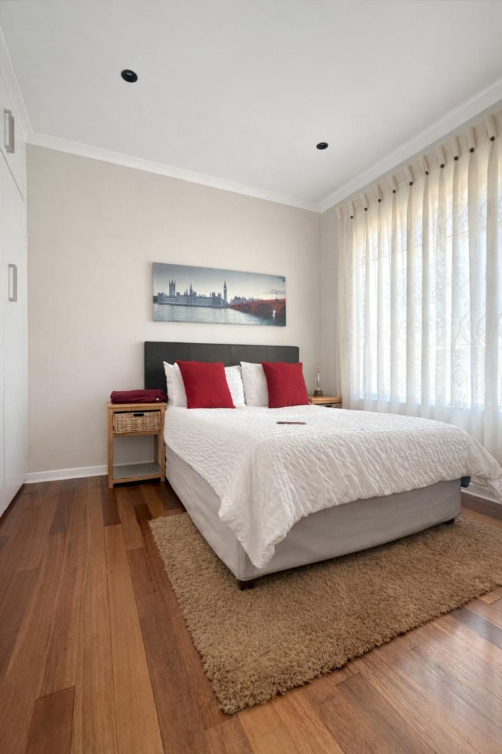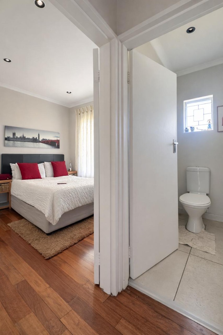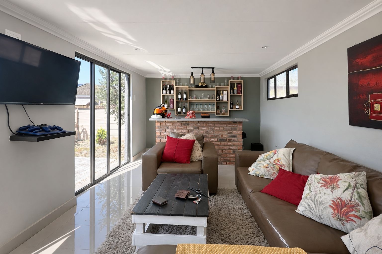 The home offers four bedrooms. The spacious main bedroom features an en-suite bathroom and is positioned privately within the living area wing of the home. The remaining three bedrooms, all with built-in cupboards, are located on the opposite side of the house and are serviced by a full family bathroom and a separate guest toilet.