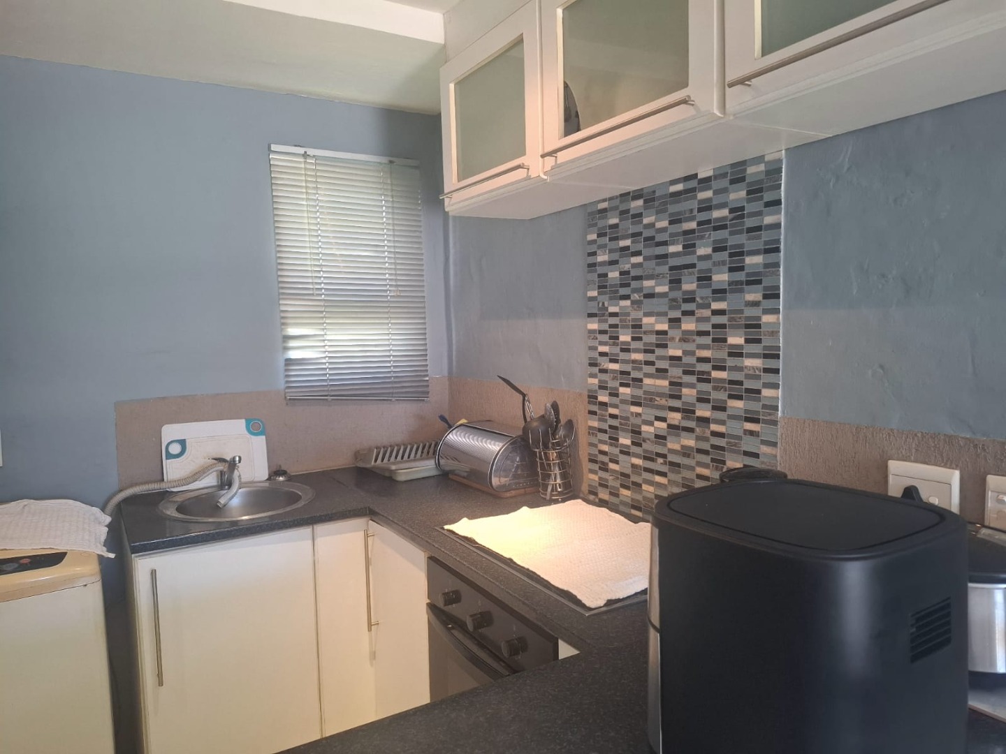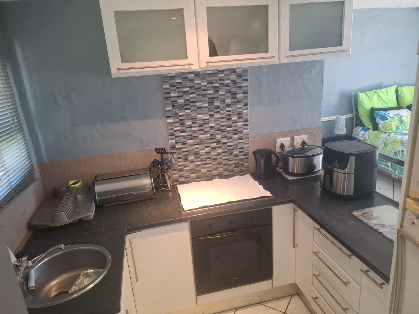 The open-plan kitchen and shower bathroom complement the room beautifully, while the living space flows effortlessly out to the stoep and built-in braai area — ideal for relaxing or entertaining.