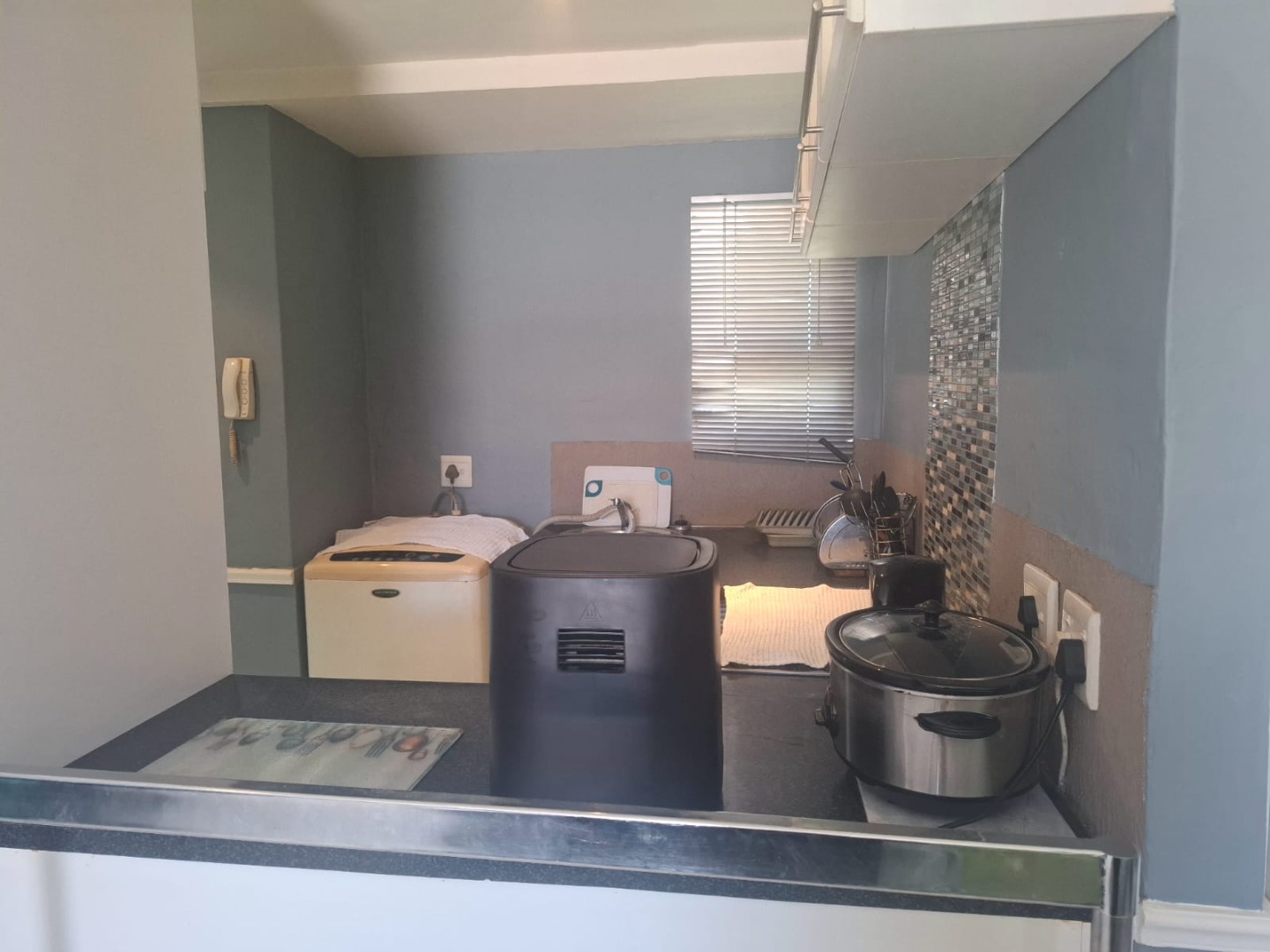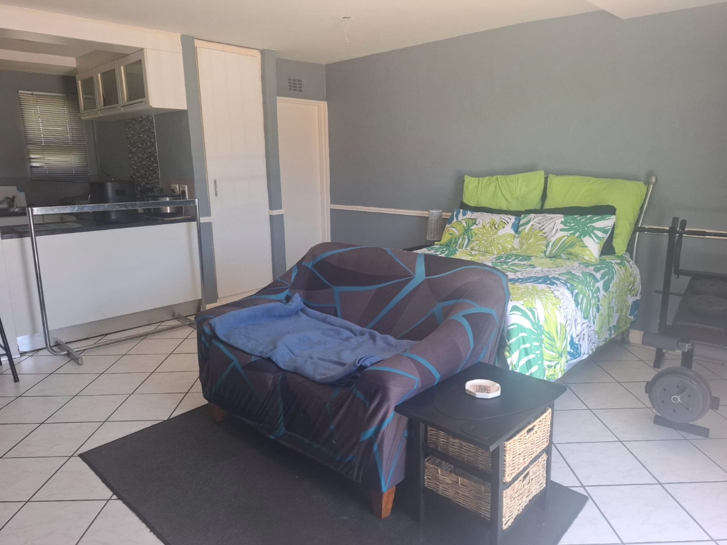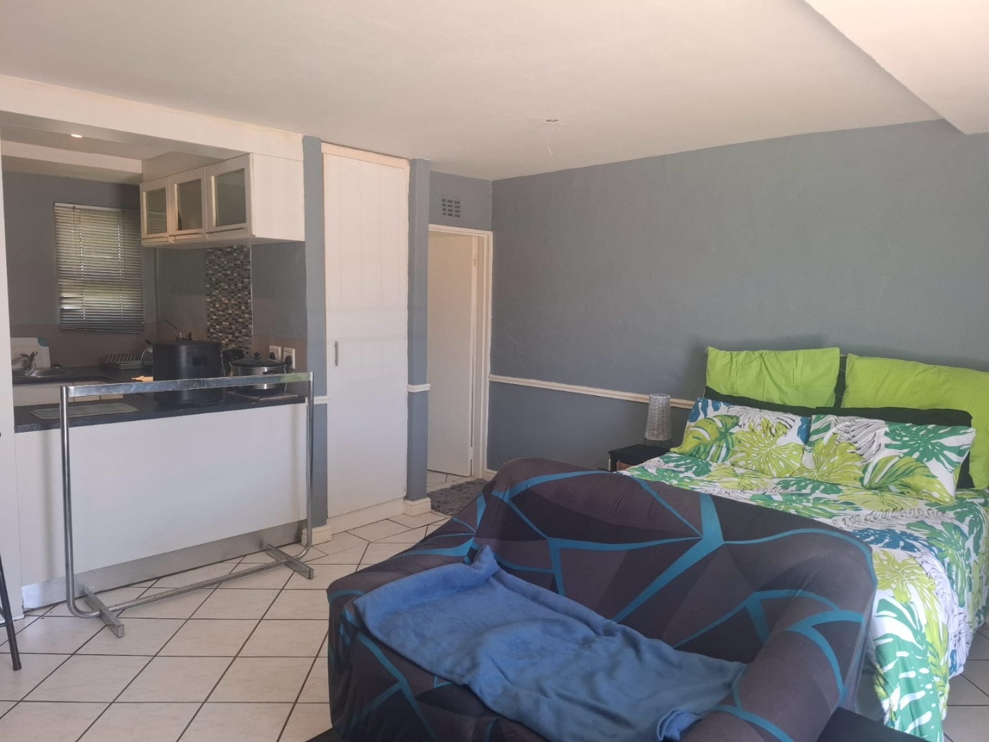 The open-plan kitchen and shower bathroom complement the room beautifully, while the living space flows effortlessly out to the stoep and built-in braai area — ideal for relaxing or entertaining.