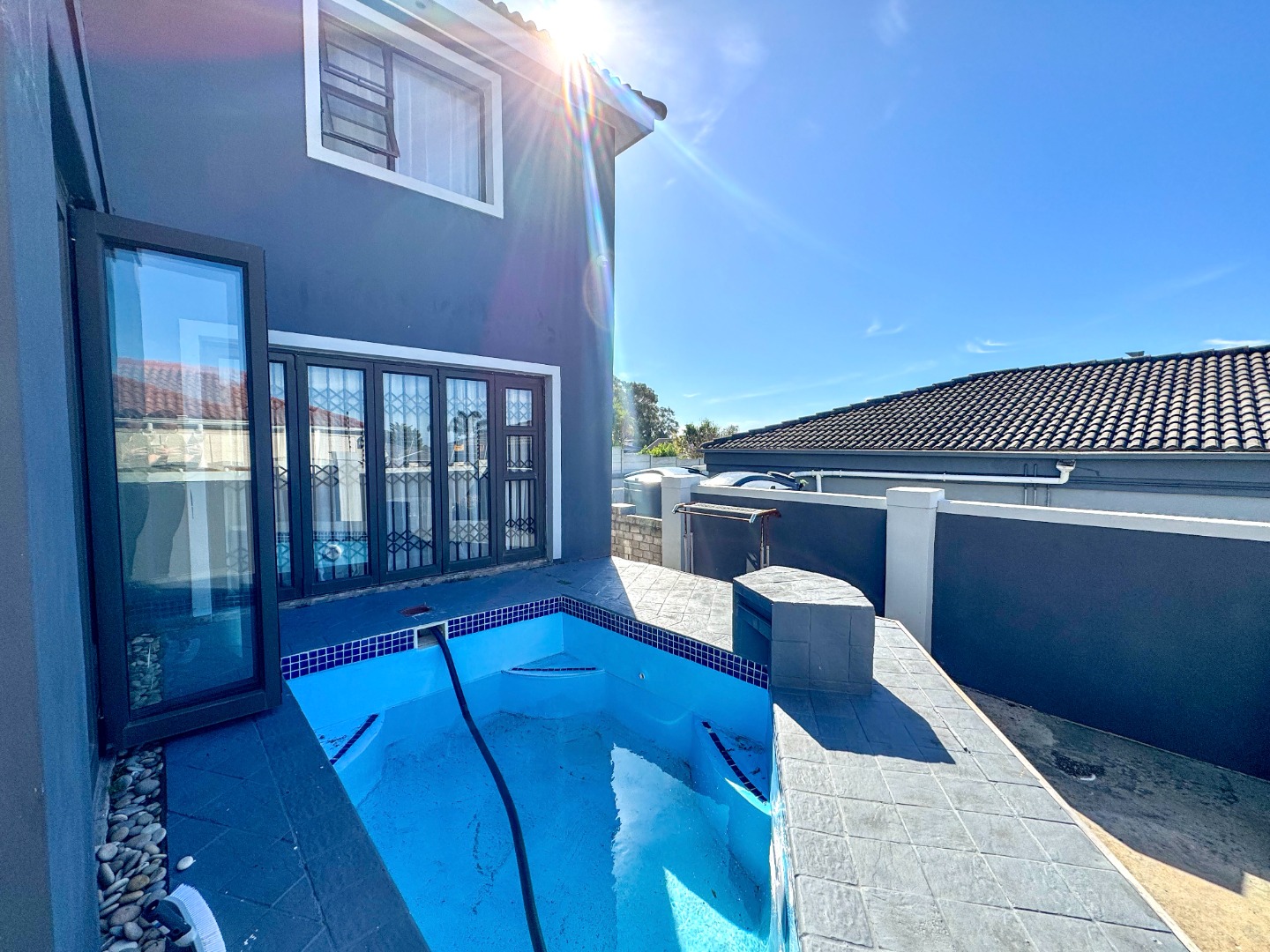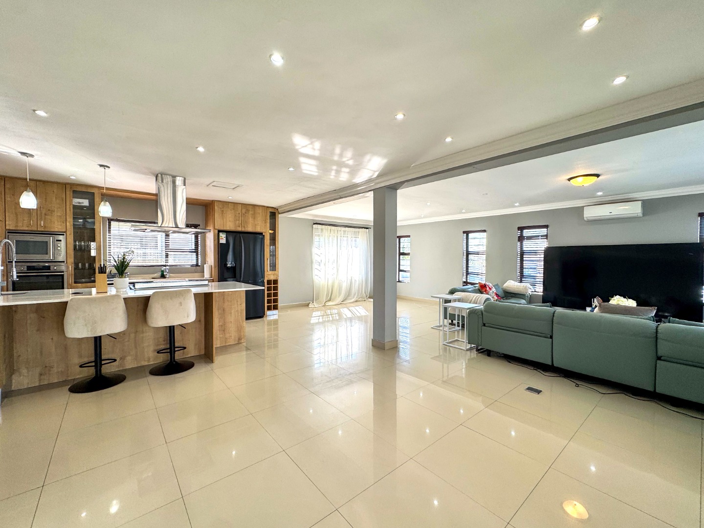 The ground floor offers a generous open-plan layout, where the kitchen, dining, and lounge areas flow seamlessly together. The modern kitchen features wood-accent cabinetry, a gas hob, eye-level oven, and large island with breakfast seating — ideal for family life and entertaining. Stacker doors connect the living area to a covered braai patio, extending onto a splash pool and low-maintenance yard for easy outdoor enjoyment.