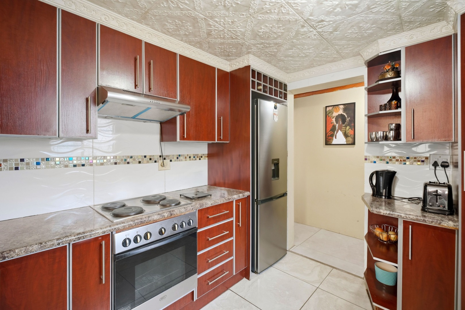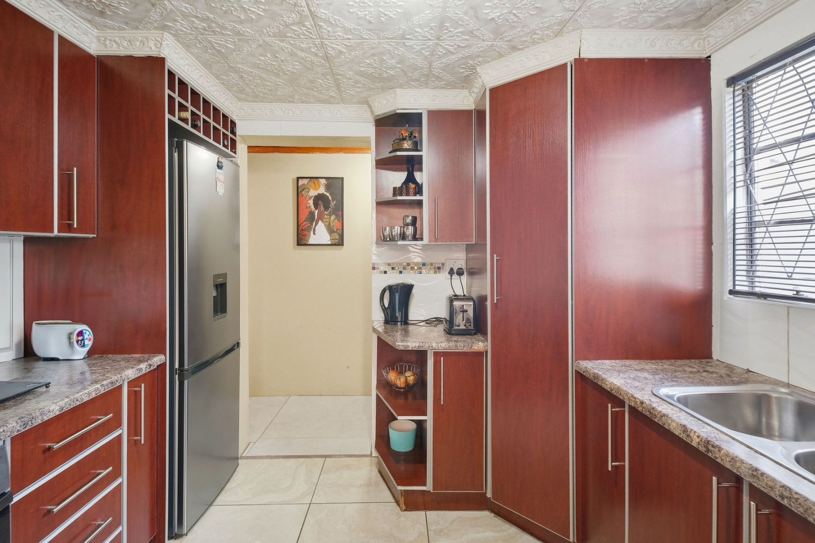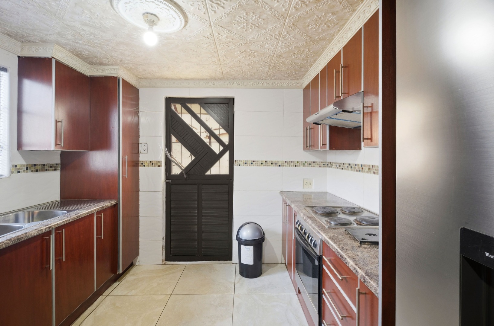 Outside offers a single Garage plus additional yard space to accommodate two more vehicles. There is also a flatlet at the back and an outside toilet, perfect for extended family or rental potential. The property is fully walled and secured with burglar gates and trellidors, providing peace of mind.