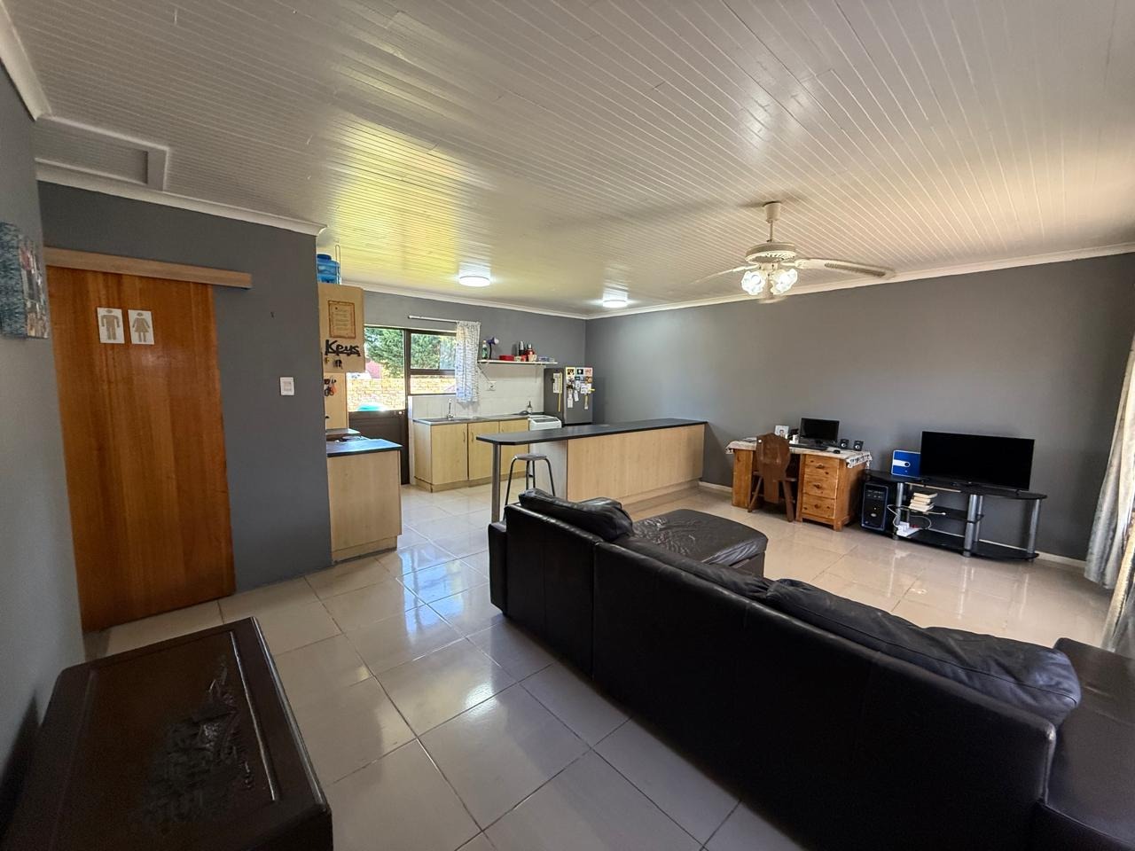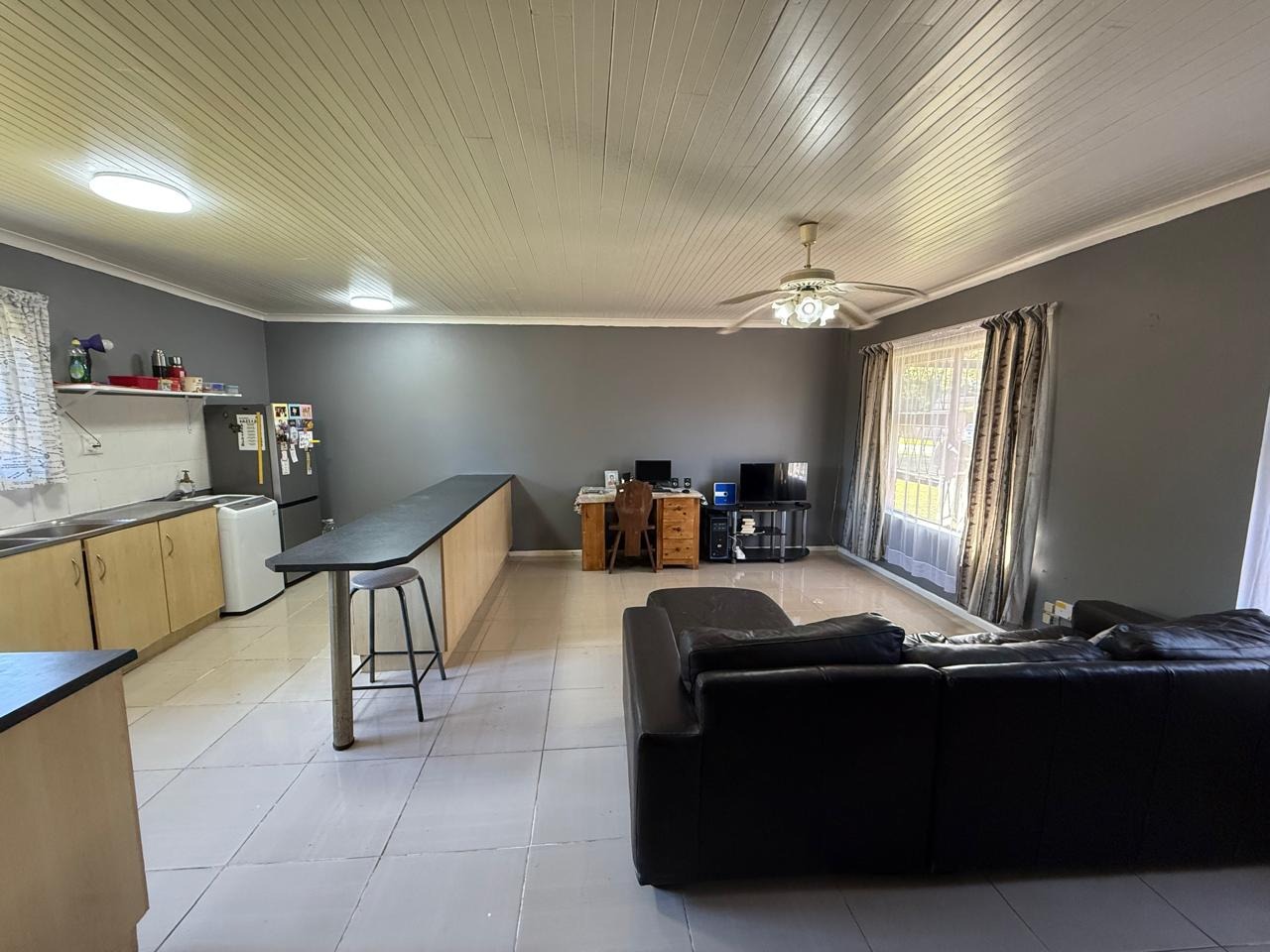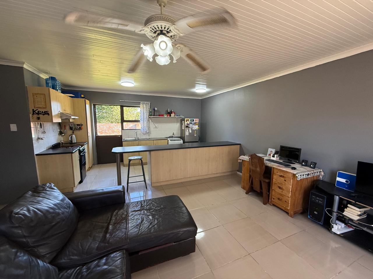 - Open-plan, fitted kitchen to huge, tiled lounge