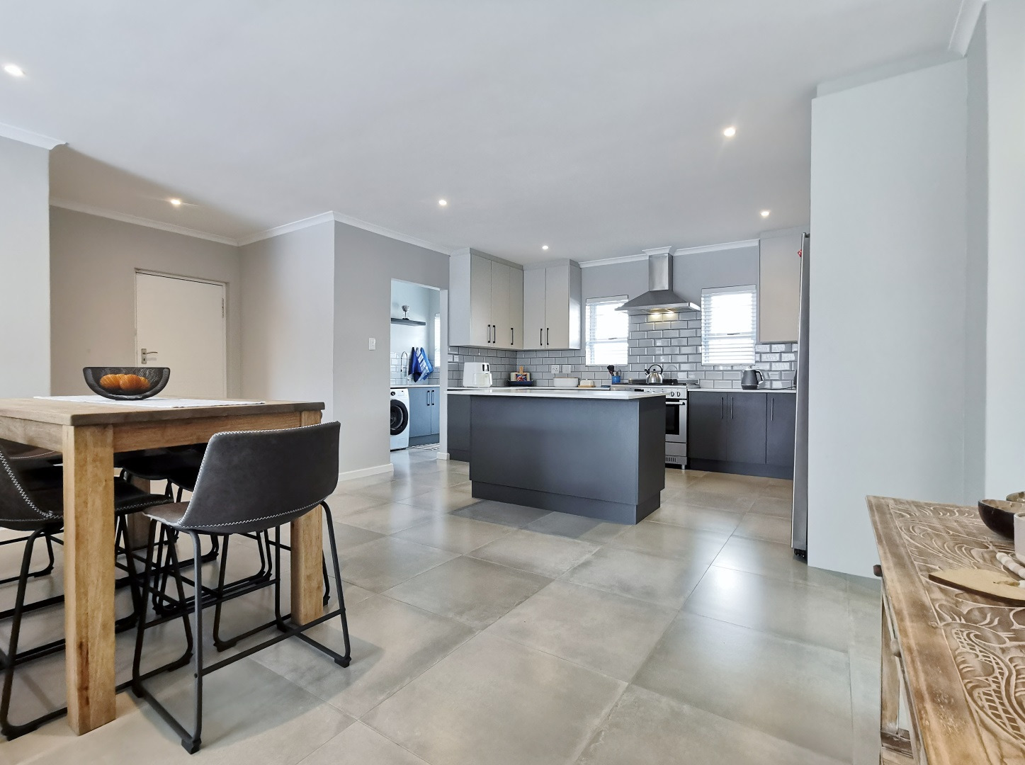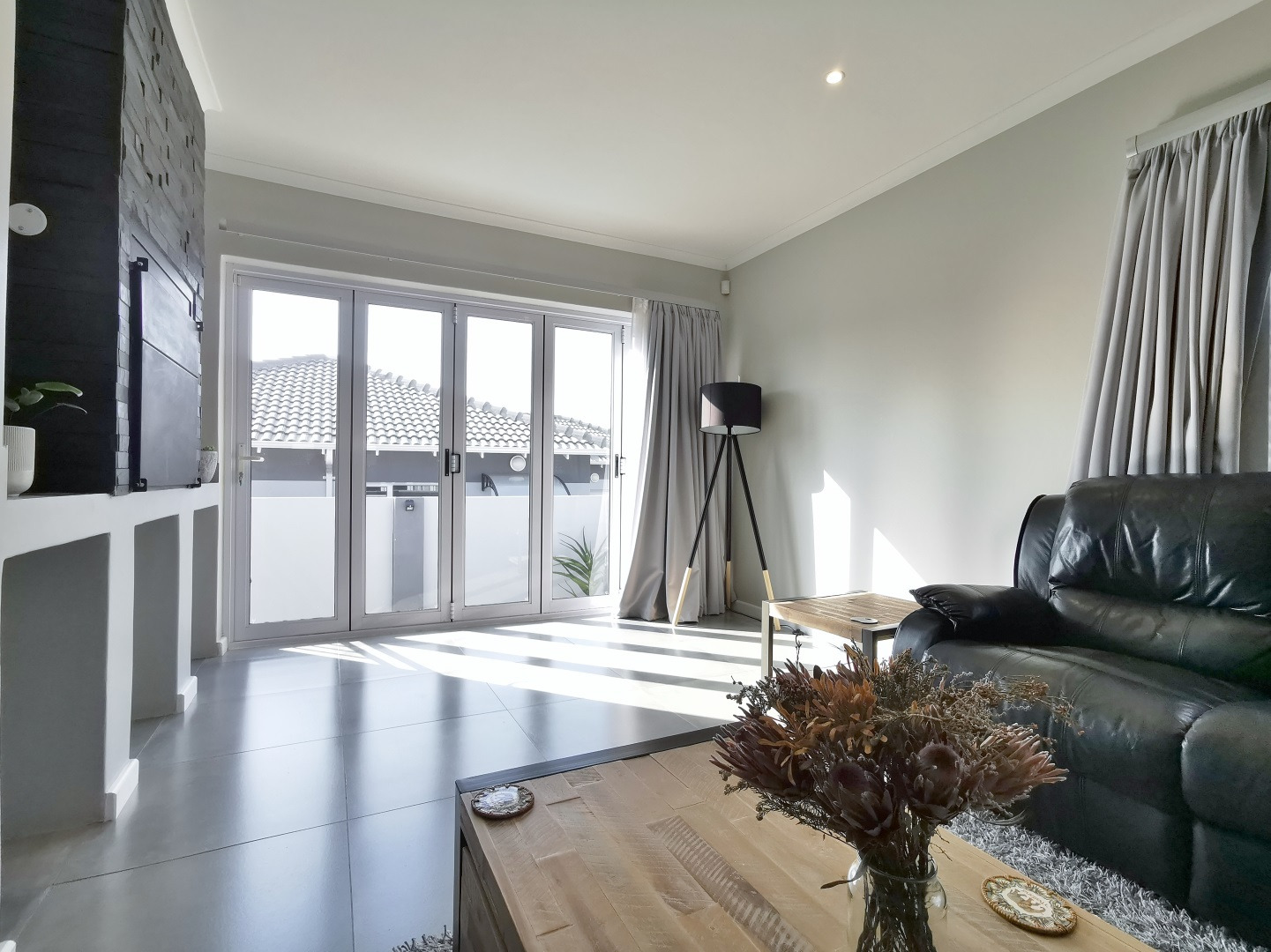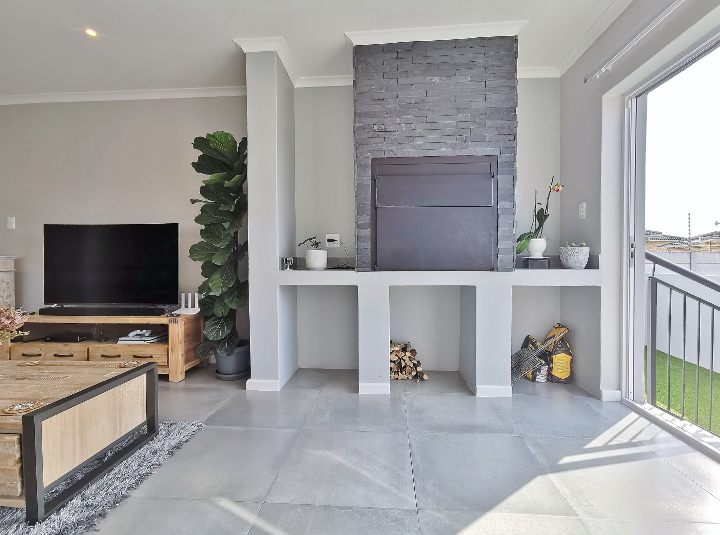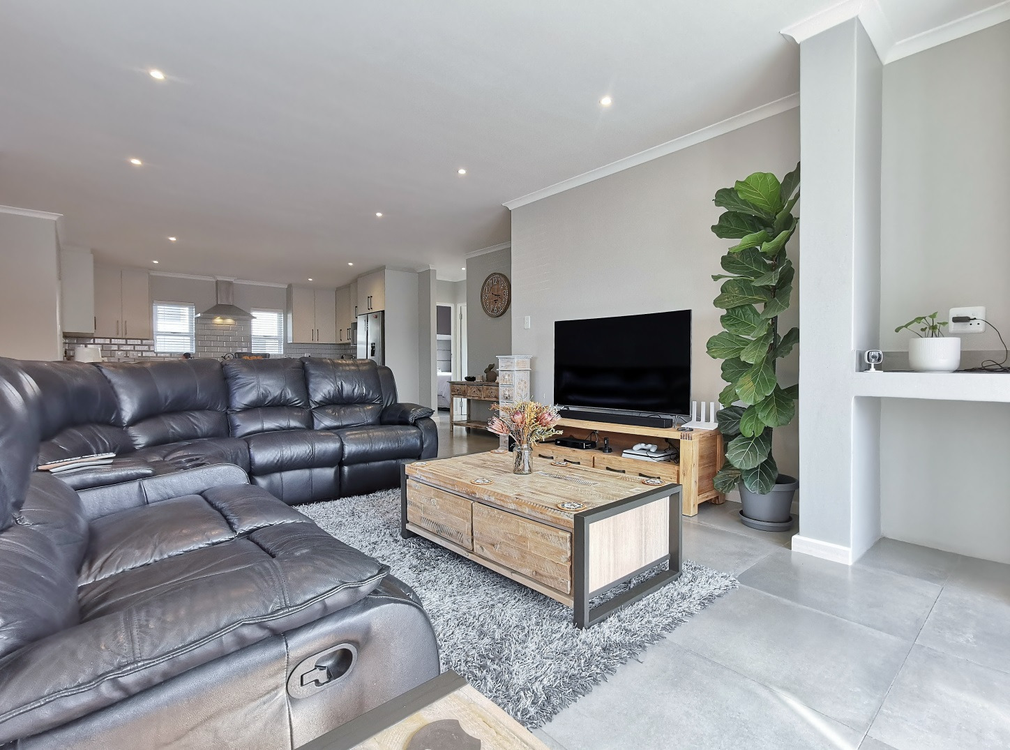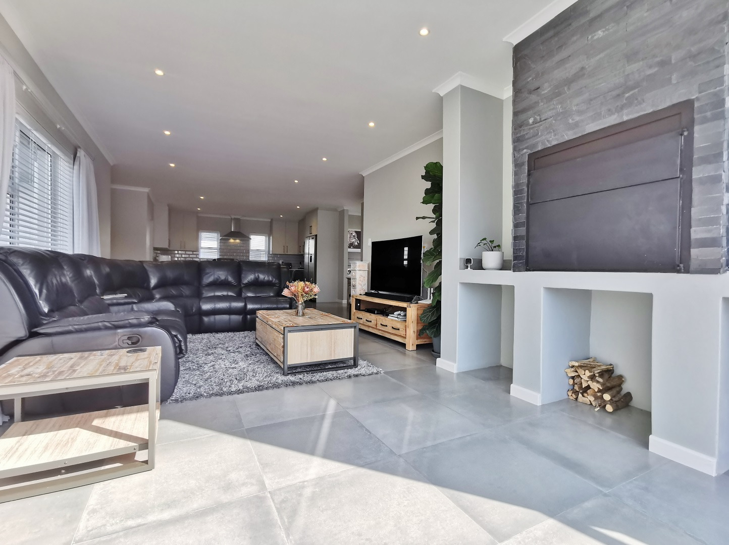 At its heart, the home boasts a sleek open-plan kitchen with a central island, quartz countertops, gas hob, stainless steel extractor and a separate scullery. The living and dining areas flow into a sunlit indoor braai room, ideal for year-round entertaining, while stack-away doors open onto a lush, low-maintenance garden with artificial lawn and designer landscaping.