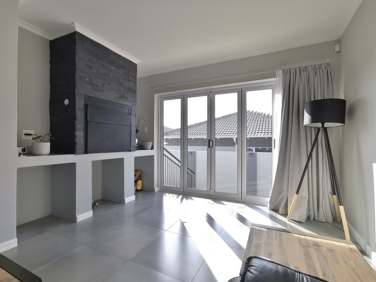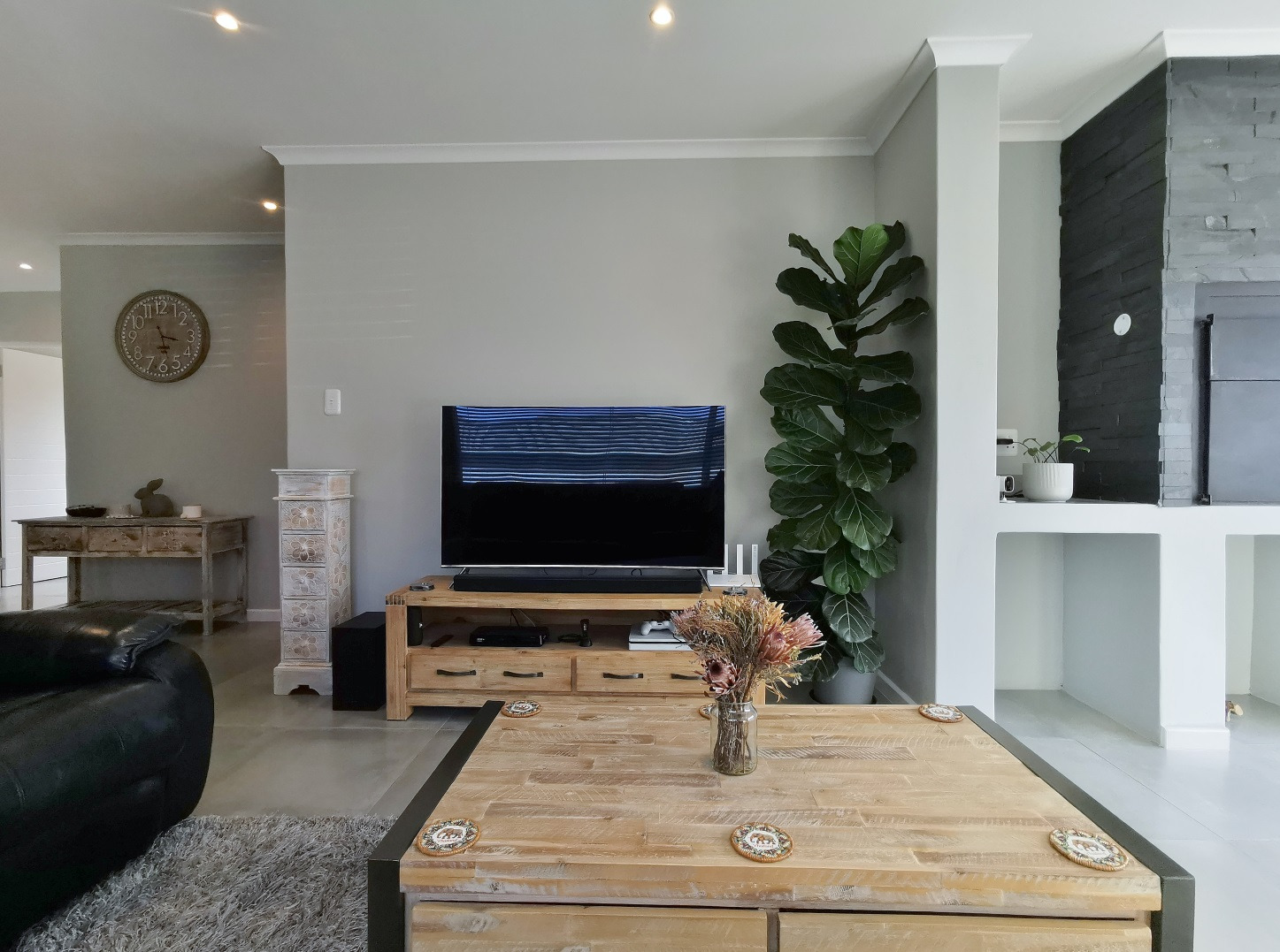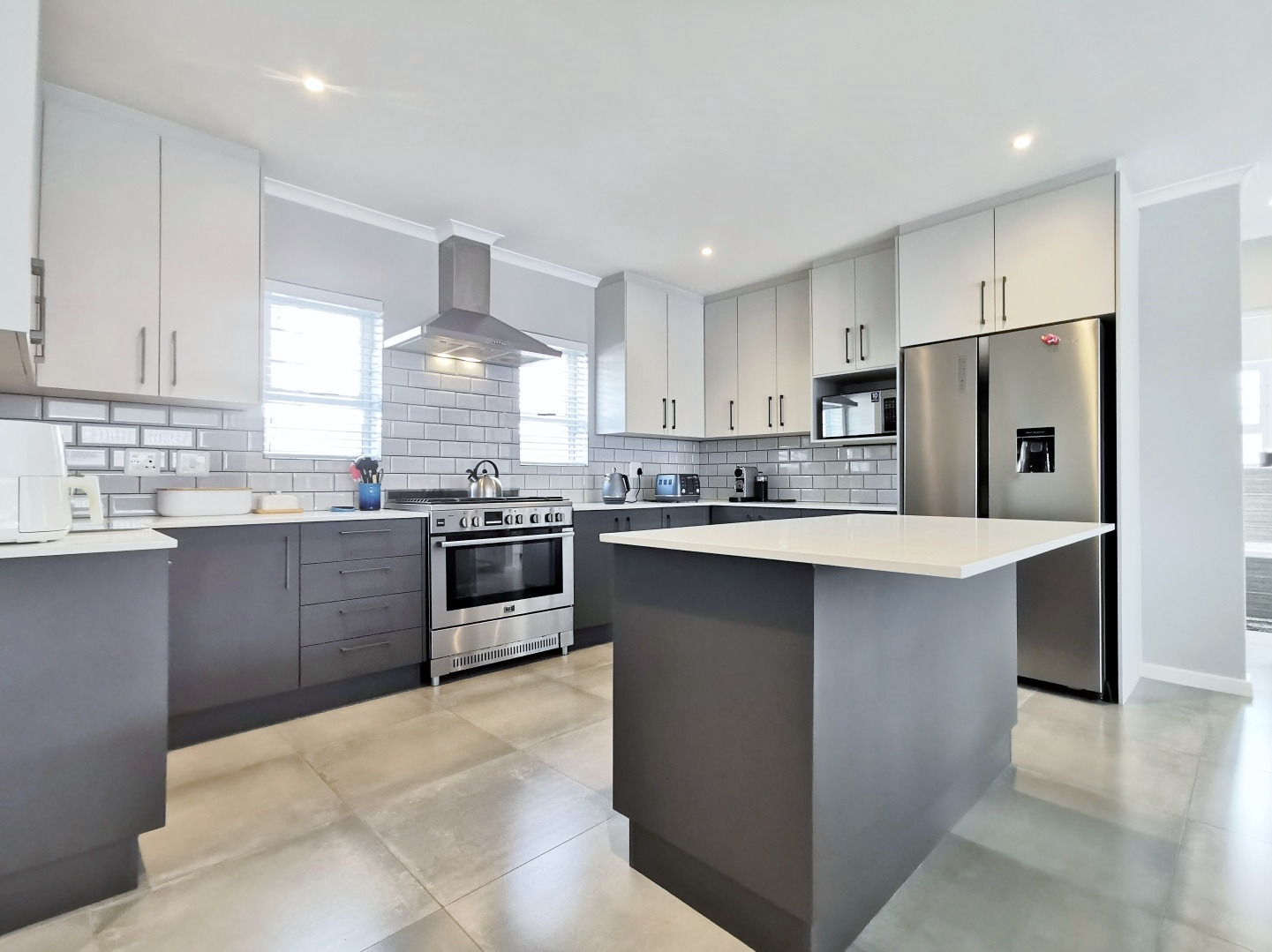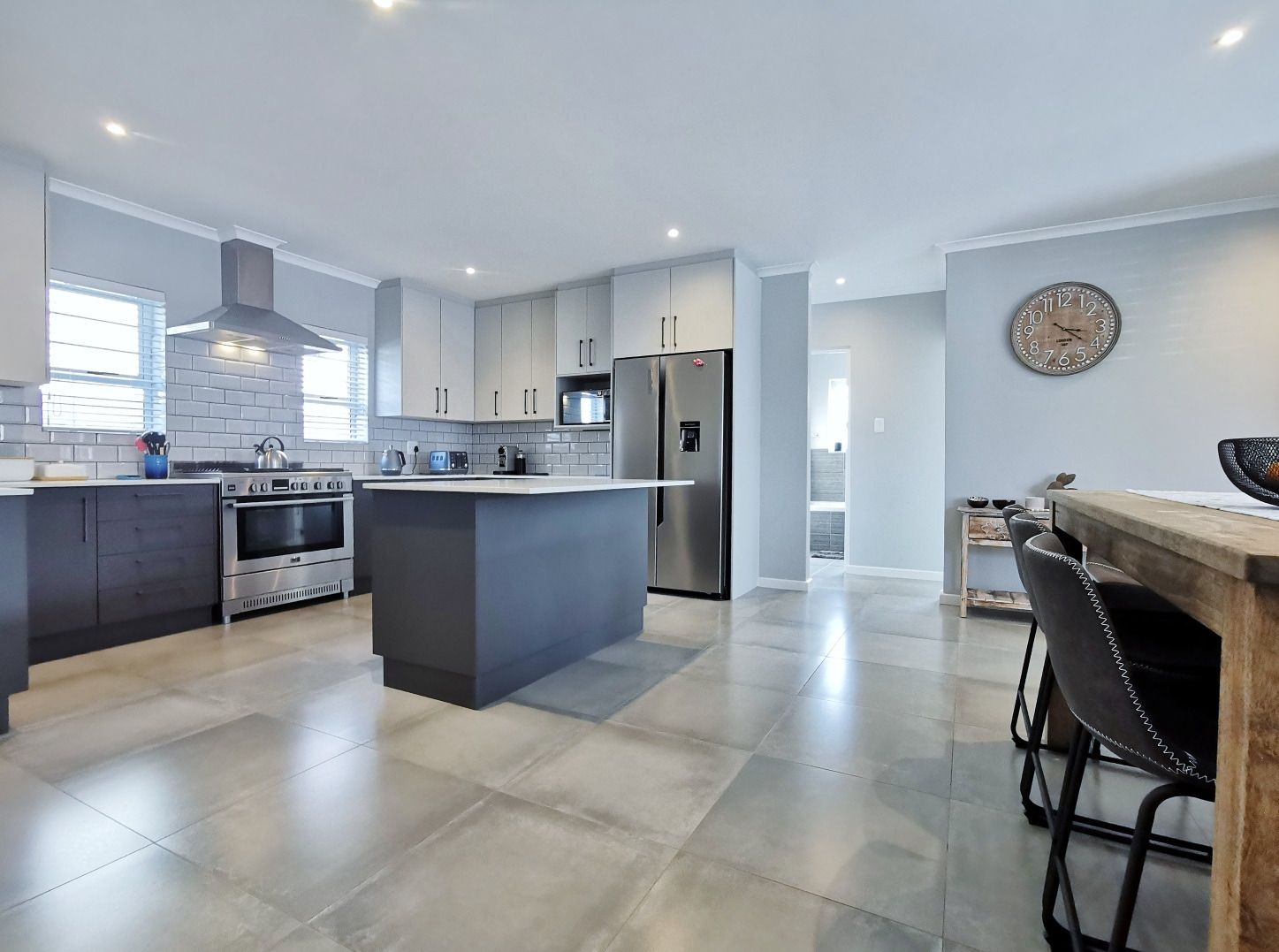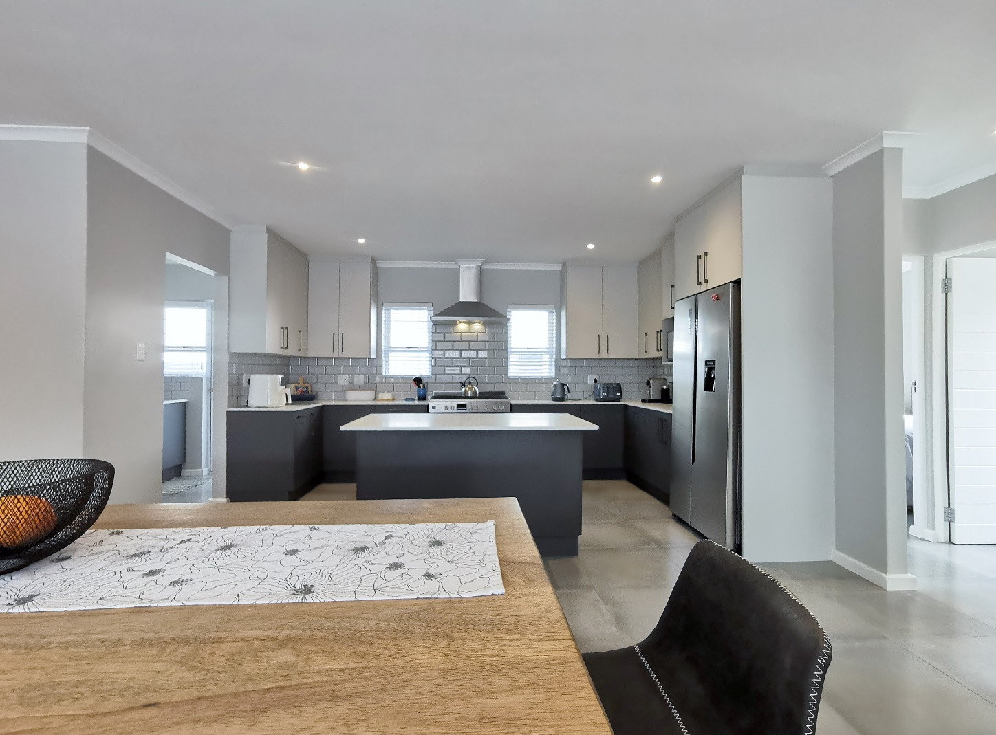 At its heart, the home boasts a sleek open-plan kitchen with a central island, quartz countertops, gas hob, stainless steel extractor and a separate scullery. The living and dining areas flow into a sunlit indoor braai room, ideal for year-round entertaining, while stack-away doors open onto a lush, low-maintenance garden with artificial lawn and designer landscaping.