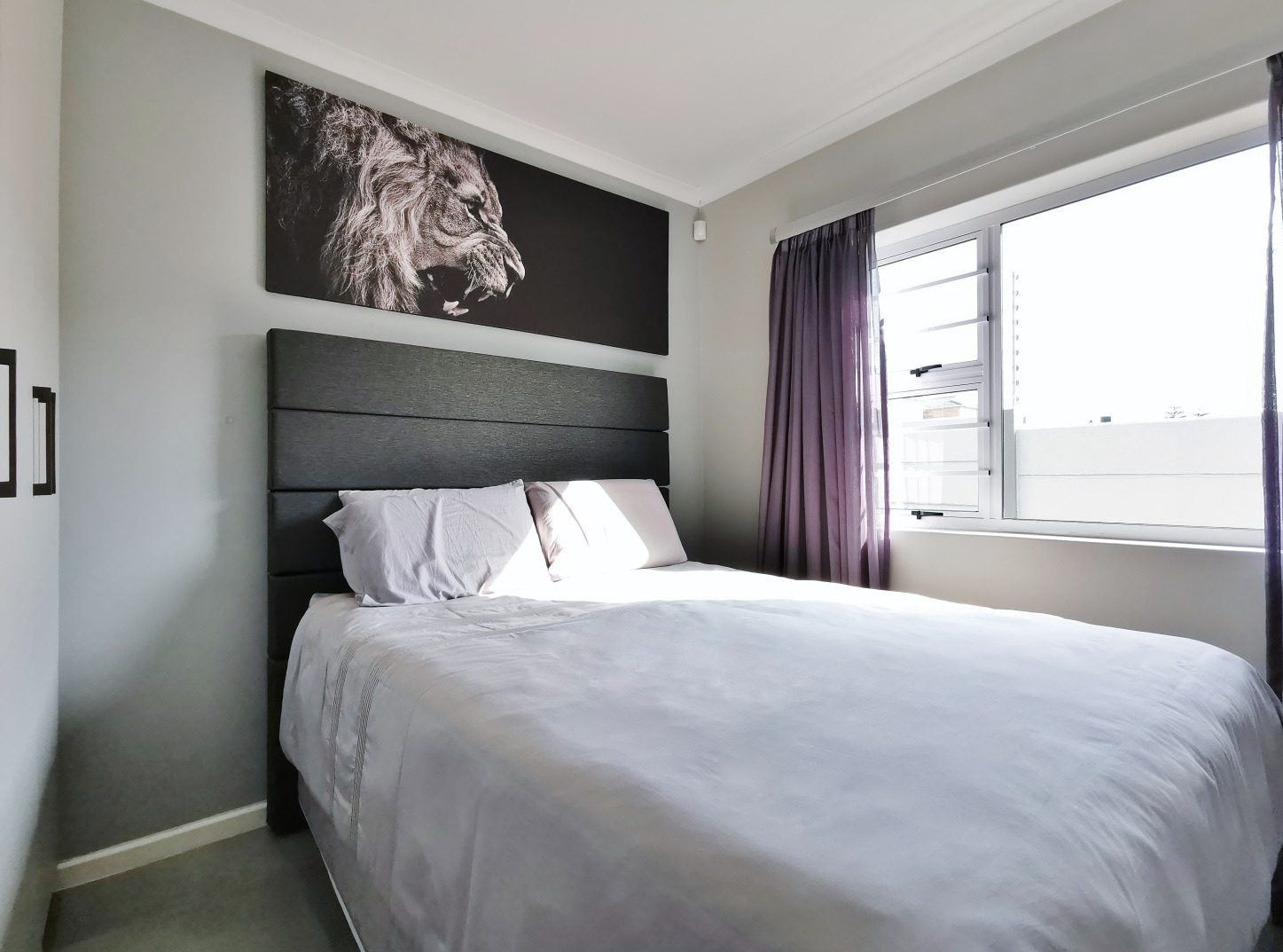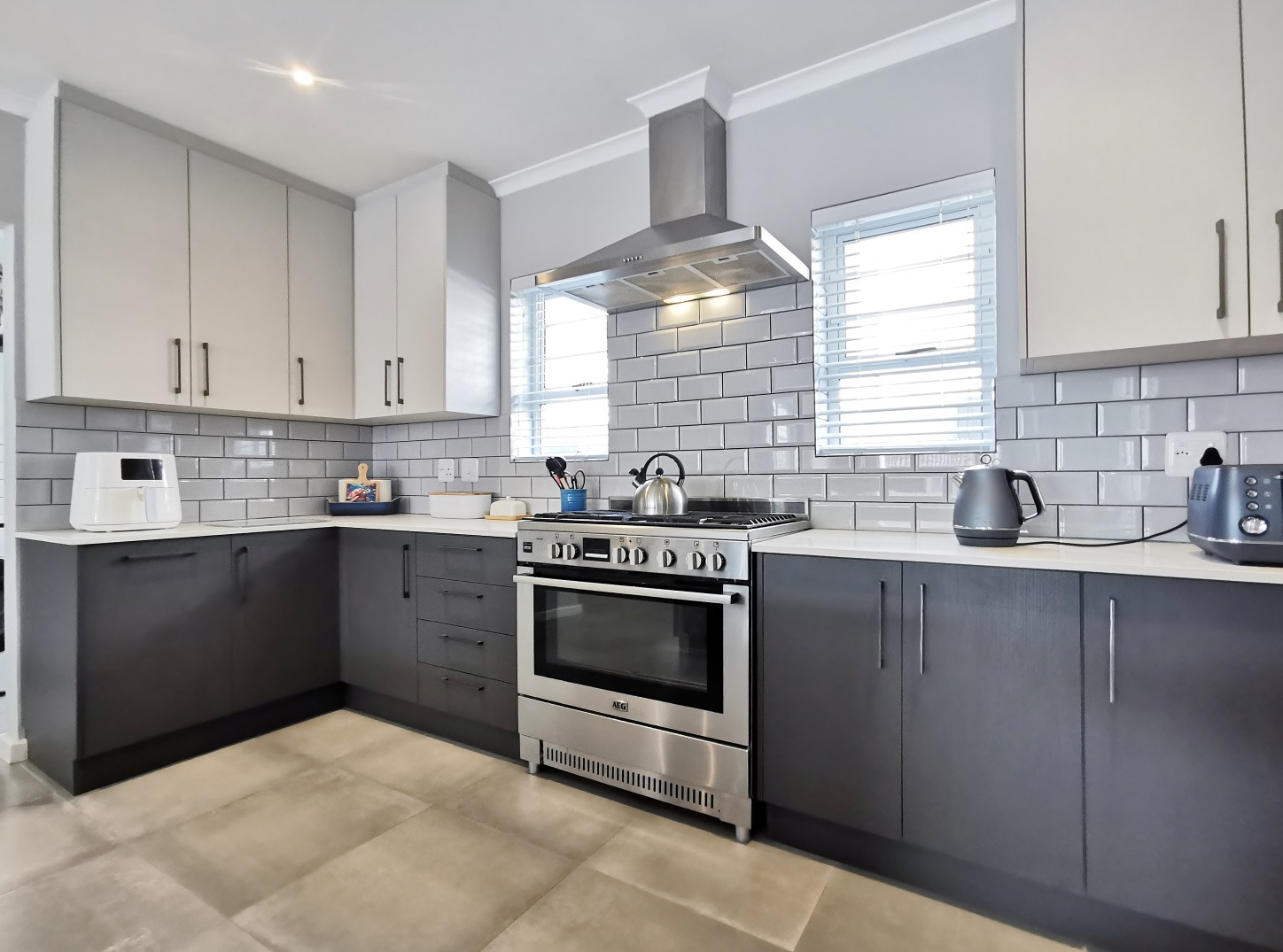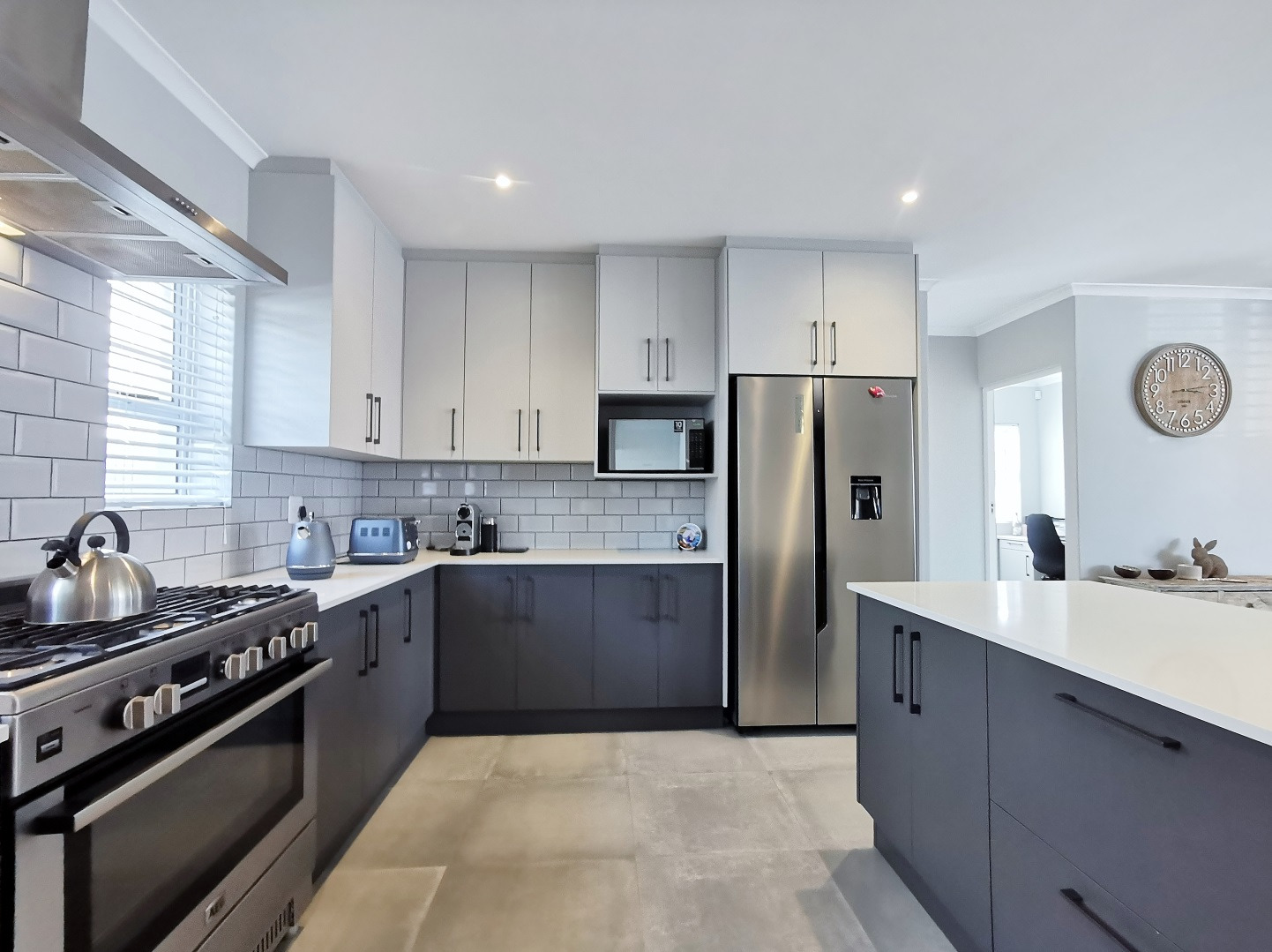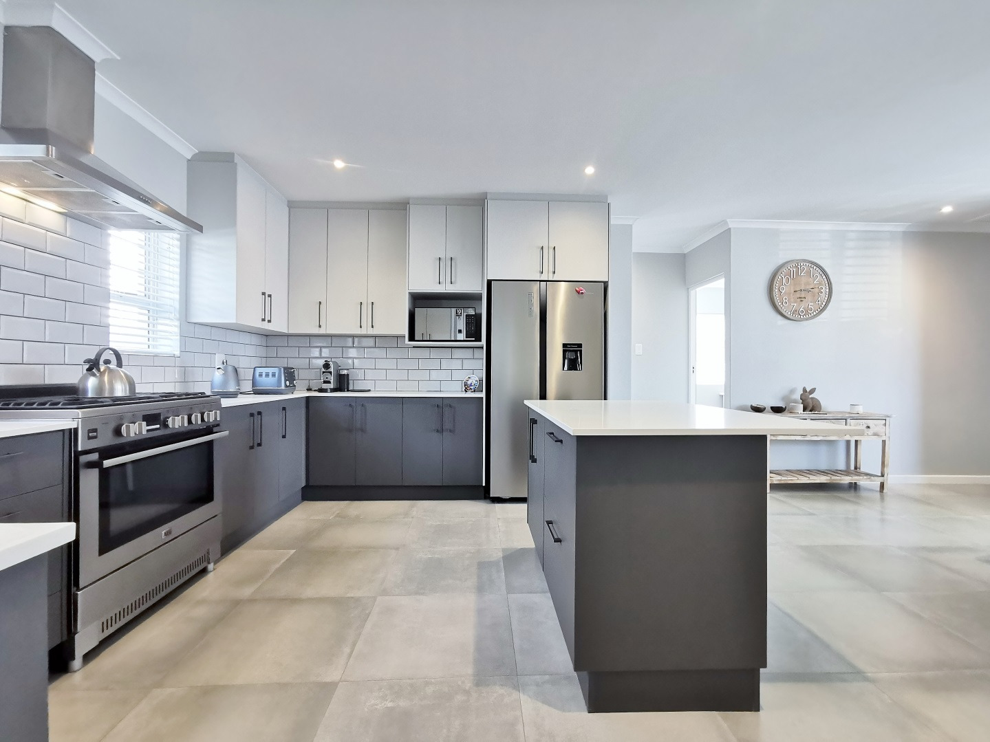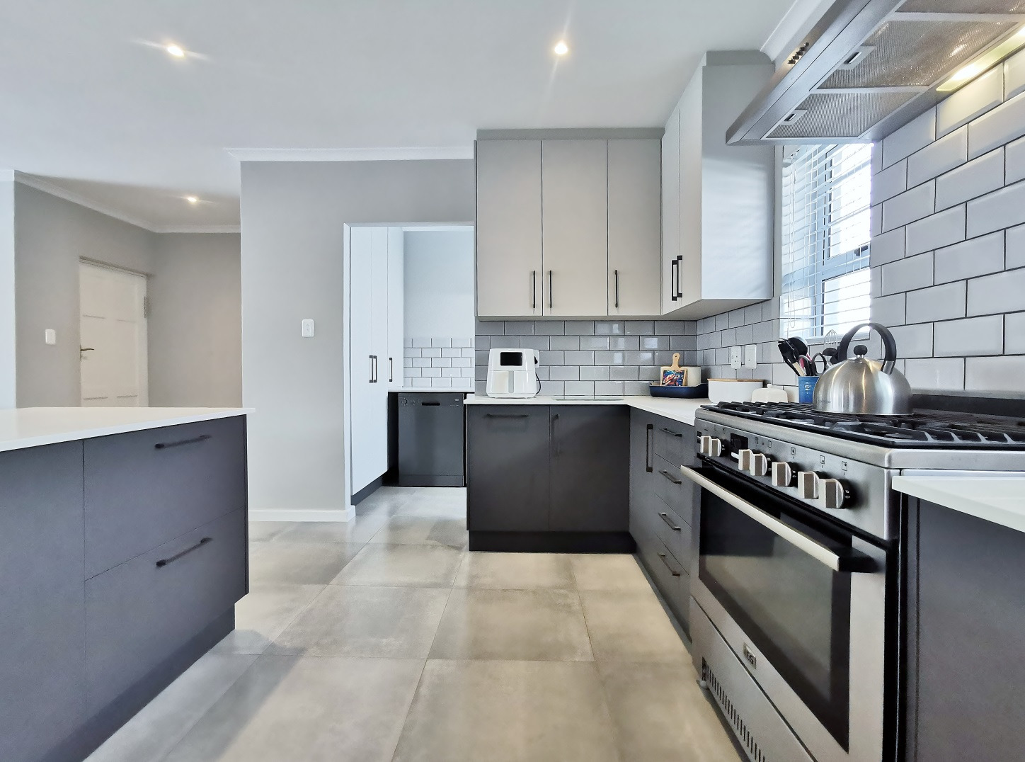 At its heart, the home boasts a sleek open-plan kitchen with a central island, quartz countertops, gas hob, stainless steel extractor and a separate scullery. The living and dining areas flow into a sunlit indoor braai room, ideal for year-round entertaining, while stack-away doors open onto a lush, low-maintenance garden with artificial lawn and designer landscaping.