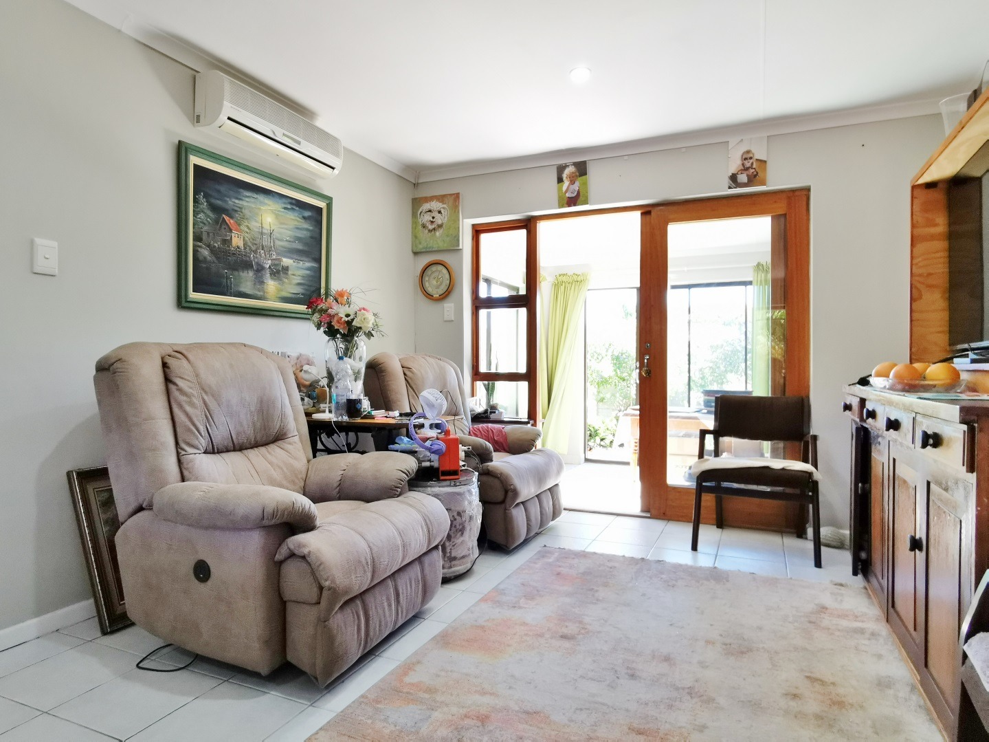 Step inside to an open-plan kitchen, thoughtfully equipped with a gas hob, electric stove, and a convenient dishwasher point. The property boasts two distinct lounge areas, providing ample space for relaxation and entertainment. One lounge includes an air-conditioning unit and seamlessly connects to an enclosed patio. This private patio extends to a leafy garden, creating a serene outdoor retreat.