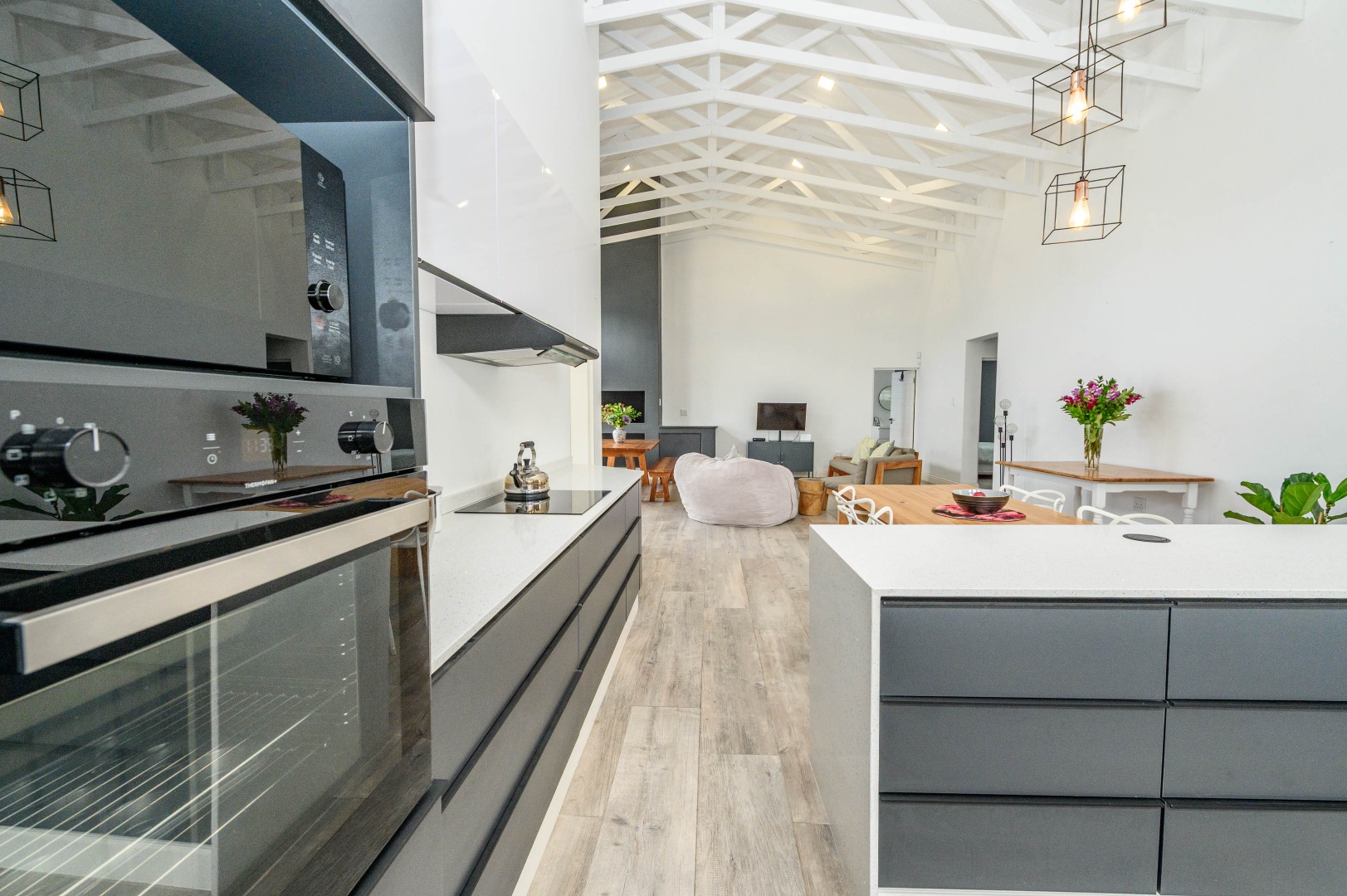 The interior layout is bright and contemporary, featuring vinyl flooring throughout and a seamless open-plan design. The kitchen forms the heart of the home, fitted with Caesarstone worktops, clean-lined cabinetry, and display cupboards that balance practicality with modern appeal.