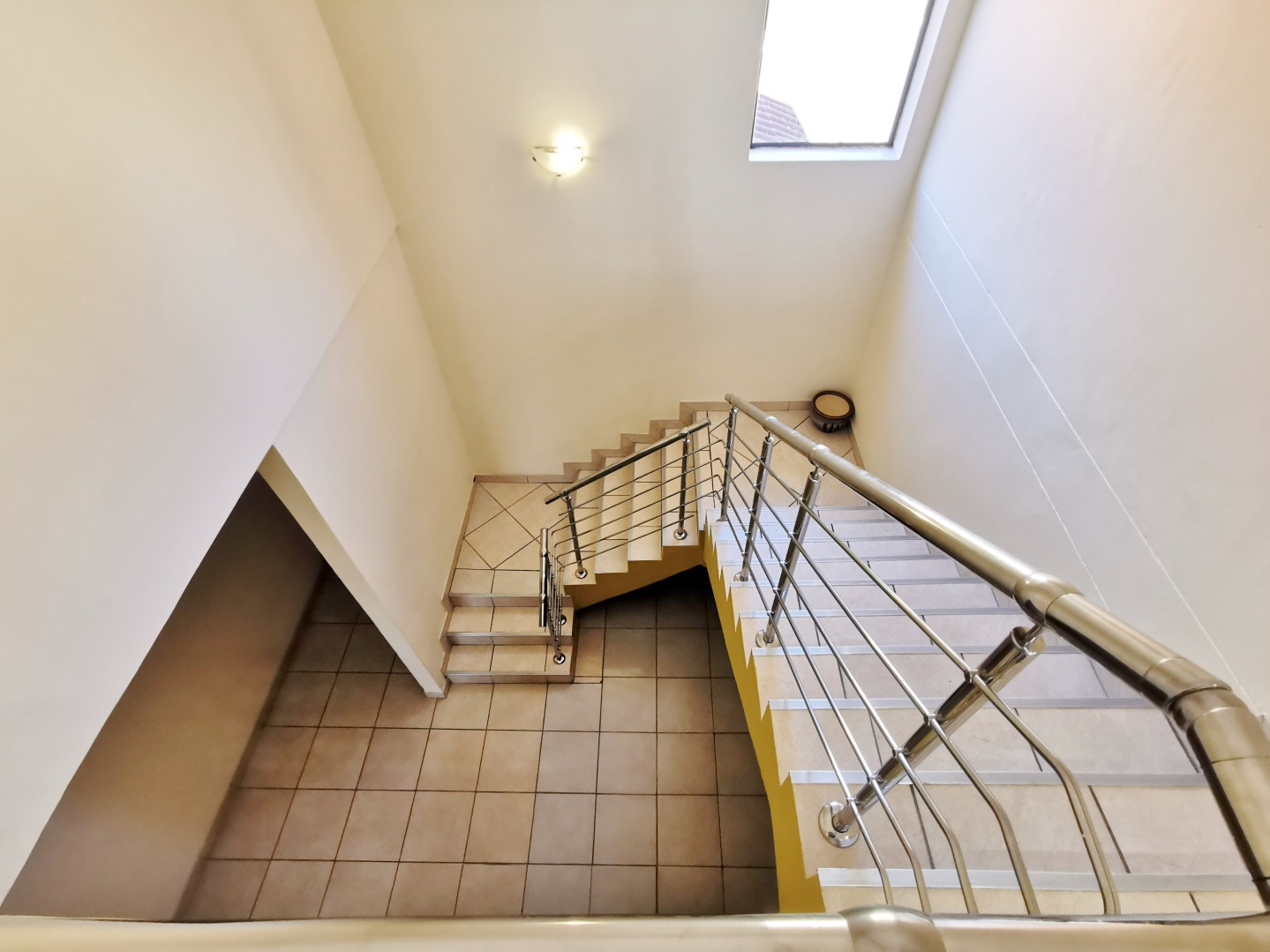 Tiered steps lead down to a spacious kitchen with scullery and an informal lounge area, perfect for casual living and easy entertaining. This level opens out to a open patio with a built-in braai, set on the upper garden terrace, ideal for enjoying summer evenings. The tiered, enclosed garden offers a rear access gate to the street behind, enhancing privacy and functionality.