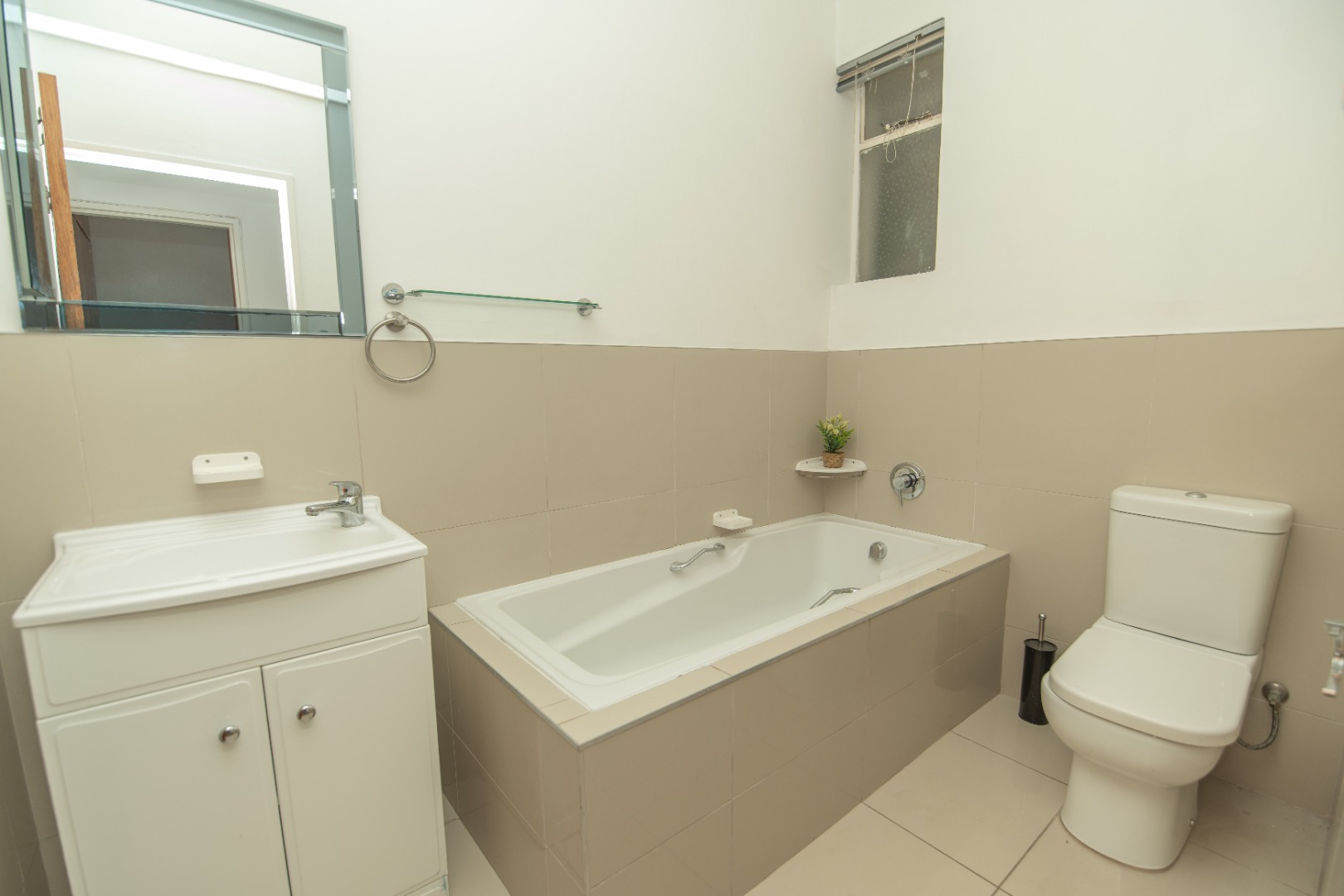 - The main bathroom is well-appointed with a bath, basin, and toilet, and includes a cleverly concealed laundry nook.