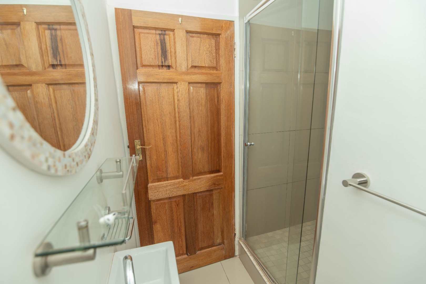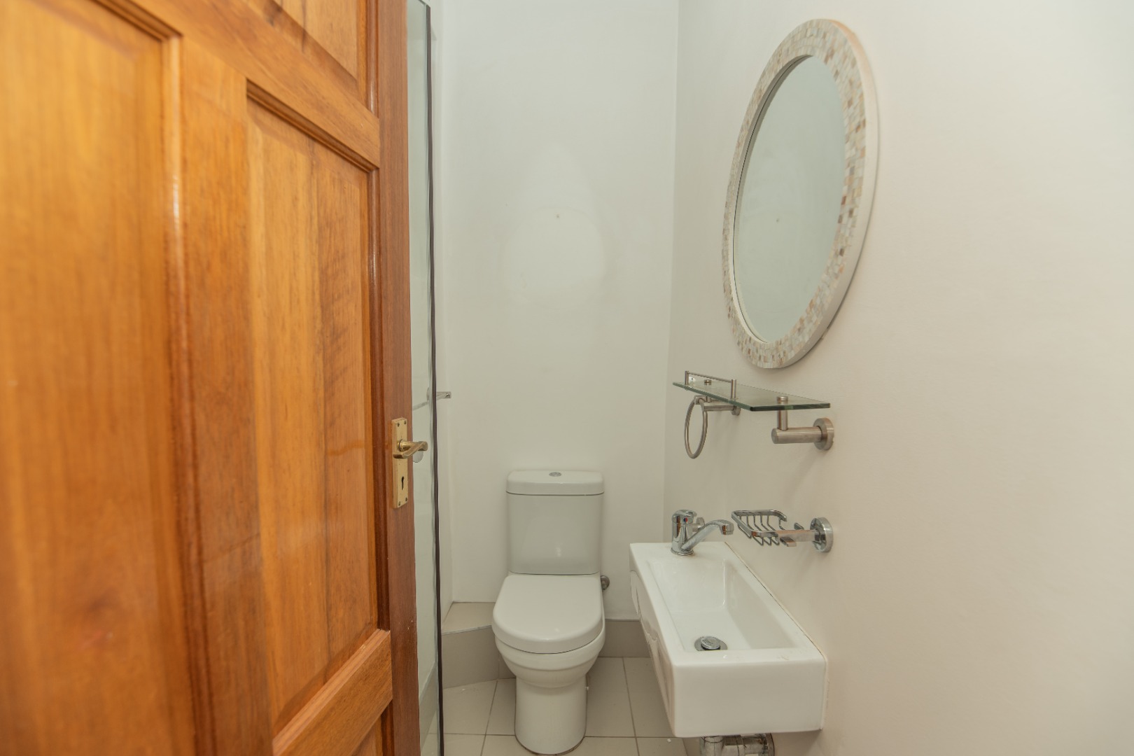 - A second bathroom offers a shower, basin, and toilet.