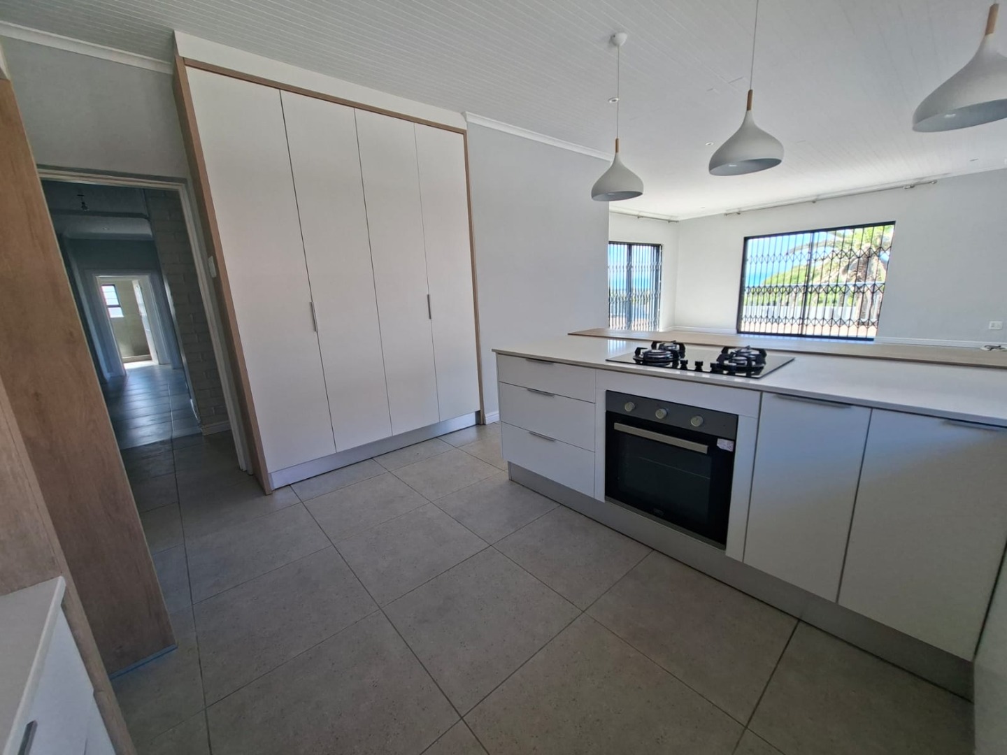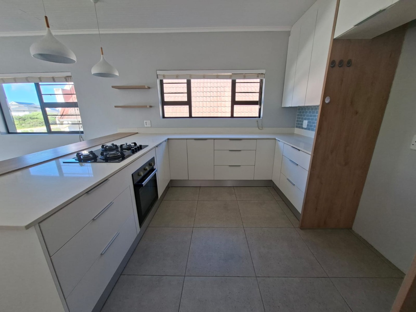 The well-lit kitchen is both stylish and functional, featuring a gas stove and elegant white stone countertops, offering a clean, timeless finish that complements the home’s coastal feel.