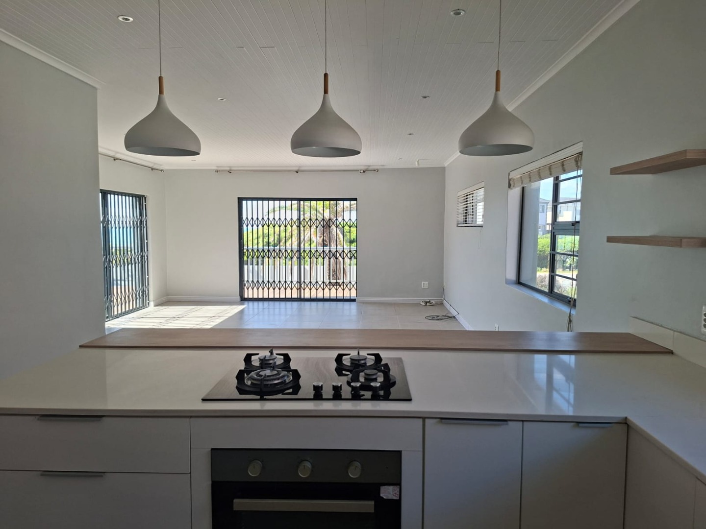 The well-lit kitchen is both stylish and functional, featuring a gas stove and elegant white stone countertops, offering a clean, timeless finish that complements the home’s coastal feel.