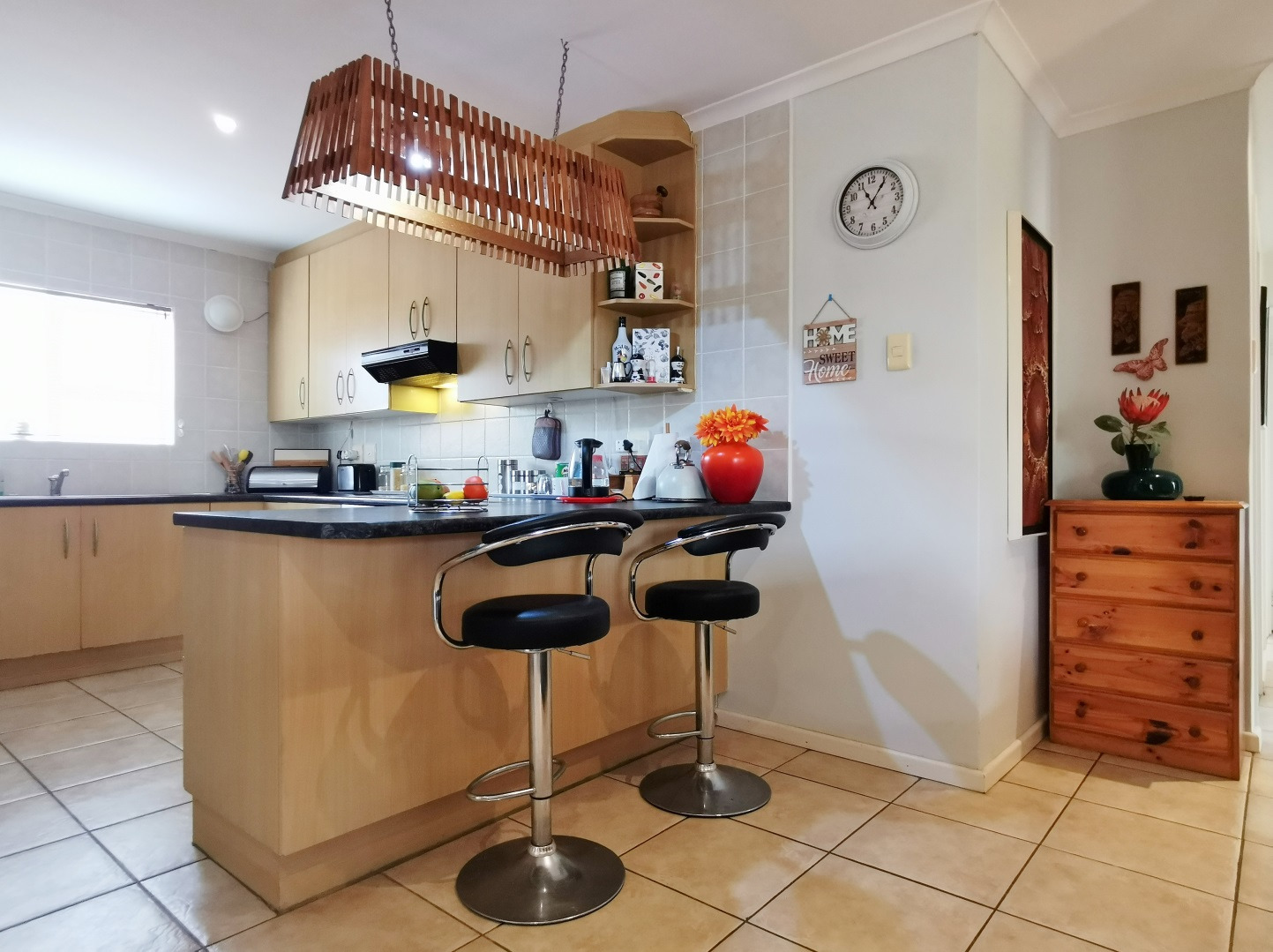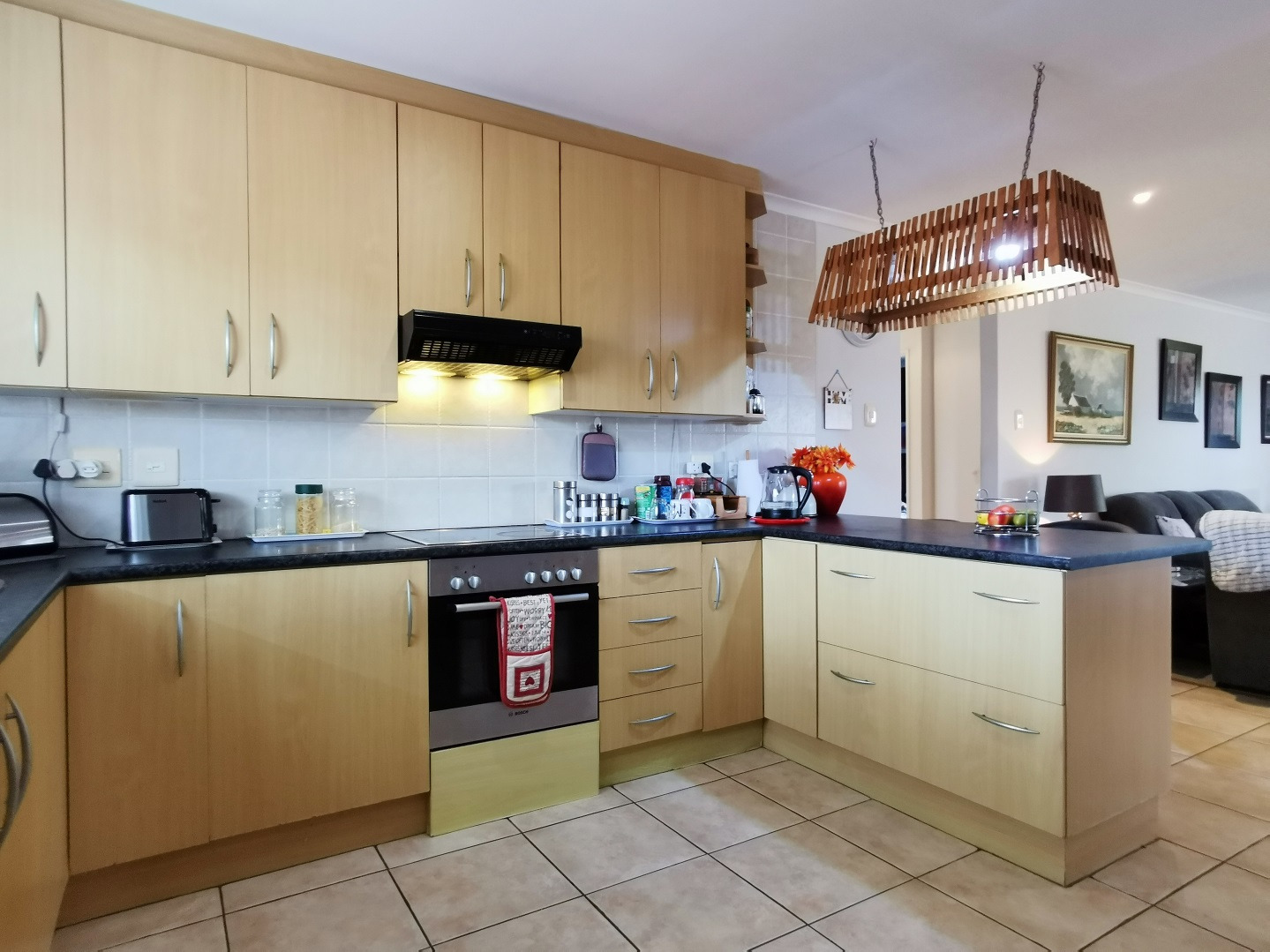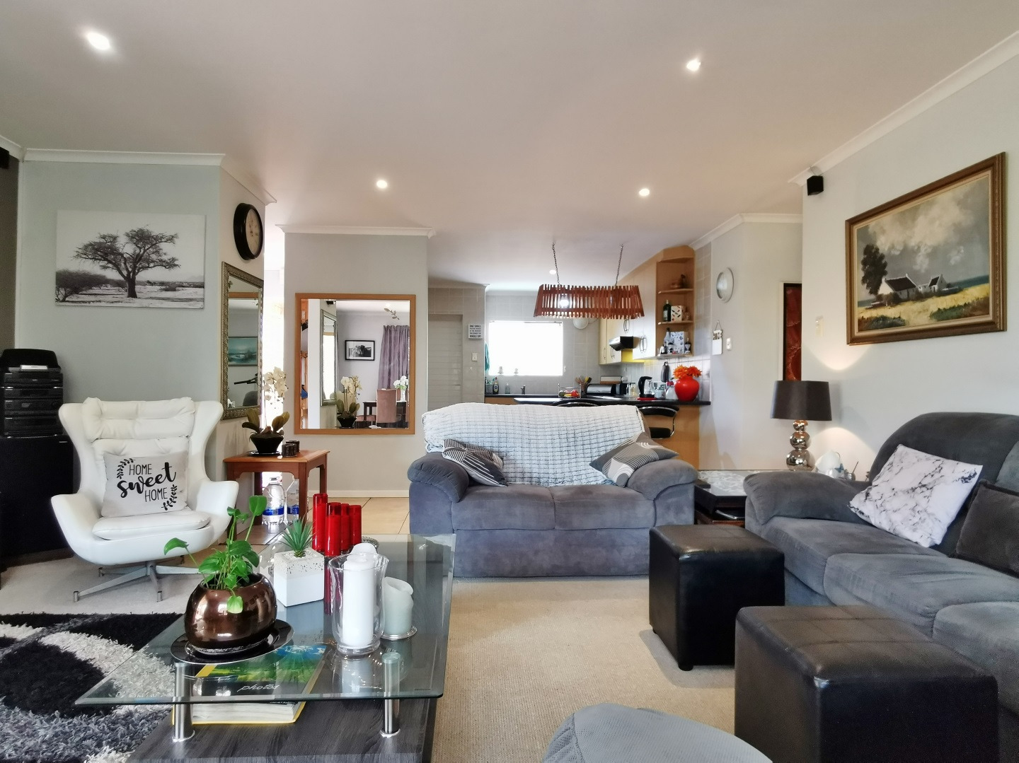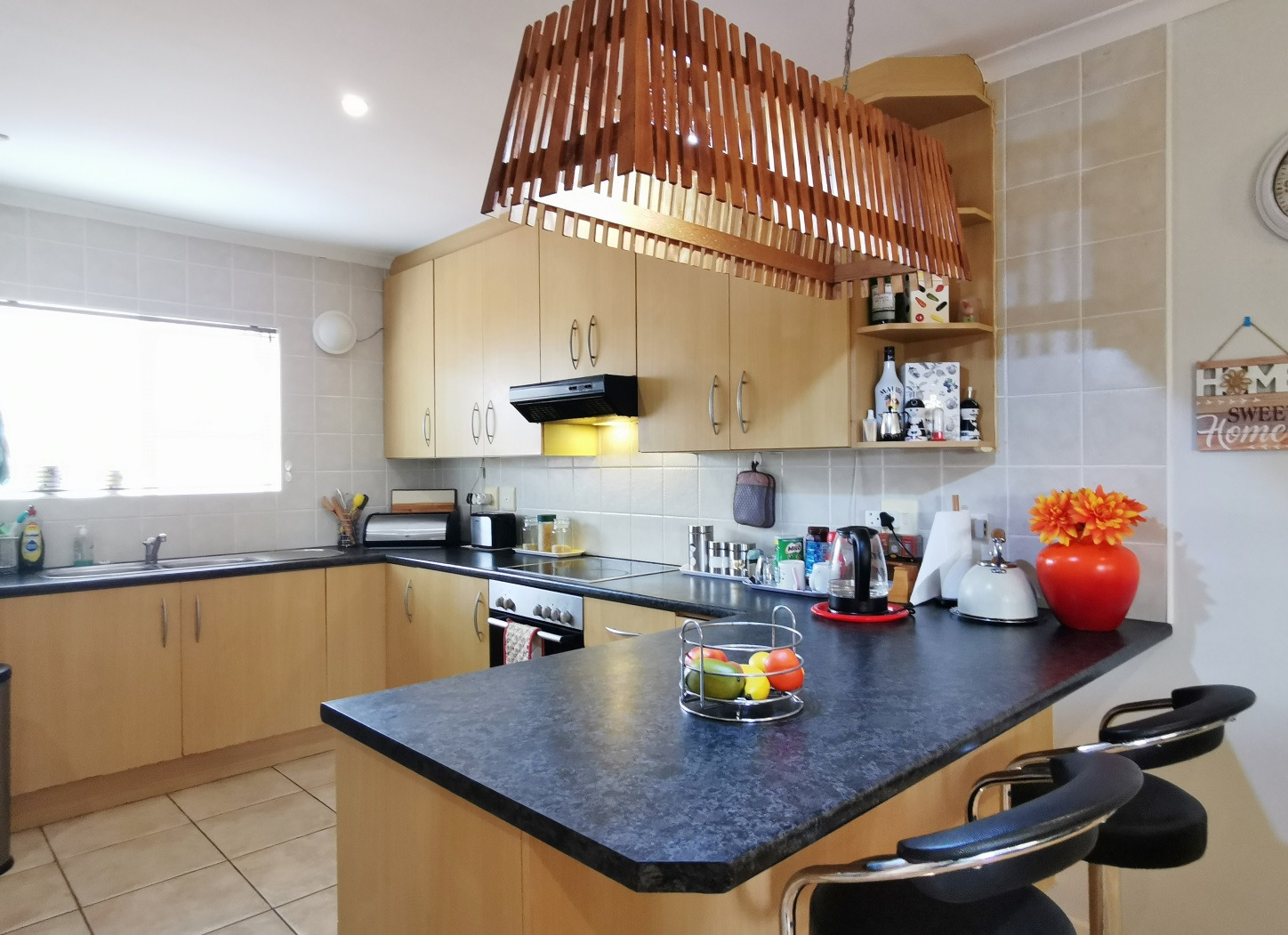 This well-maintained sectional title home offers comfortable living in a secure and pet-friendly complex. It features three bedrooms and two bathrooms, including a main en suite with a walk-through dressing area and sliding door opening onto a private paved patio in the garden. The kitchen is fitted with a breakfast counter, ceran hob, under-counter oven and is open plan to the carpeted living area, which leads out to a covered tiled patio with a built-in braai and an enclosed garden – ideal for entertaining.