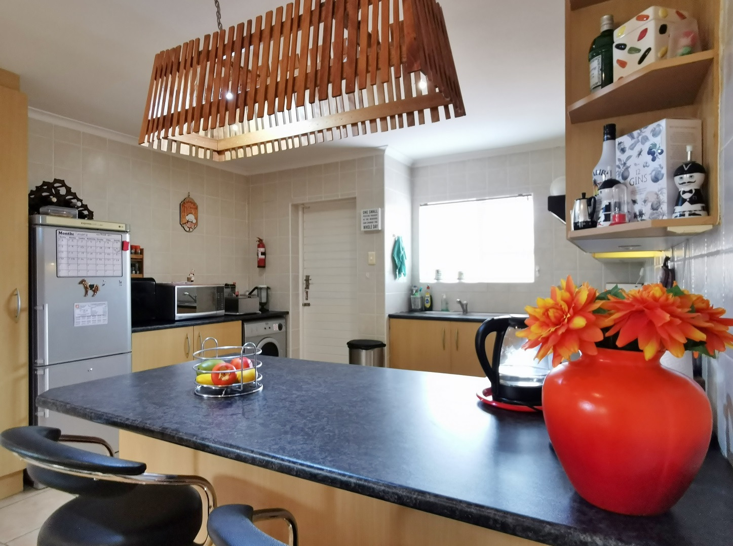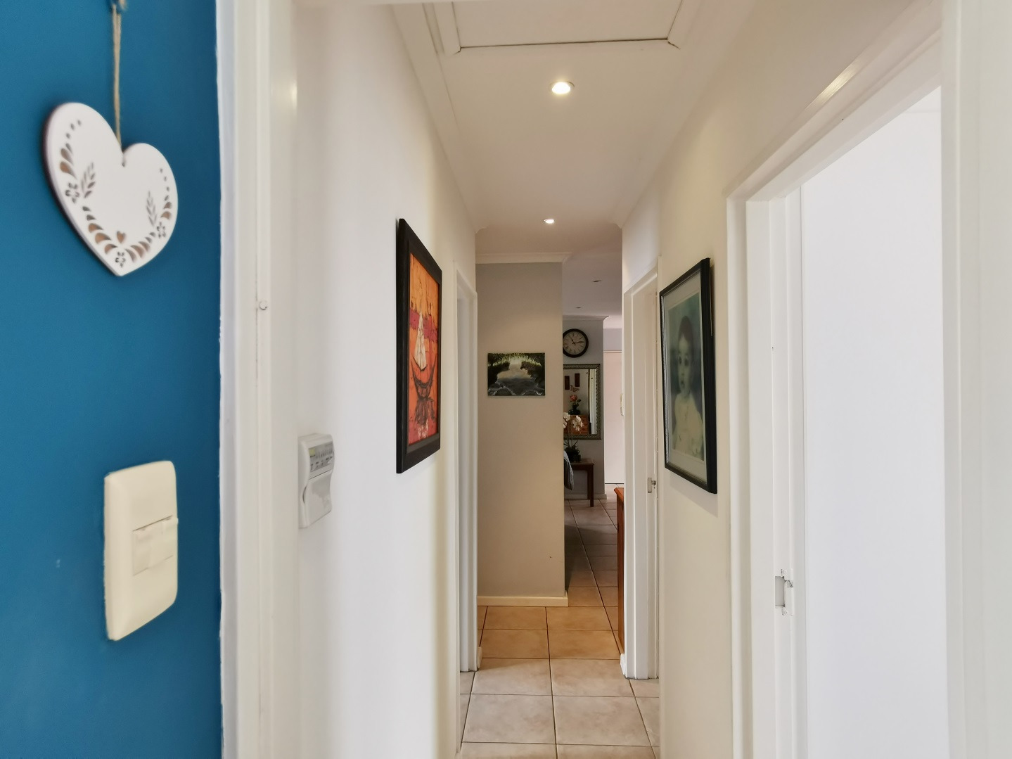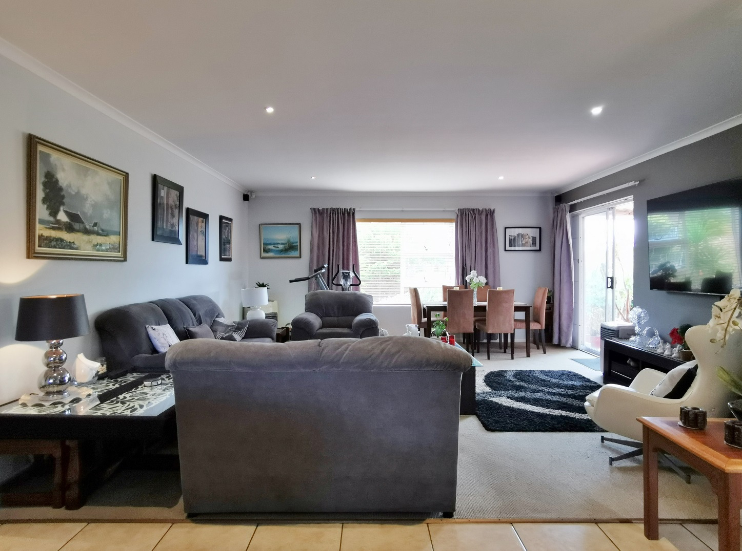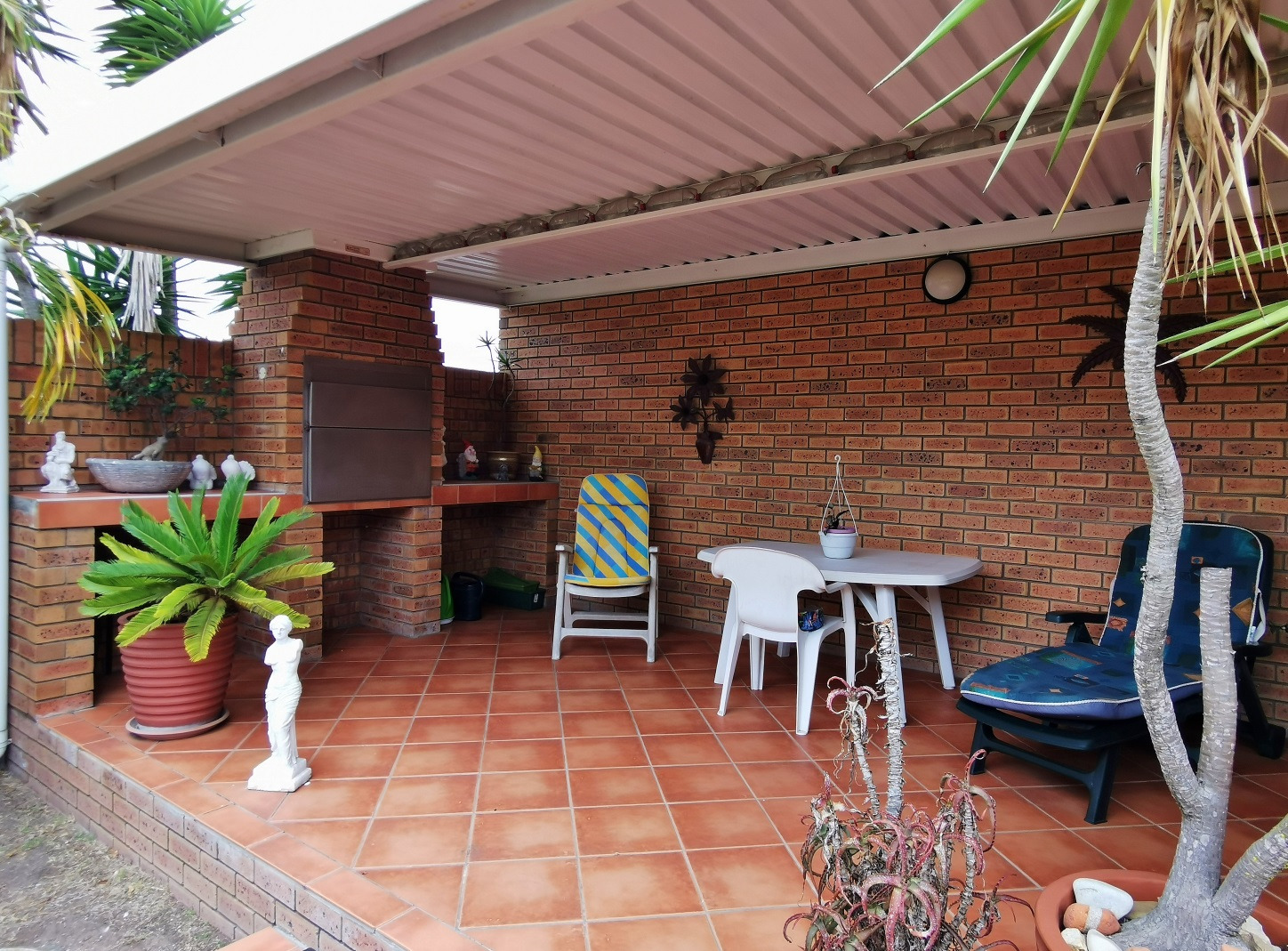This well-maintained sectional title home offers comfortable living in a secure and pet-friendly complex. It features three bedrooms and two bathrooms, including a main en suite with a walk-through dressing area and sliding door opening onto a private paved patio in the garden. The kitchen is fitted with a breakfast counter, ceran hob, under-counter oven and is open plan to the carpeted living area, which leads out to a covered tiled patio with a built-in braai and an enclosed garden – ideal for entertaining.