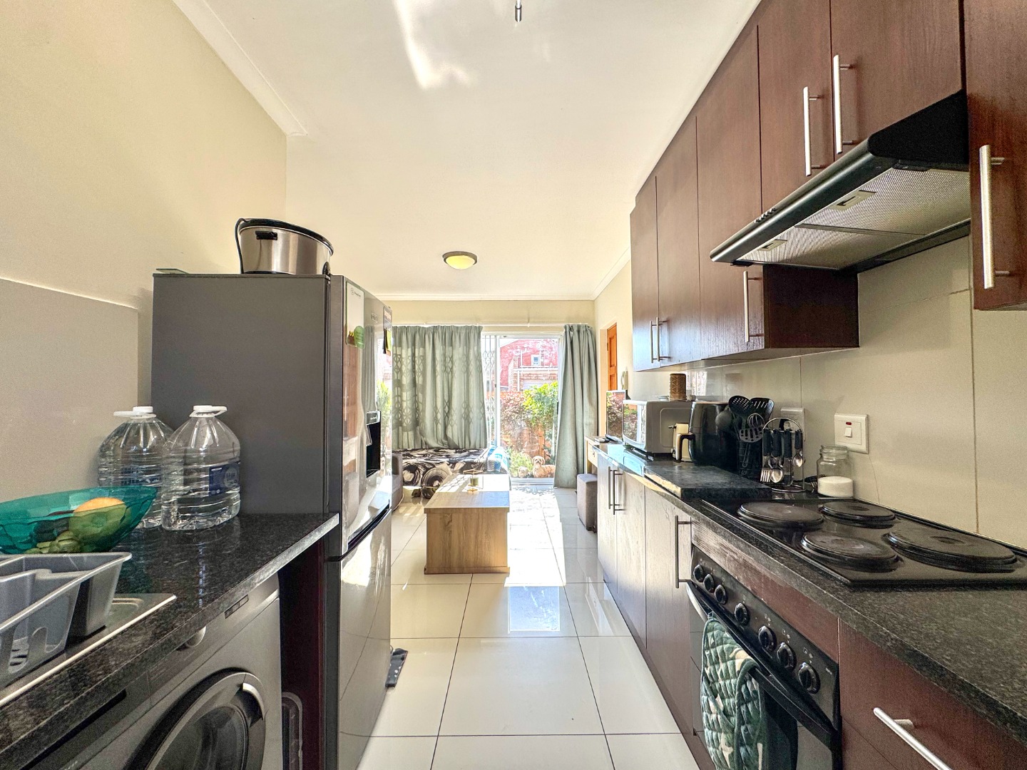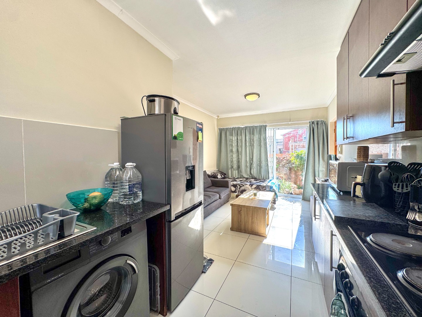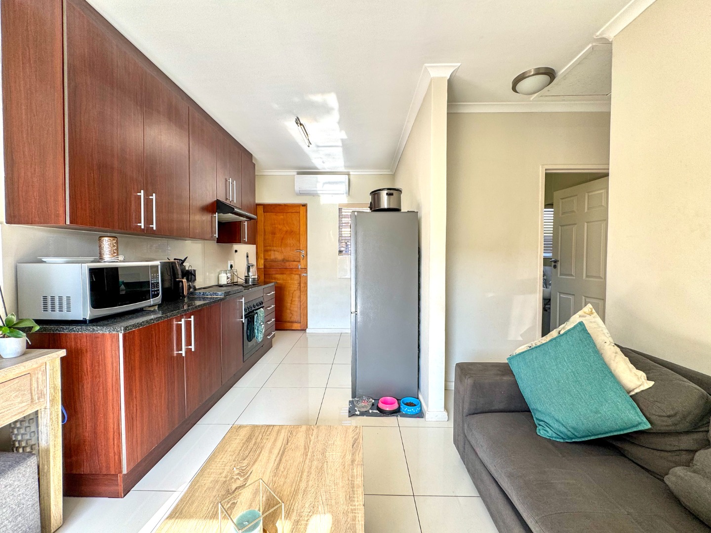 An open-plan living area flowing into a neat kitchen