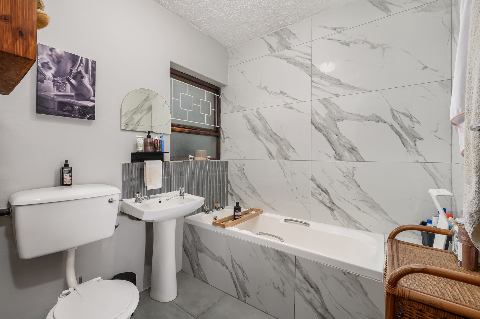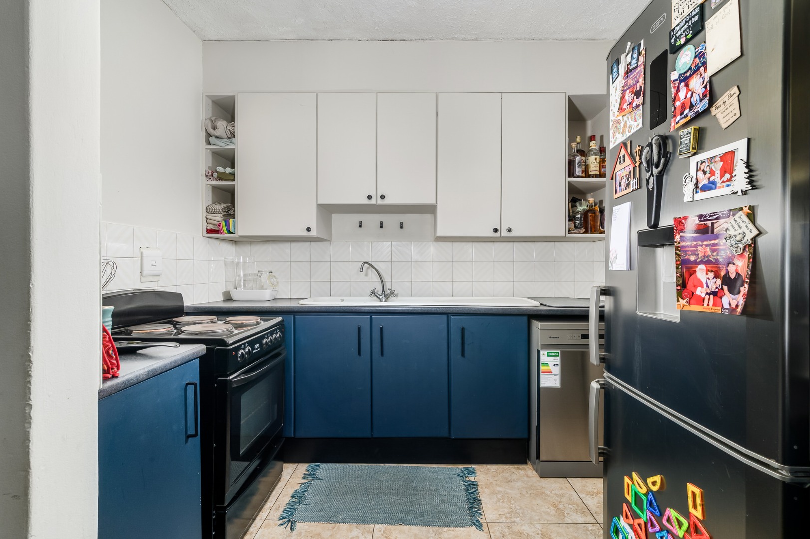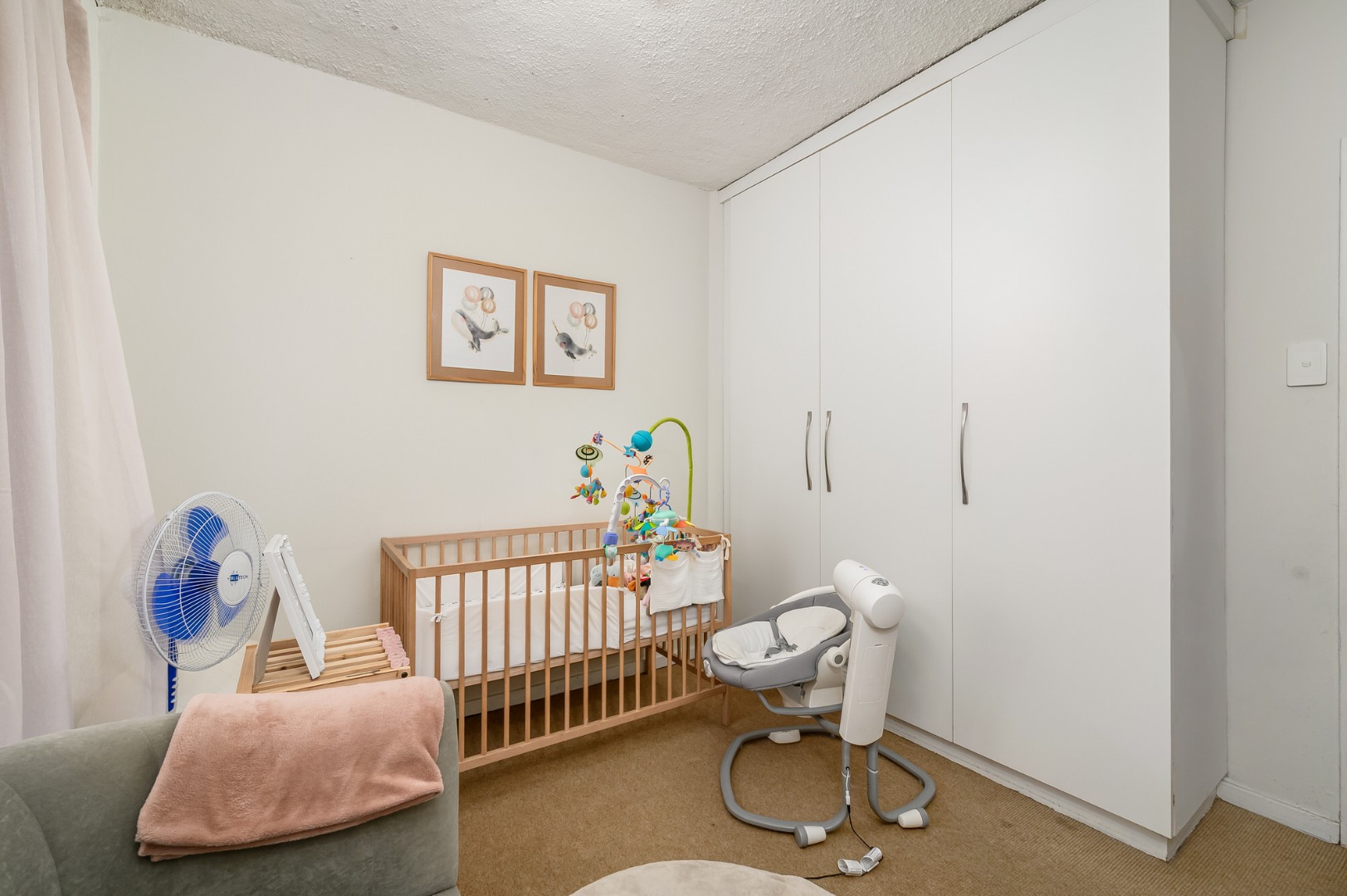 The open plan kitchen offers ample built-in cupboards, a freestanding stove, and water connections. A separate storage room leads off the kitchen and also accommodates water connections for a washing machine. Living areas, bathrooms, and the kitchen are neatly tiled, while the bedrooms feature comfortable carpeted flooring. All bedrooms include built-in cupboards, with the main bedroom enjoying the convenience of an en-suite bathroom.