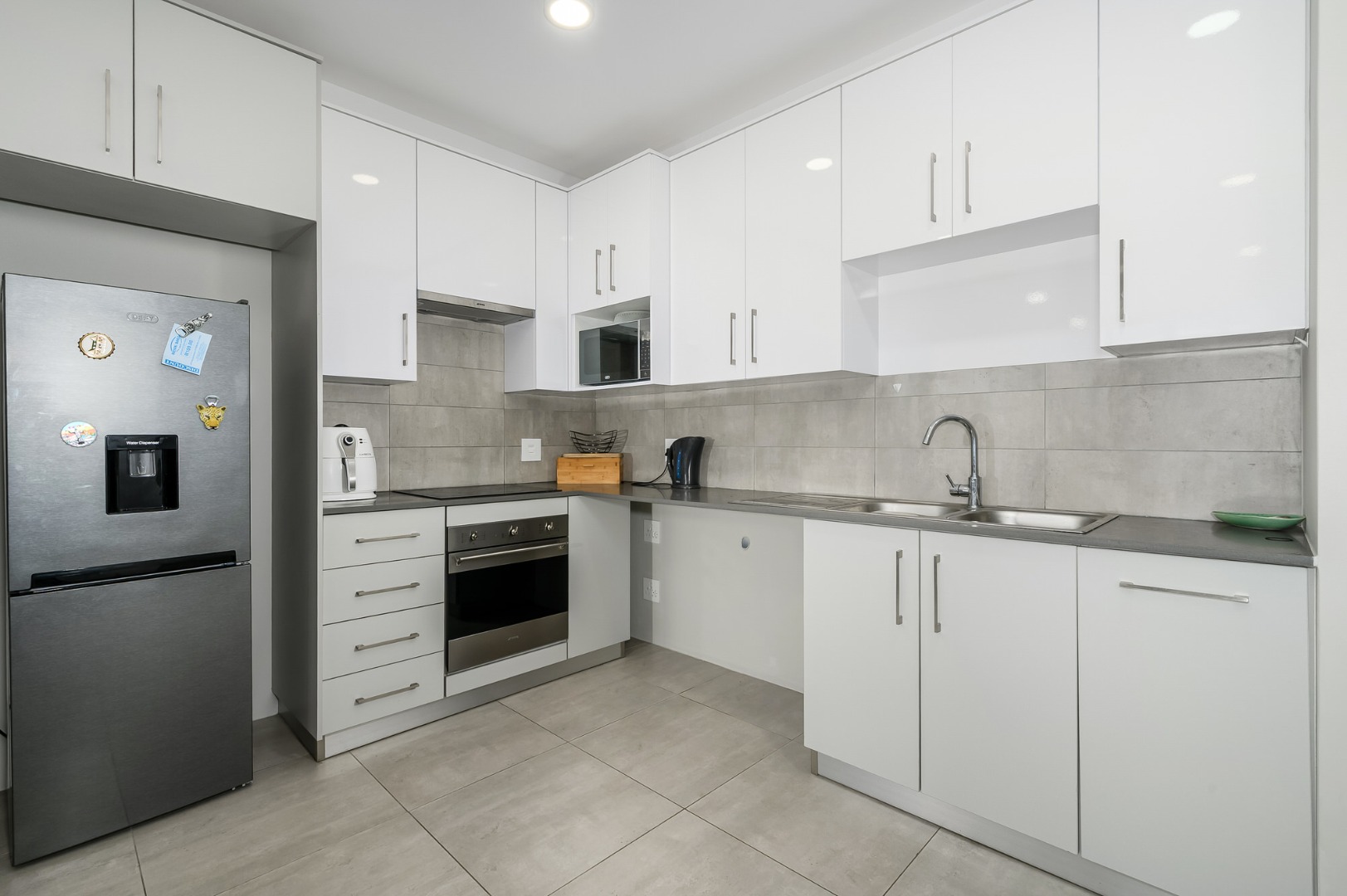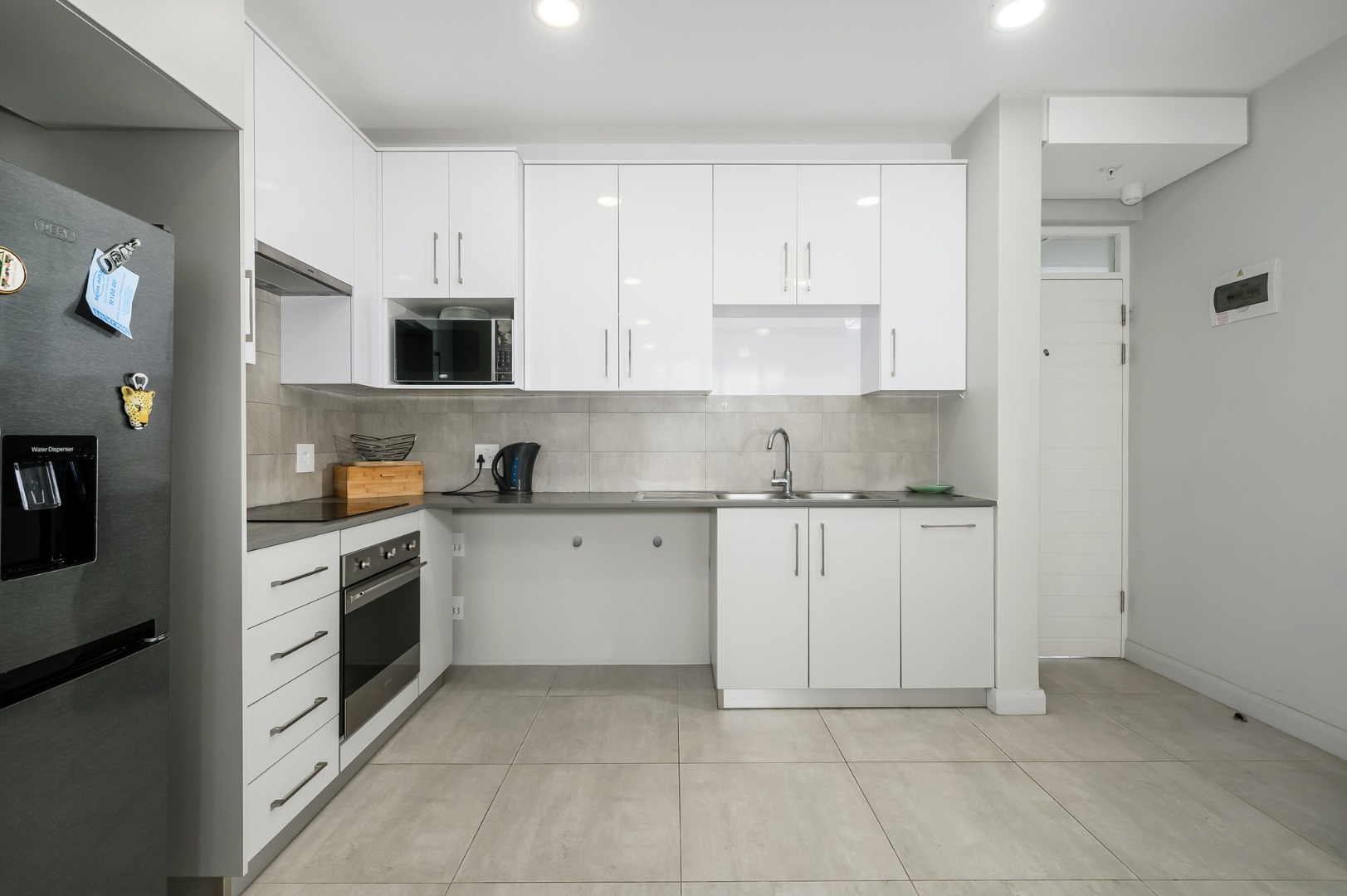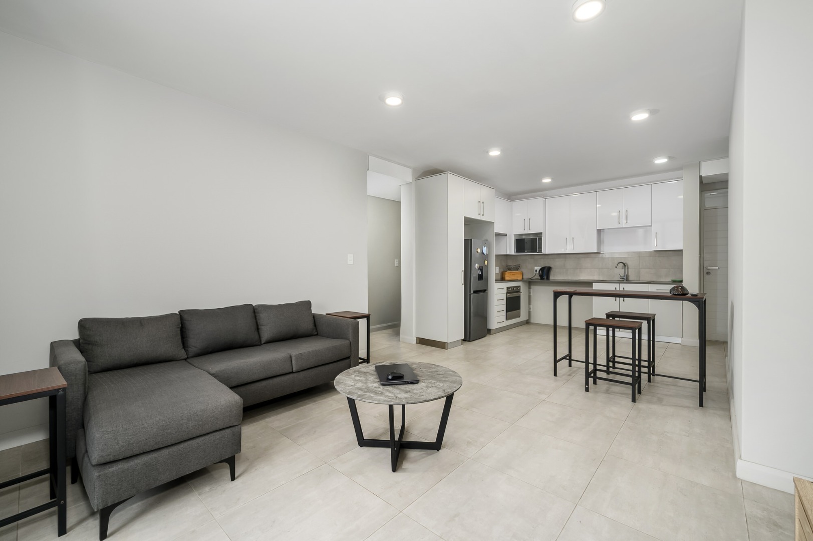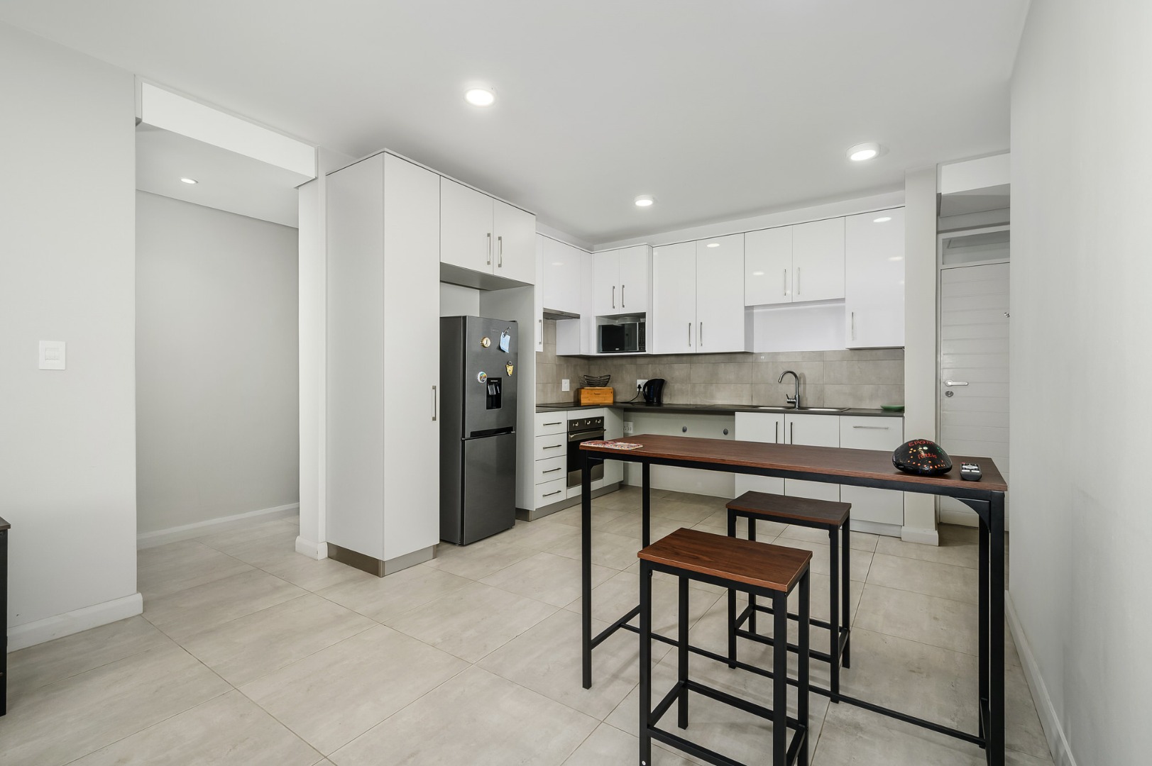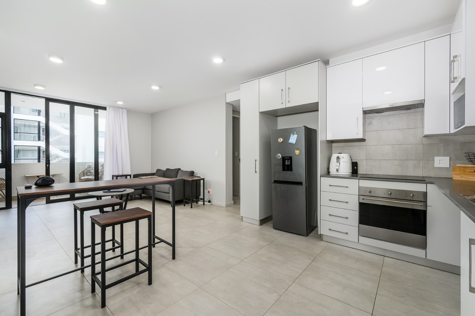 Spanning 87.00 sqm, the interior presents an inviting open-plan layout, seamlessly connecting the living areas with a well-appointed kitchen. The kitchen is a highlight, featuring sleek white cabinetry, integrated stainless steel appliances, and durable tiled flooring, perfect for both everyday meals and entertaining. Ample natural light floods the space, creating a bright and welcoming atmosphere.