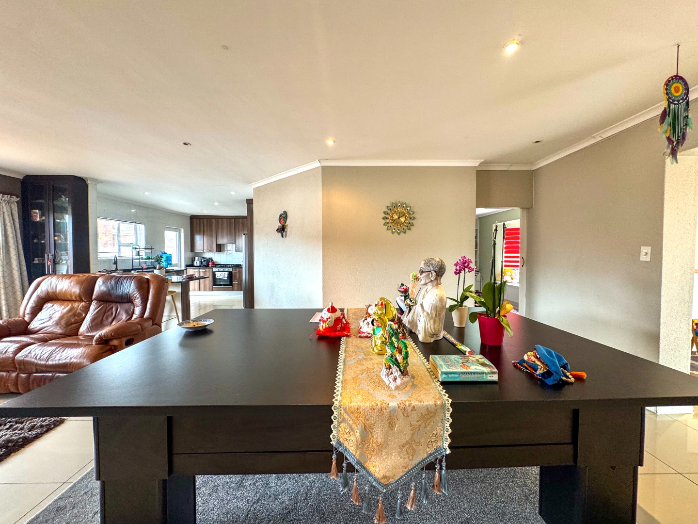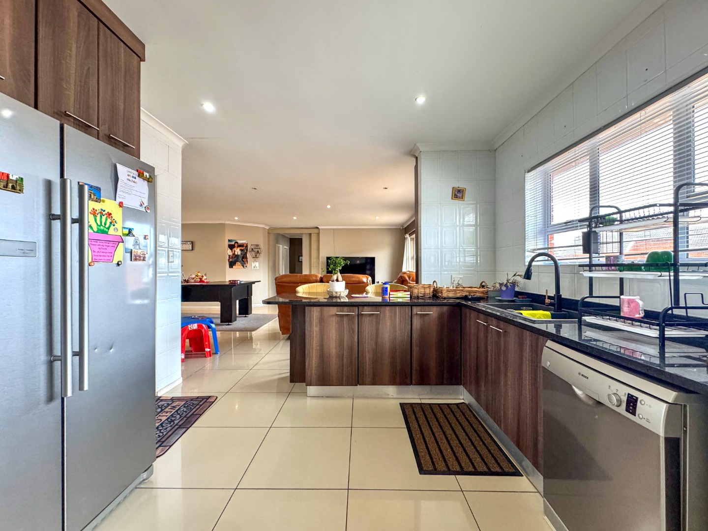 The kitchen flows seamlessly into the spacious lounge, dining area, and reception room, complete with a built-in indoor braai that opens out to the sunny patio — ideal for year-round entertaining. Beautiful porcelain tiles add a sleek and polished touch throughout the living spaces.