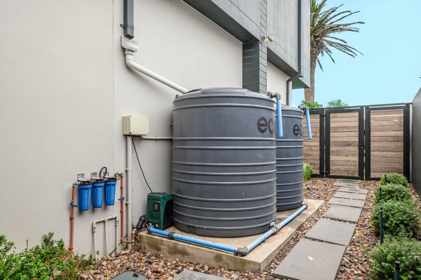 Additional features include a private study, a self-contained one-bedroom flat, six garages in total, a carport, electric fencing, a solar power system, and a rainwater harvesting system — all designed with sustainability and security in mind.