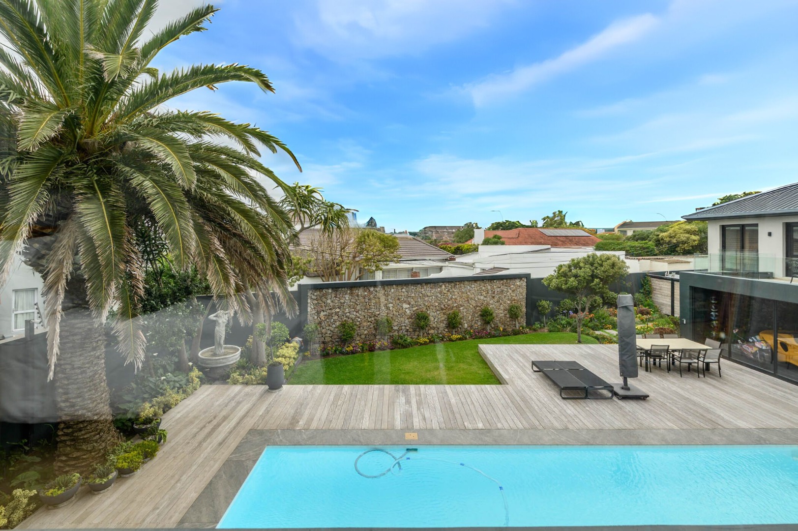 The home offers spacious open-plan living areas, including a formal lounge with a fireplace and an inviting dining room that flows effortlessly into a gourmet kitchen with a separate scullery. The entertainment area opens to a sparkling swimming pool and boasts captivating sea views — creating the ultimate setting for relaxed coastal living and sophisticated entertaining.