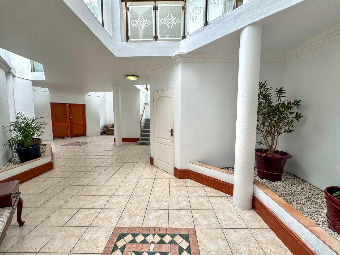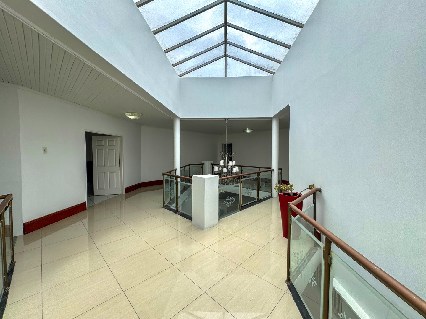 Accommodation comprises six generously sized bedrooms and five bathrooms, including two luxurious en-suite facilities, ensuring privacy and convenience for all occupants. A dedicated study offers a quiet space for work or contemplation, while a guest toilet adds to the home's practical layout. The property also includes staff quarters, providing additional utility.