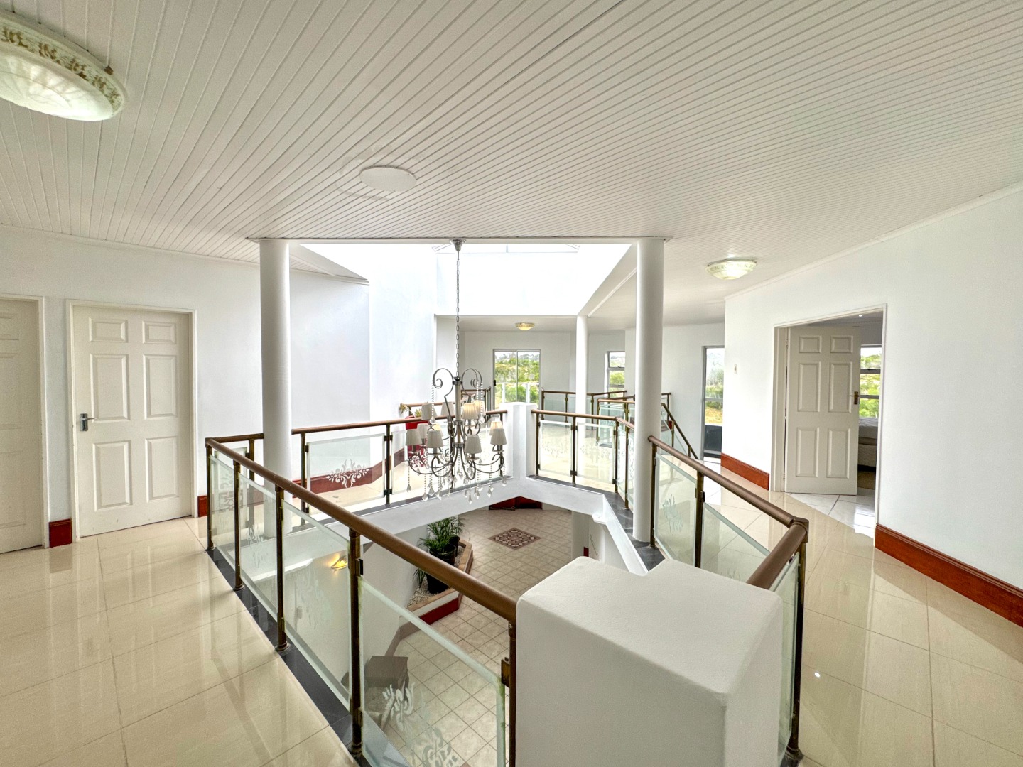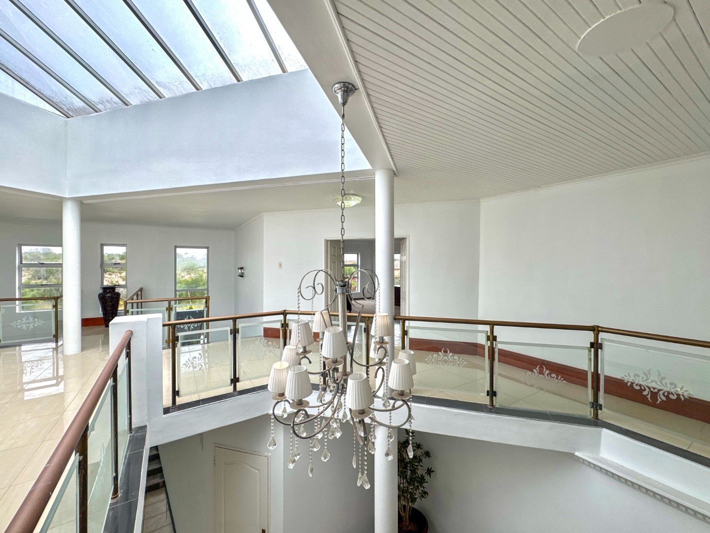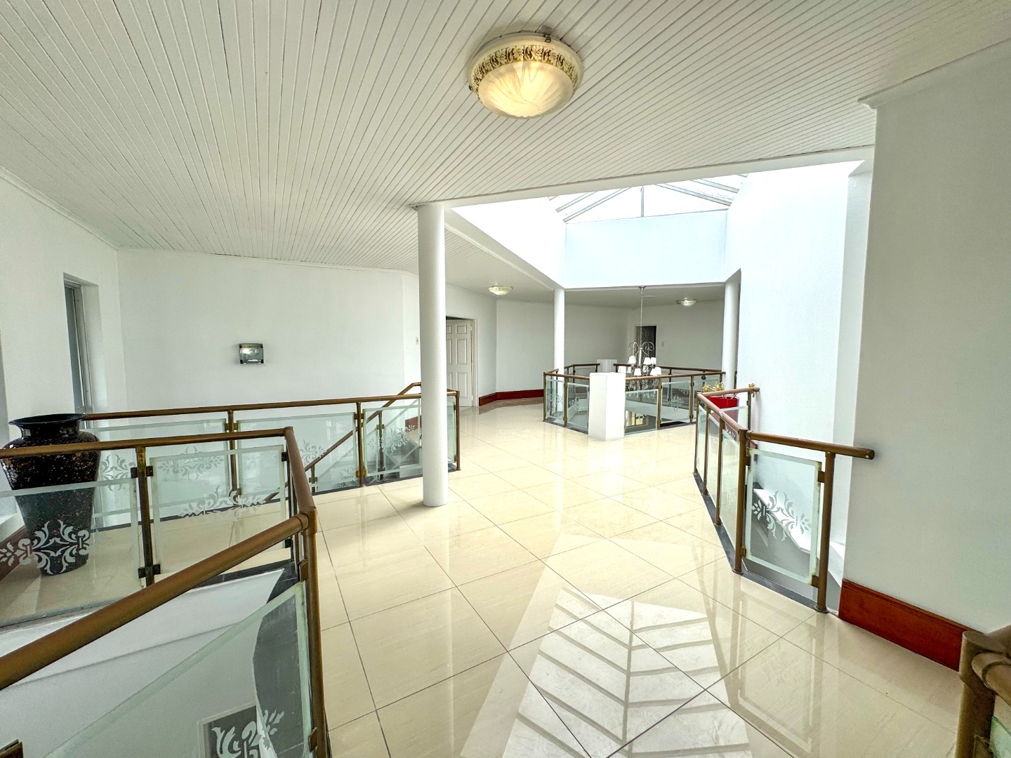 Accommodation comprises six generously sized bedrooms and five bathrooms, including two luxurious en-suite facilities, ensuring privacy and convenience for all occupants. A dedicated study offers a quiet space for work or contemplation, while a guest toilet adds to the home's practical layout. The property also includes staff quarters, providing additional utility.
