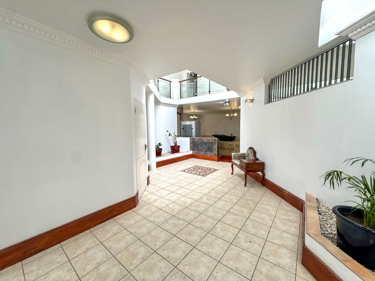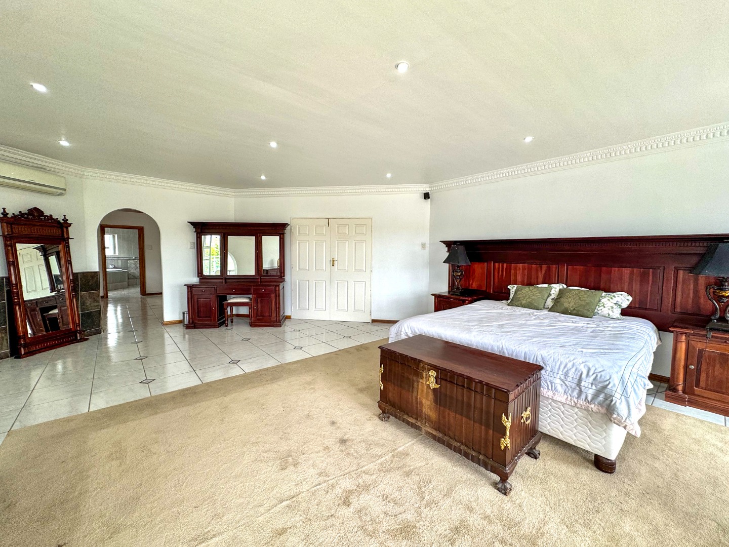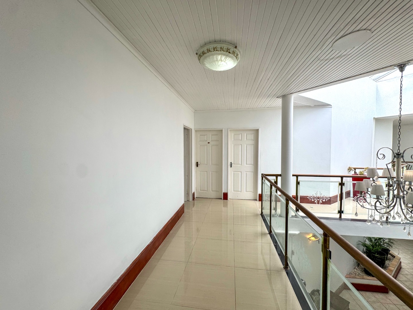 Accommodation comprises six generously sized bedrooms and five bathrooms, including two luxurious en-suite facilities, ensuring privacy and convenience for all occupants. A dedicated study offers a quiet space for work or contemplation, while a guest toilet adds to the home's practical layout. The property also includes staff quarters, providing additional utility.