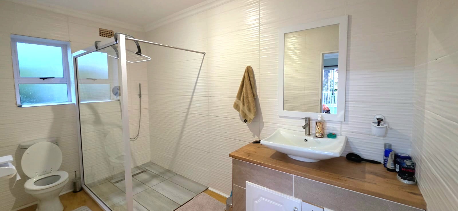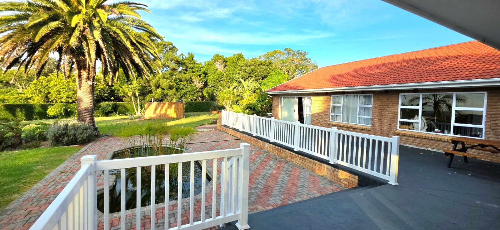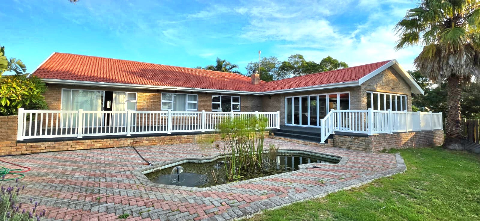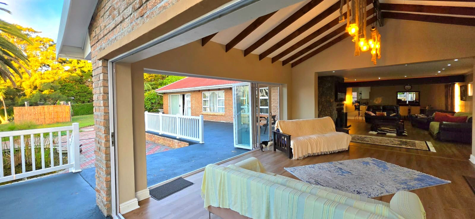 The main residence, beautifully renovated, features 4 well-sized bedrooms, 3 bathrooms (including 2 en-suites), and a seamless flow between the open-plan kitchen, dining area, and spacious lounge with fireplace. Stacker doors lead to a covered braai patio and veranda, creating effortless indoor-outdoor living.