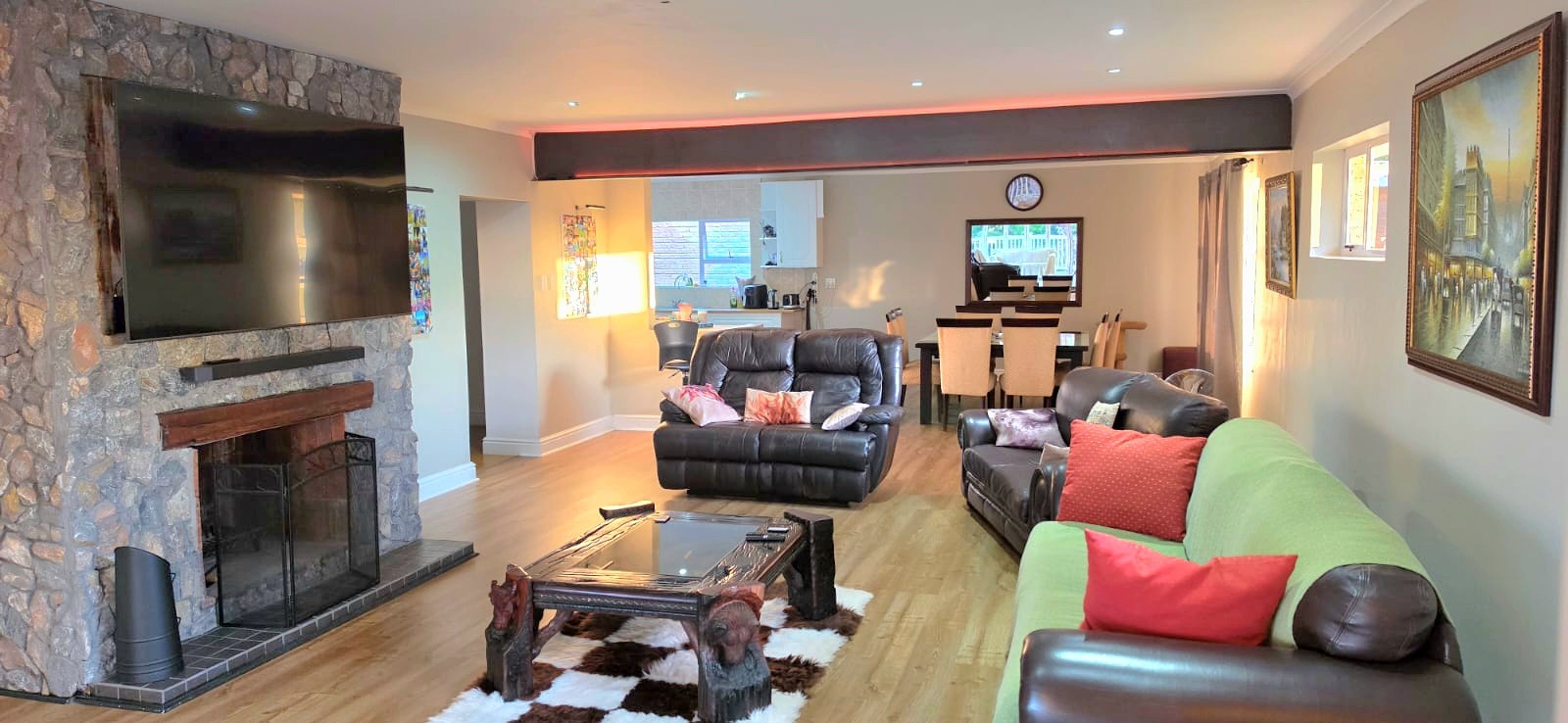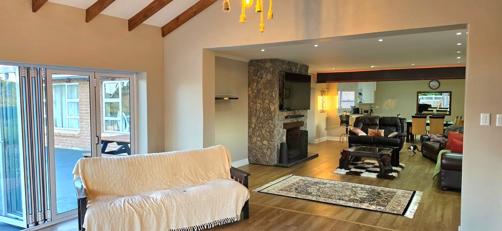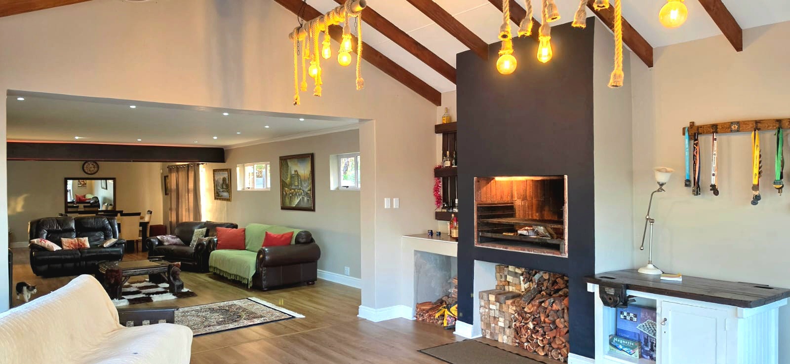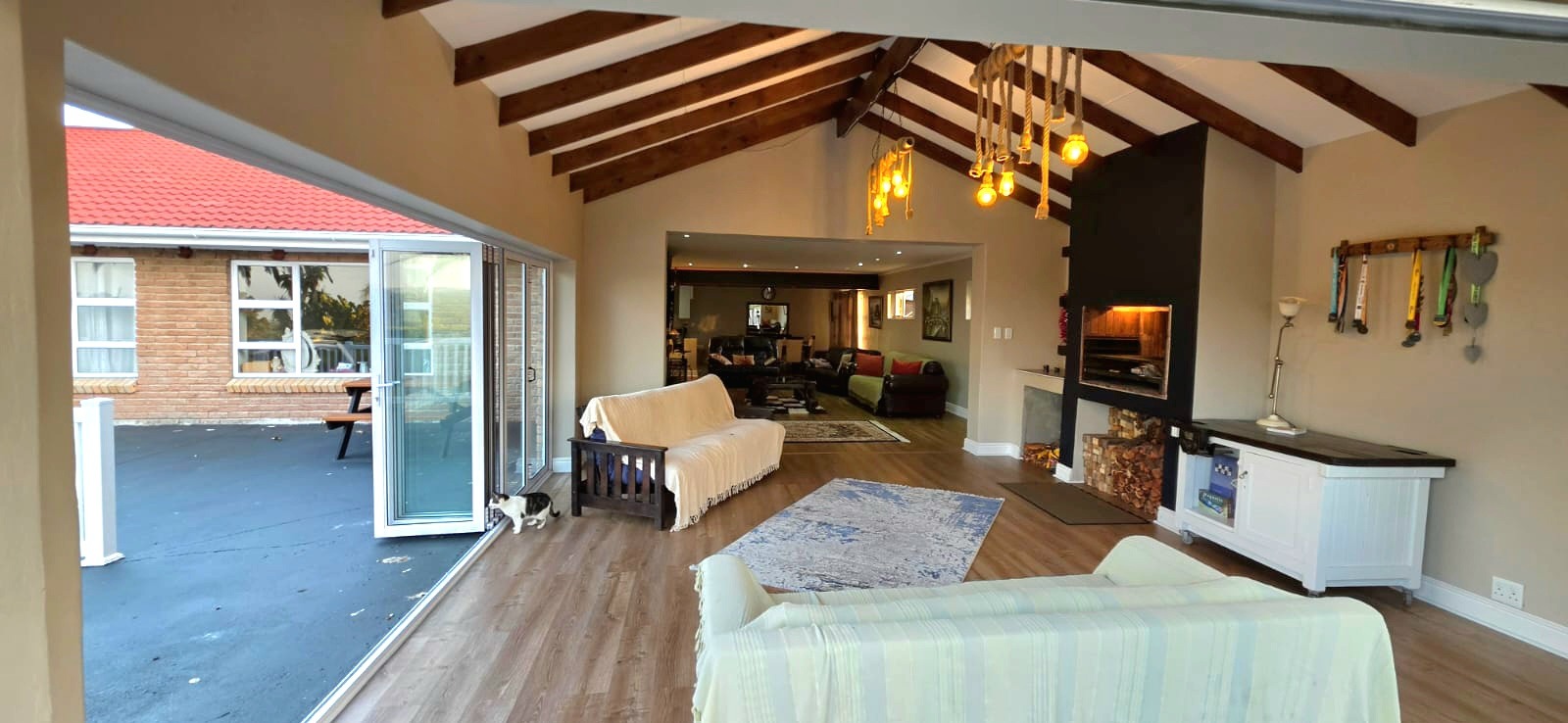 The main residence, beautifully renovated, features 4 well-sized bedrooms, 3 bathrooms (including 2 en-suites), and a seamless flow between the open-plan kitchen, dining area, and spacious lounge with fireplace. Stacker doors lead to a covered braai patio and veranda, creating effortless indoor-outdoor living.