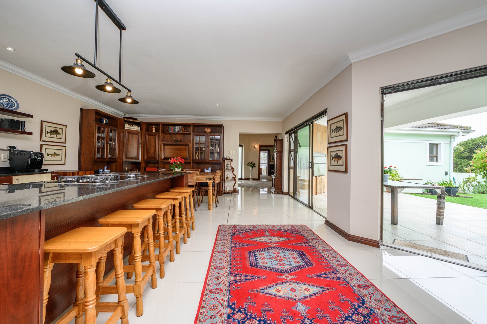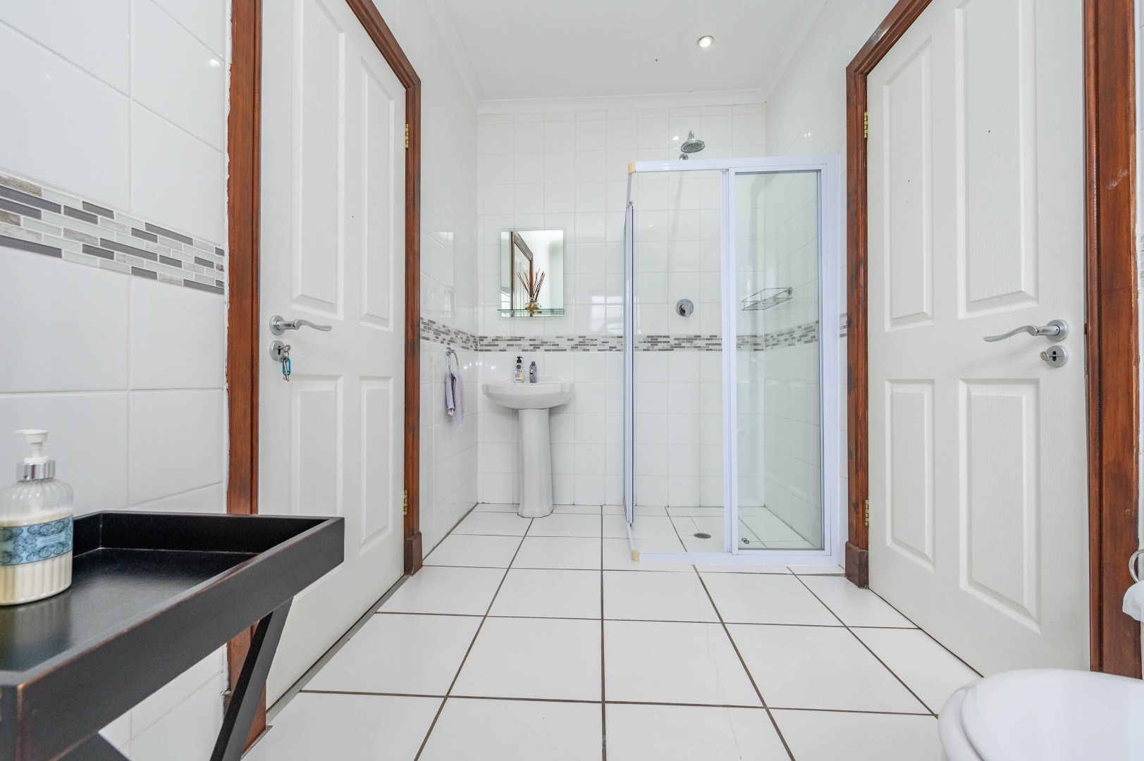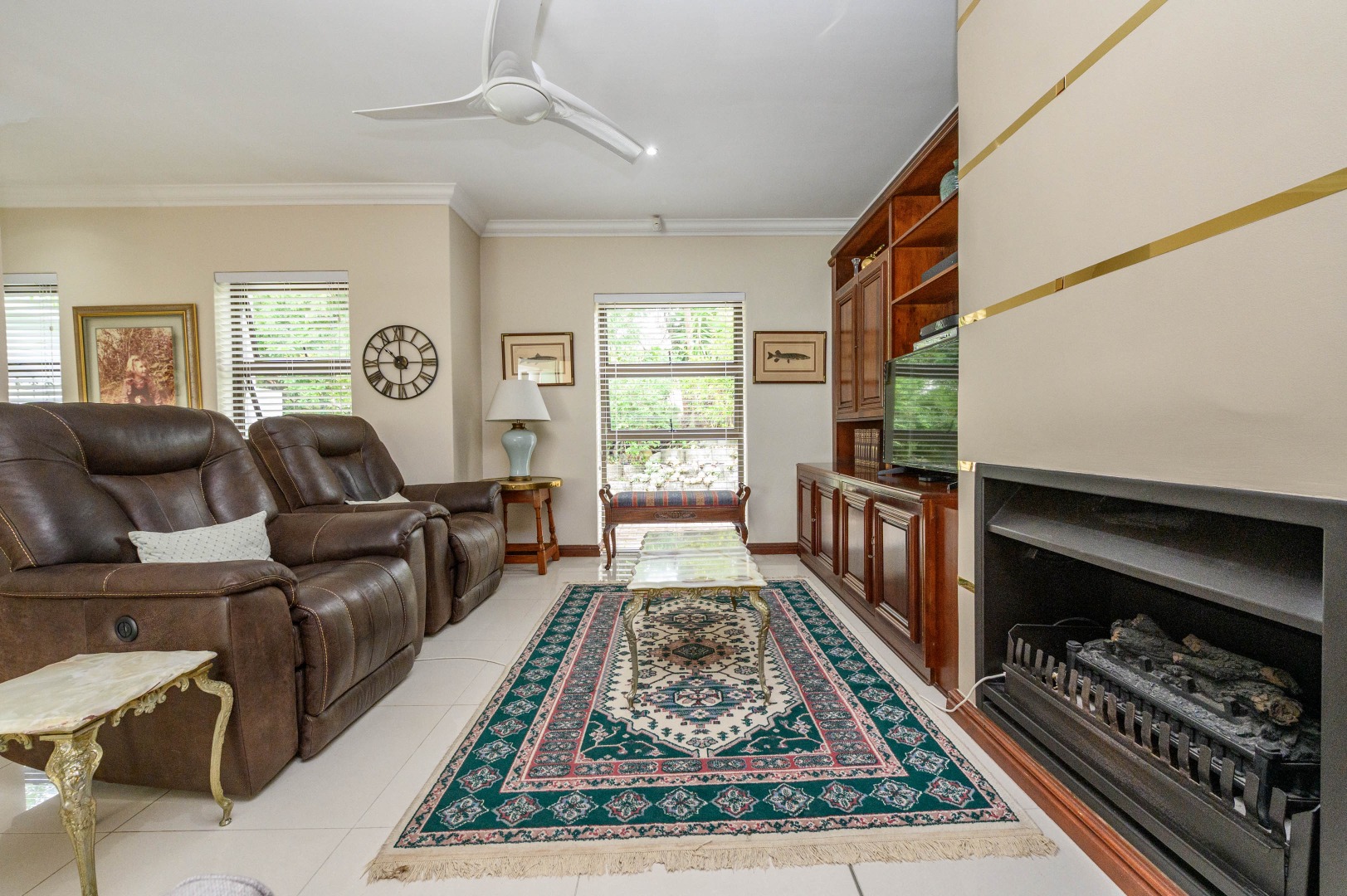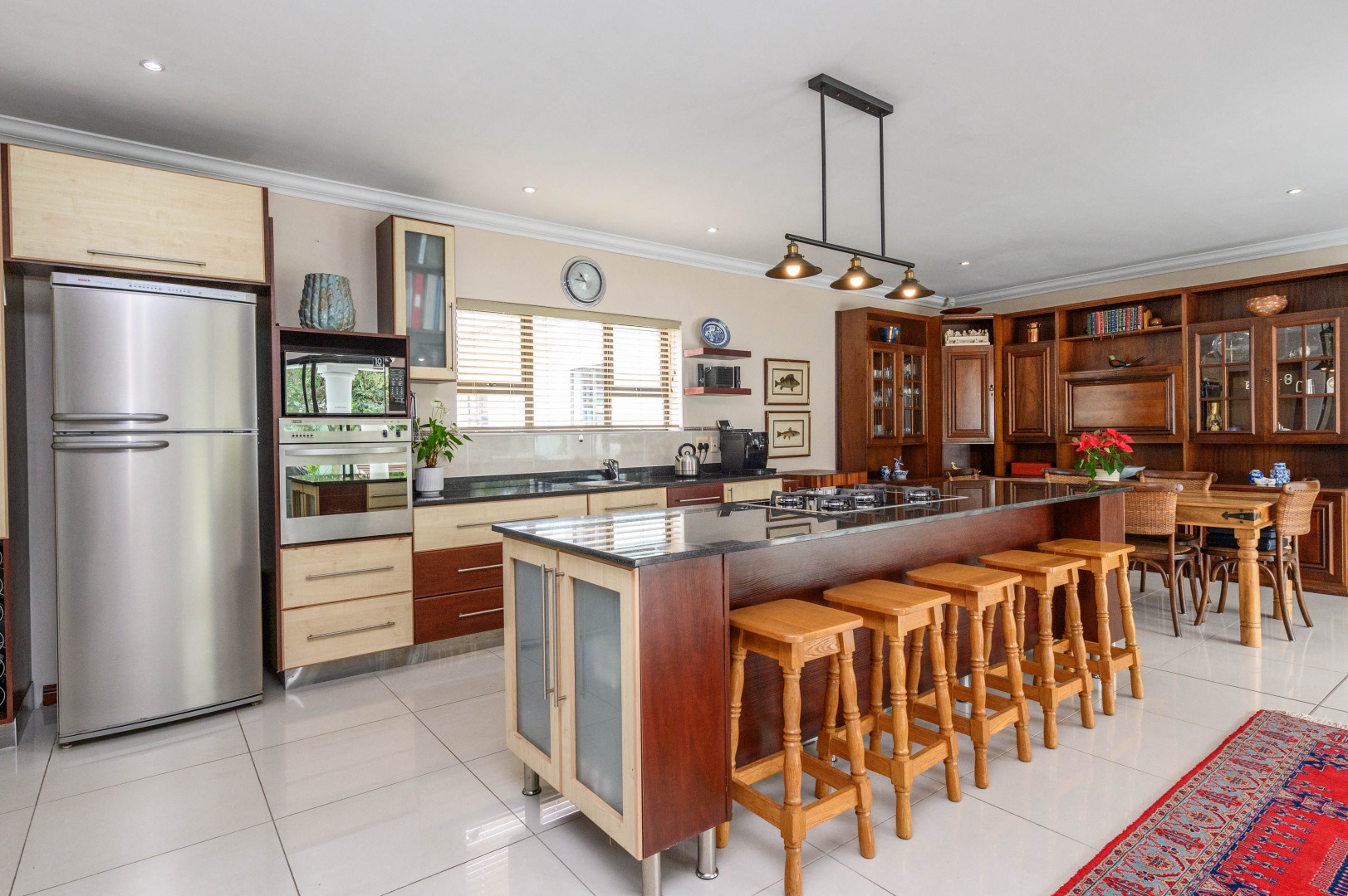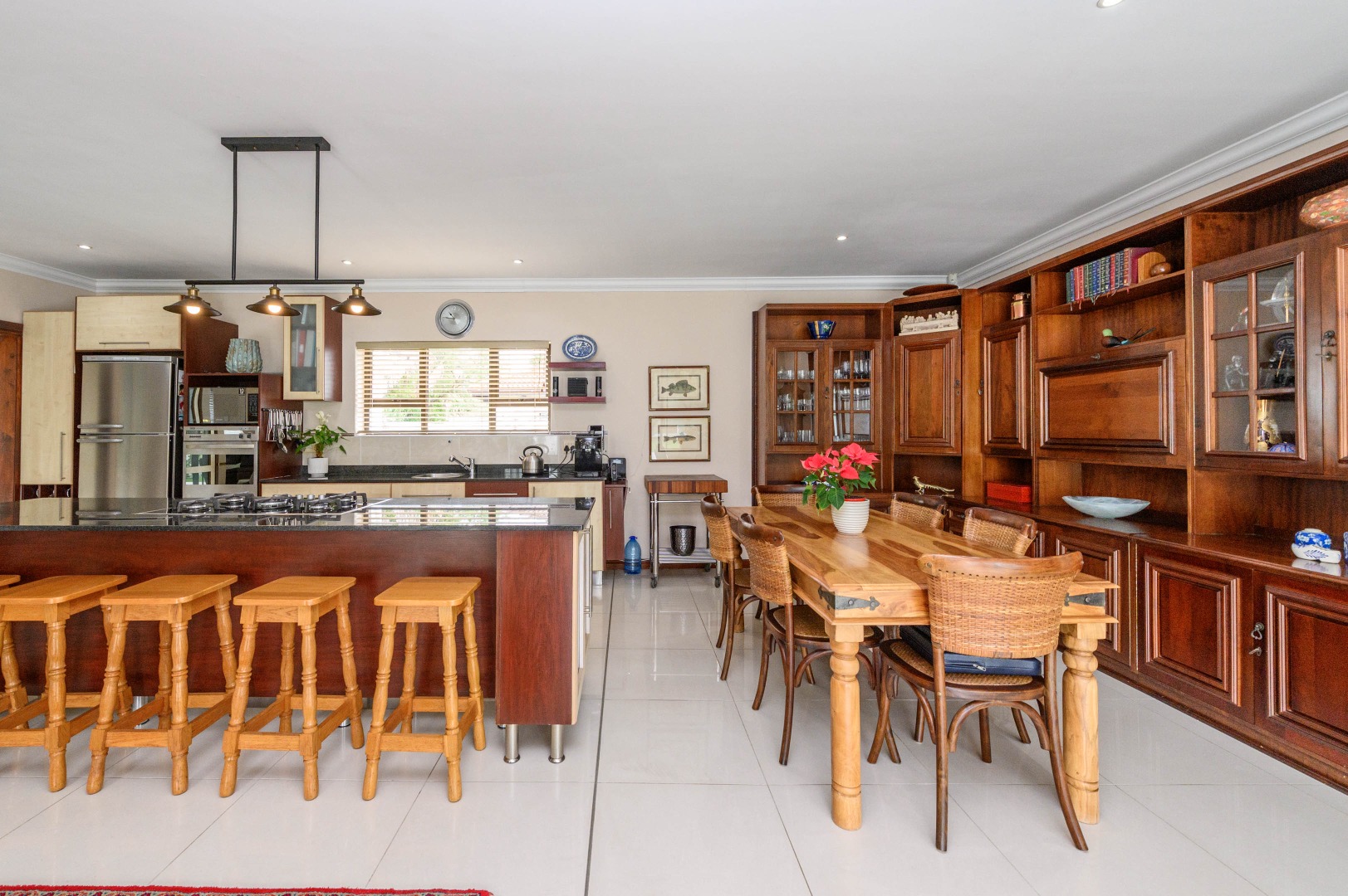 At the heart of the home lies a magnificent open-plan kitchen designed for both functionality and flair. Featuring a gas hob, abundant cabinetry, generous counter space, and a separate scullery, this culinary space flows seamlessly into the TV lounge and dining area. Large openings extend the living space onto a covered patio with a built-in braai — perfect for effortless indoor-outdoor entertaining.