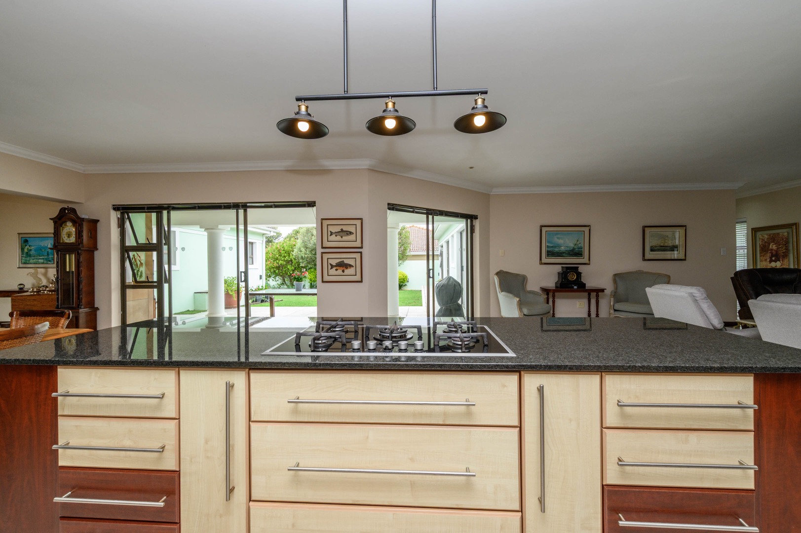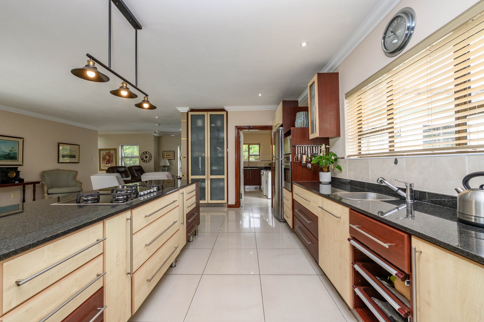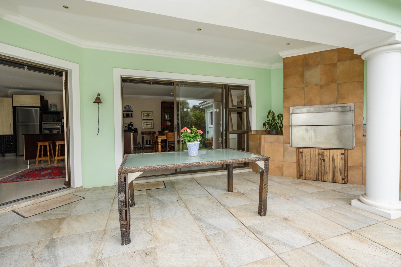 At the heart of the home lies a magnificent open-plan kitchen designed for both functionality and flair. Featuring a gas hob, abundant cabinetry, generous counter space, and a separate scullery, this culinary space flows seamlessly into the TV lounge and dining area. Large openings extend the living space onto a covered patio with a built-in braai — perfect for effortless indoor-outdoor entertaining.