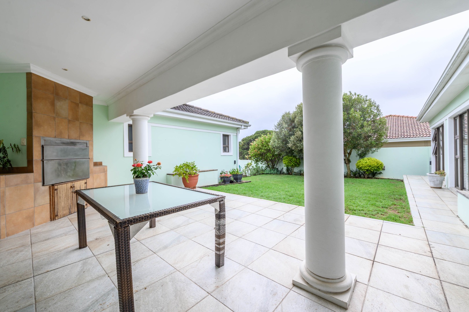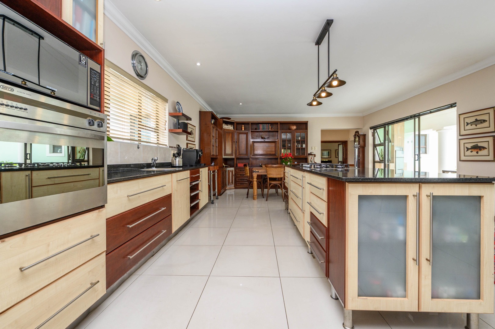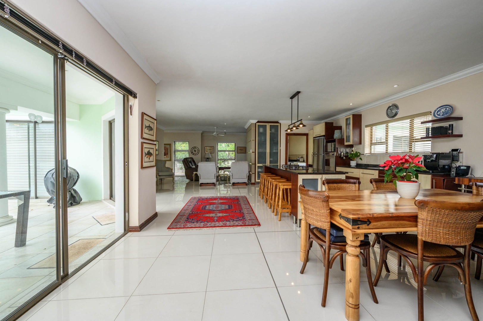 At the heart of the home lies a magnificent open-plan kitchen designed for both functionality and flair. Featuring a gas hob, abundant cabinetry, generous counter space, and a separate scullery, this culinary space flows seamlessly into the TV lounge and dining area. Large openings extend the living space onto a covered patio with a built-in braai — perfect for effortless indoor-outdoor entertaining.