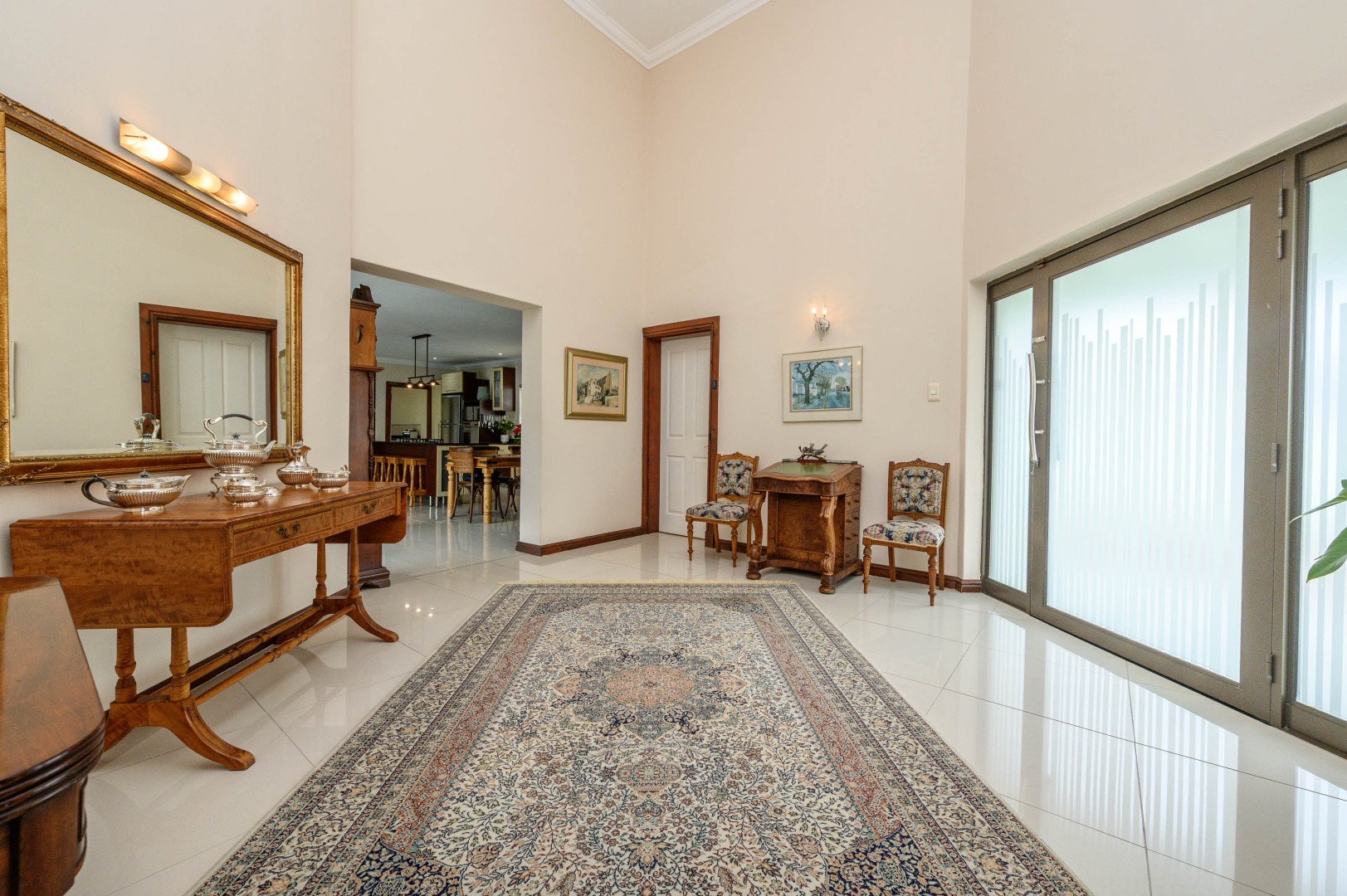 The entrance hall sets the tone, leading into expansive living areas adorned with sophisticated porcelain tiles. The formal lounge, complete with a feature fireplace, offers an intimate setting for refined entertaining, while a separate, generously proportioned study provides the ideal work-from-home sanctuary.