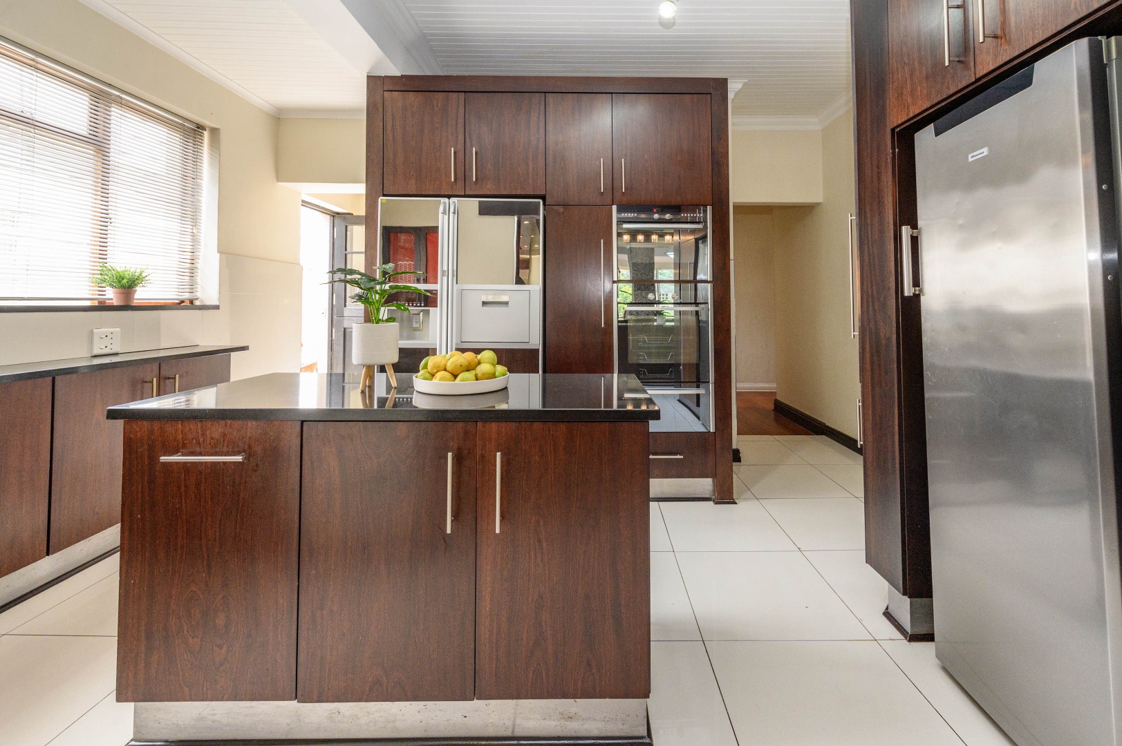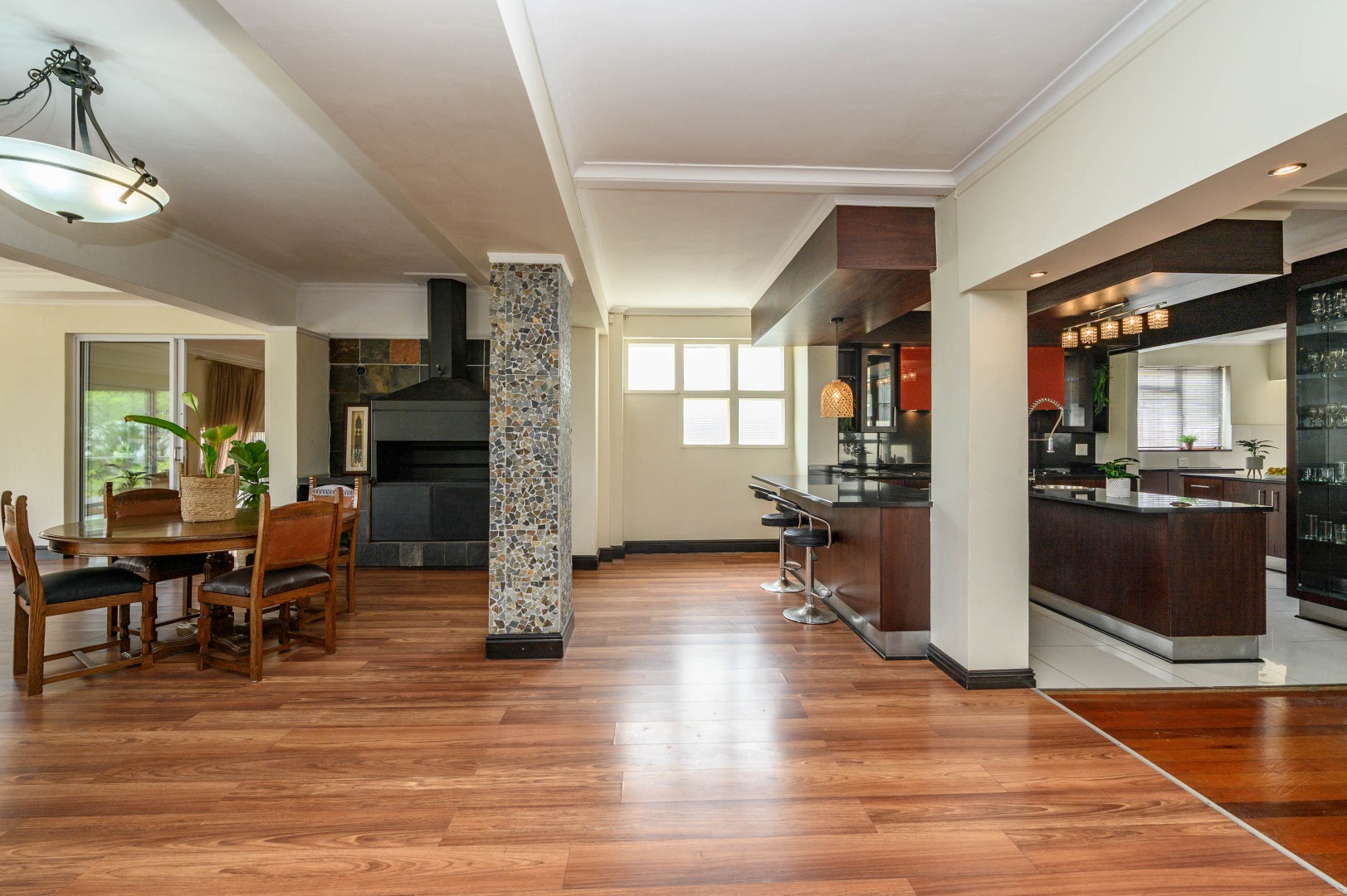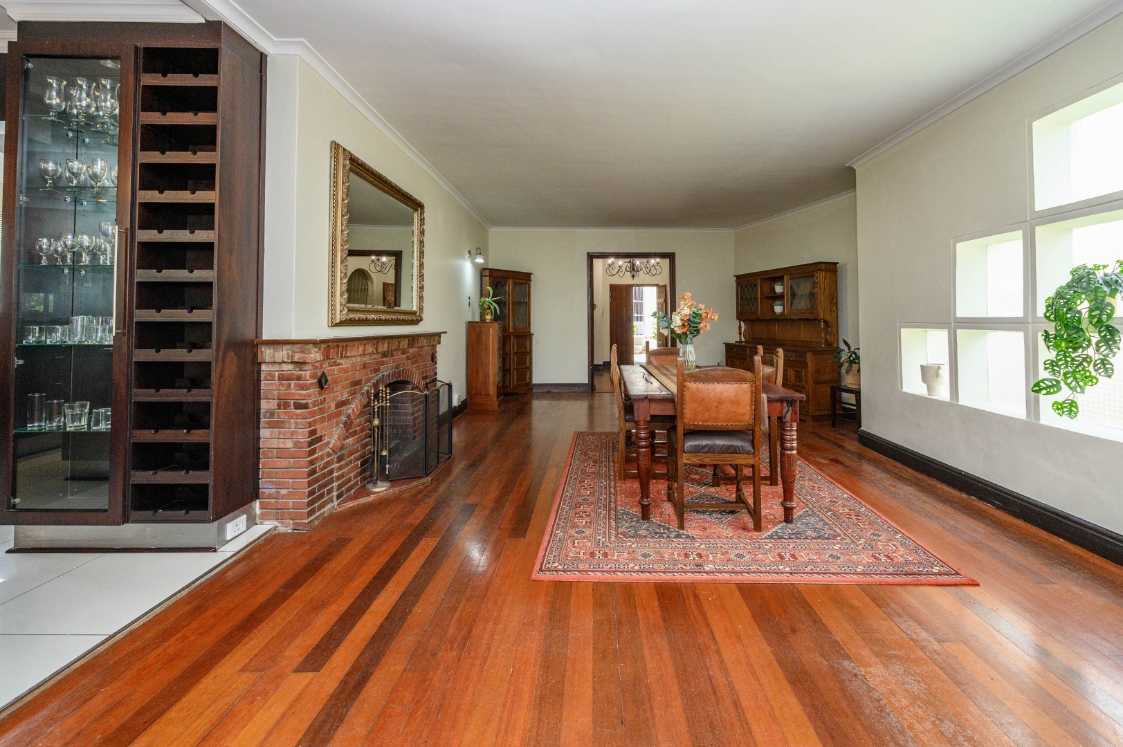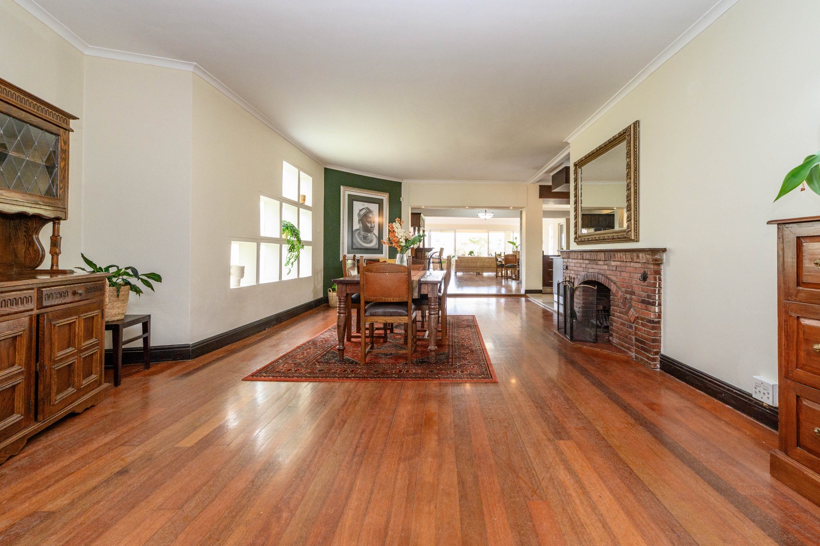 A welcoming entrance hall leads into a stylish lounge with built-in braai and bar, ideal for entertaining. The well-appointed kitchen with separate scullery flows into the dining room with fireplace, creating a warm and inviting central living space. Additional features include a guest toilet.