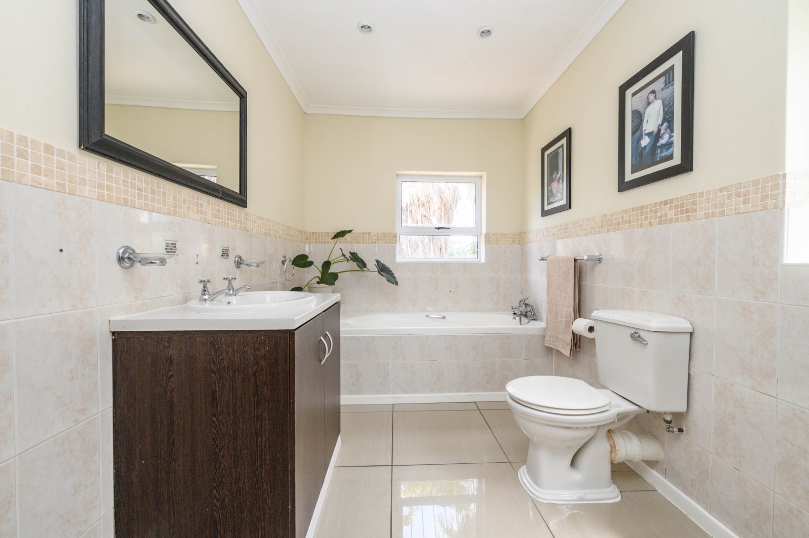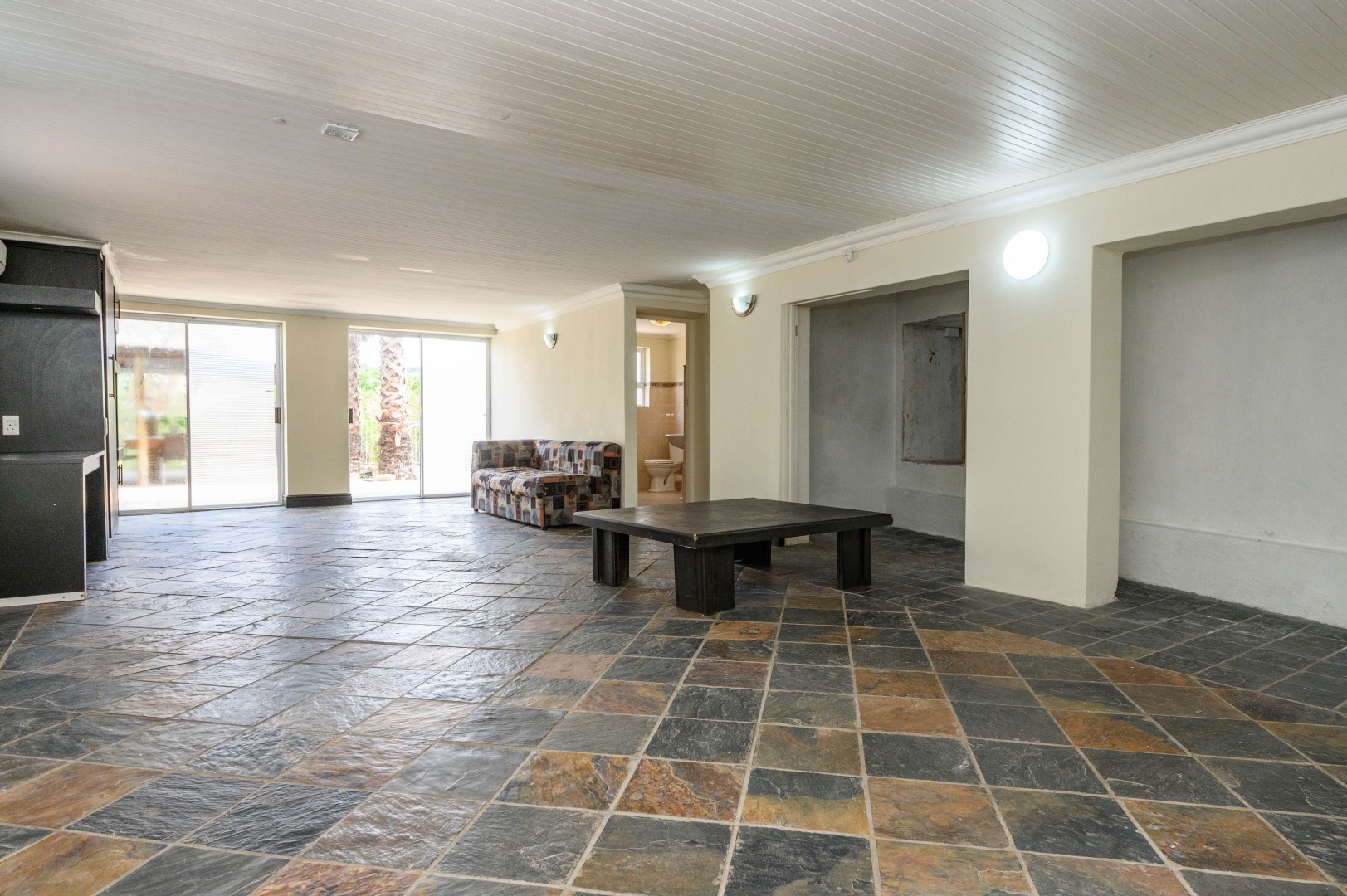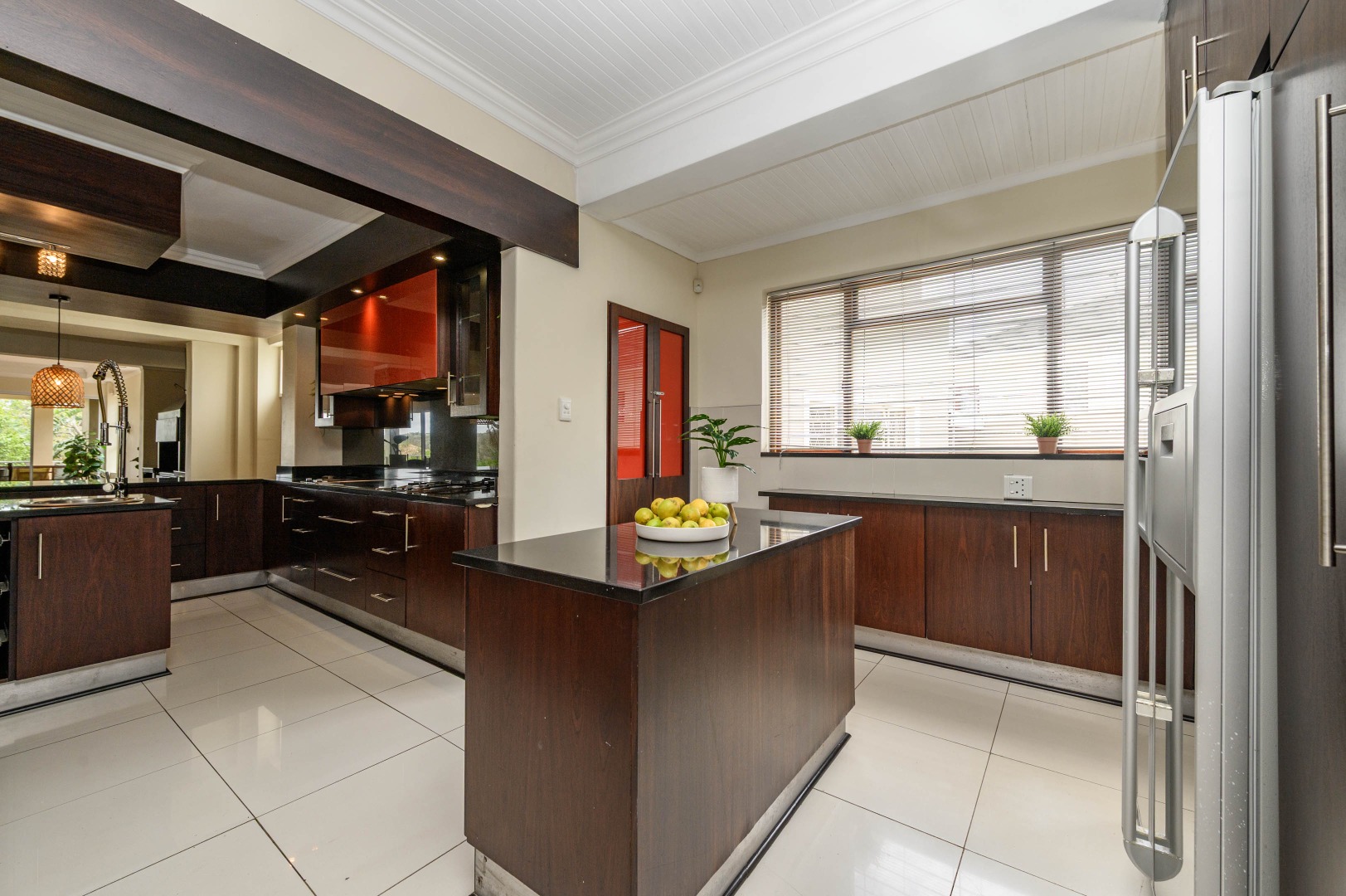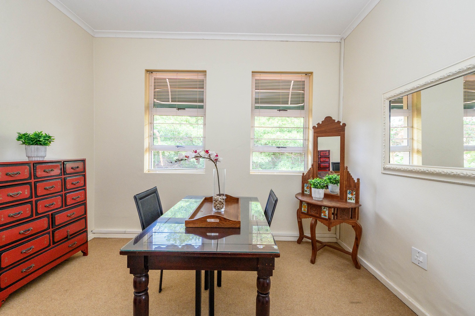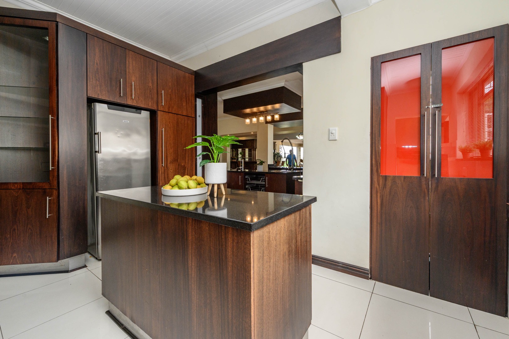 A welcoming entrance hall leads into a stylish lounge with built-in braai and bar, ideal for entertaining. The well-appointed kitchen with separate scullery flows into the dining room with fireplace, creating a warm and inviting central living space. Additional features include a guest toilet.