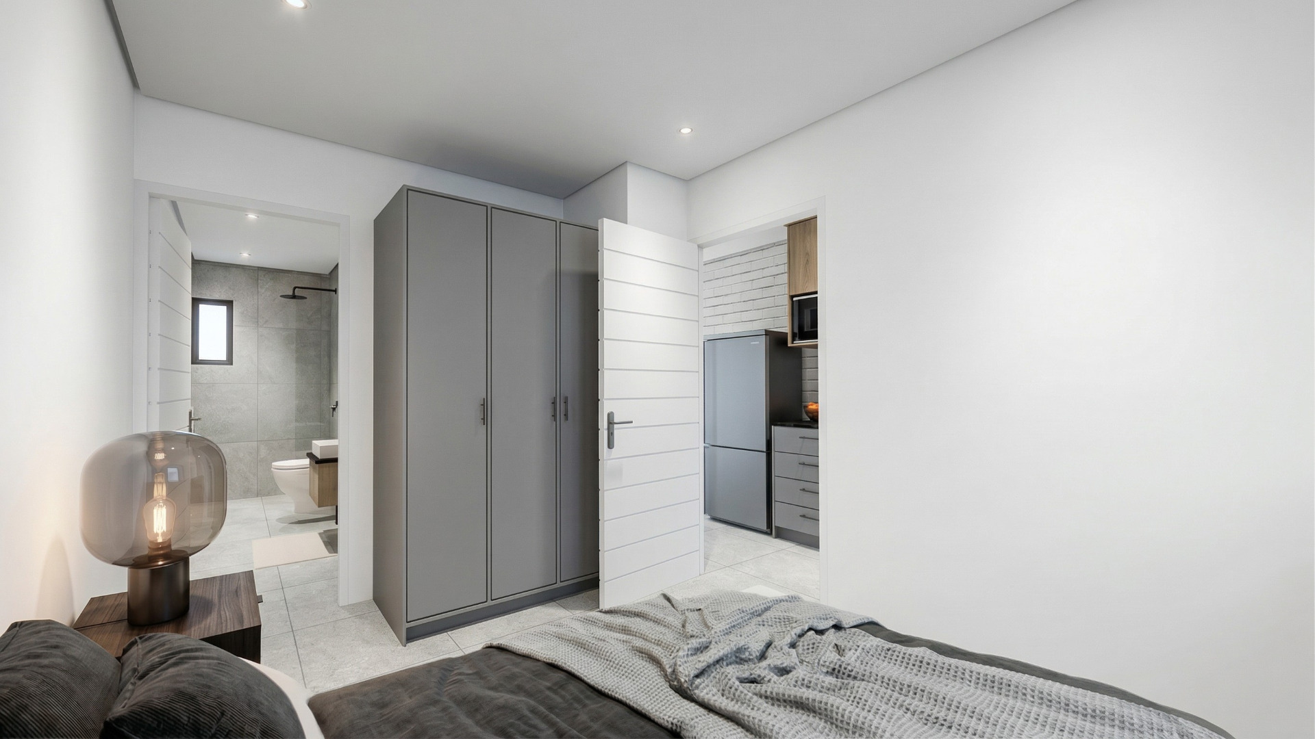 The open-plan layout creates a comfortable flow between the kitchen and living area, leading out to a covered patio with built-in braai, ideal for relaxed everyday living. The bedroom is well-proportioned, complemented by a modern bathroom.