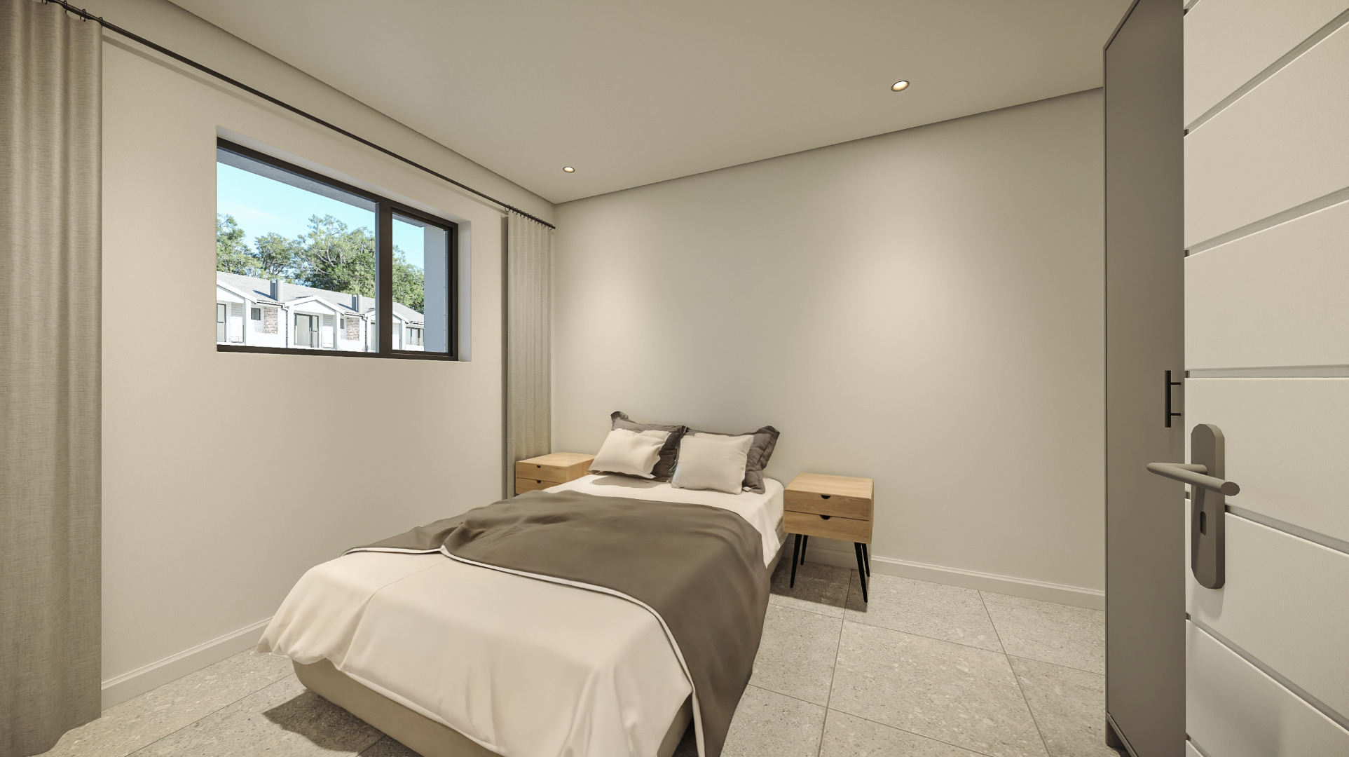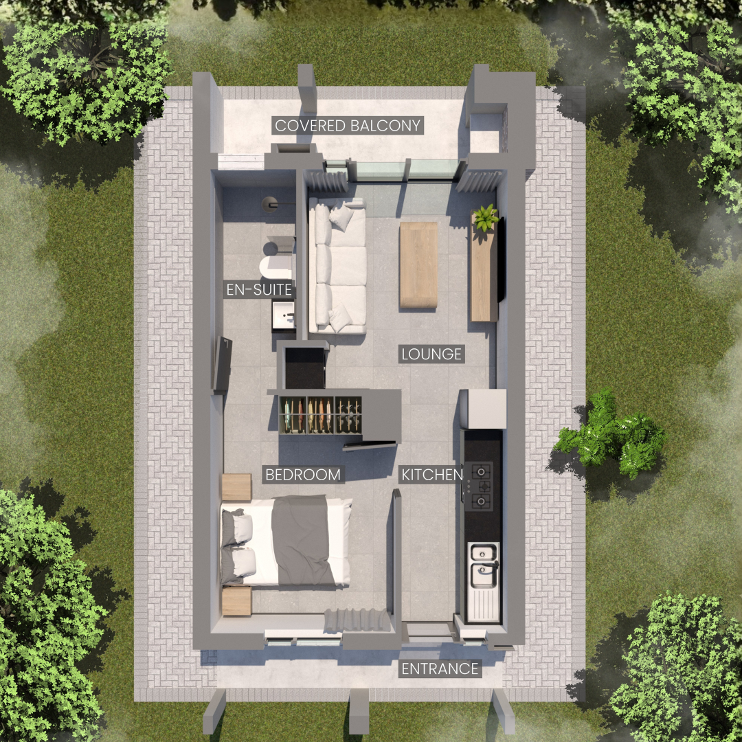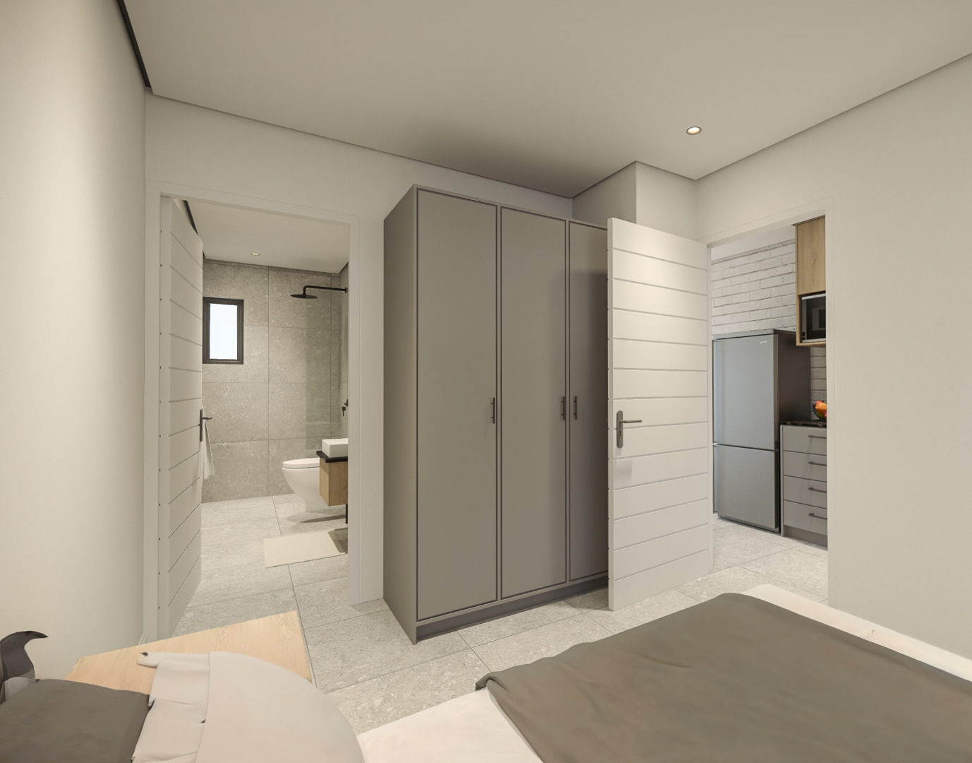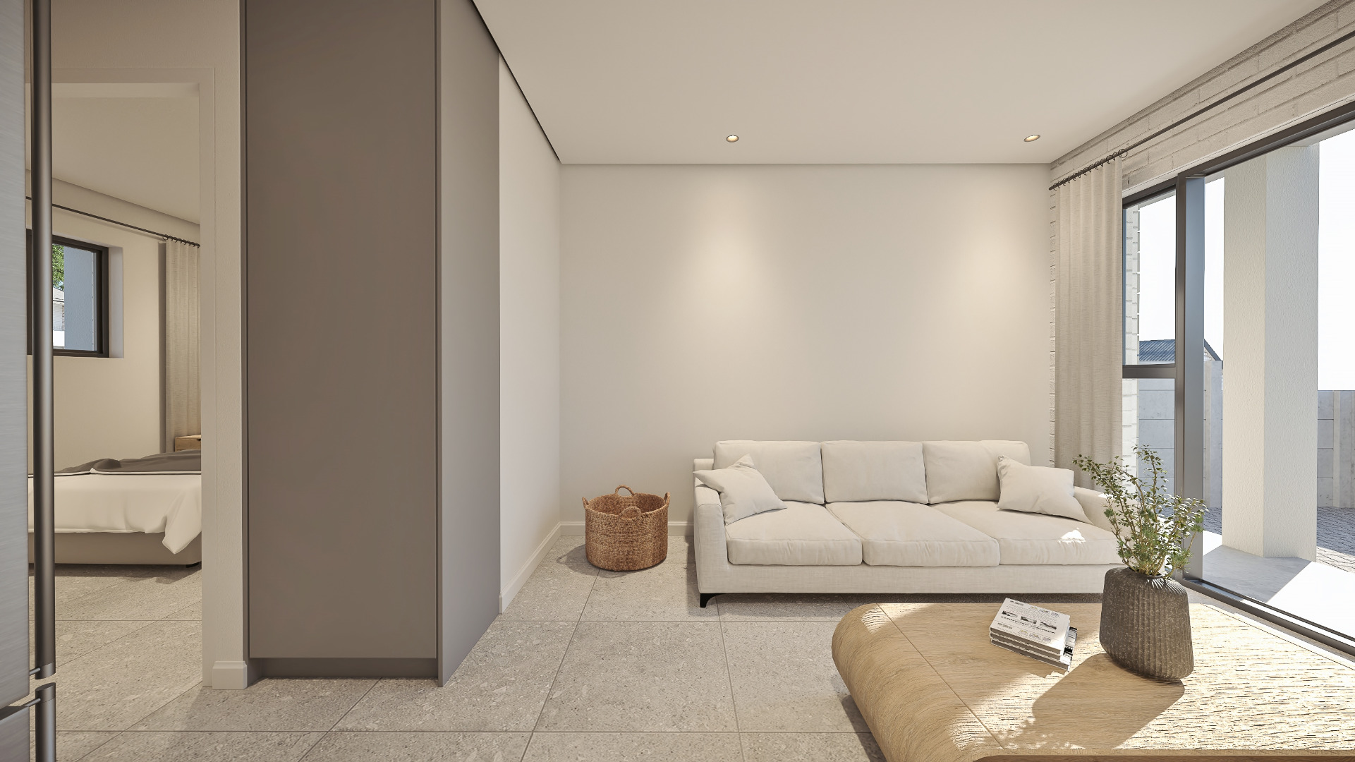 The open-plan layout creates a comfortable flow between the kitchen and living area, leading out to a covered balcony with built-in braai, ideal for relaxed everyday living. The bedroom is well-proportioned, complemented by a modern bathroom.