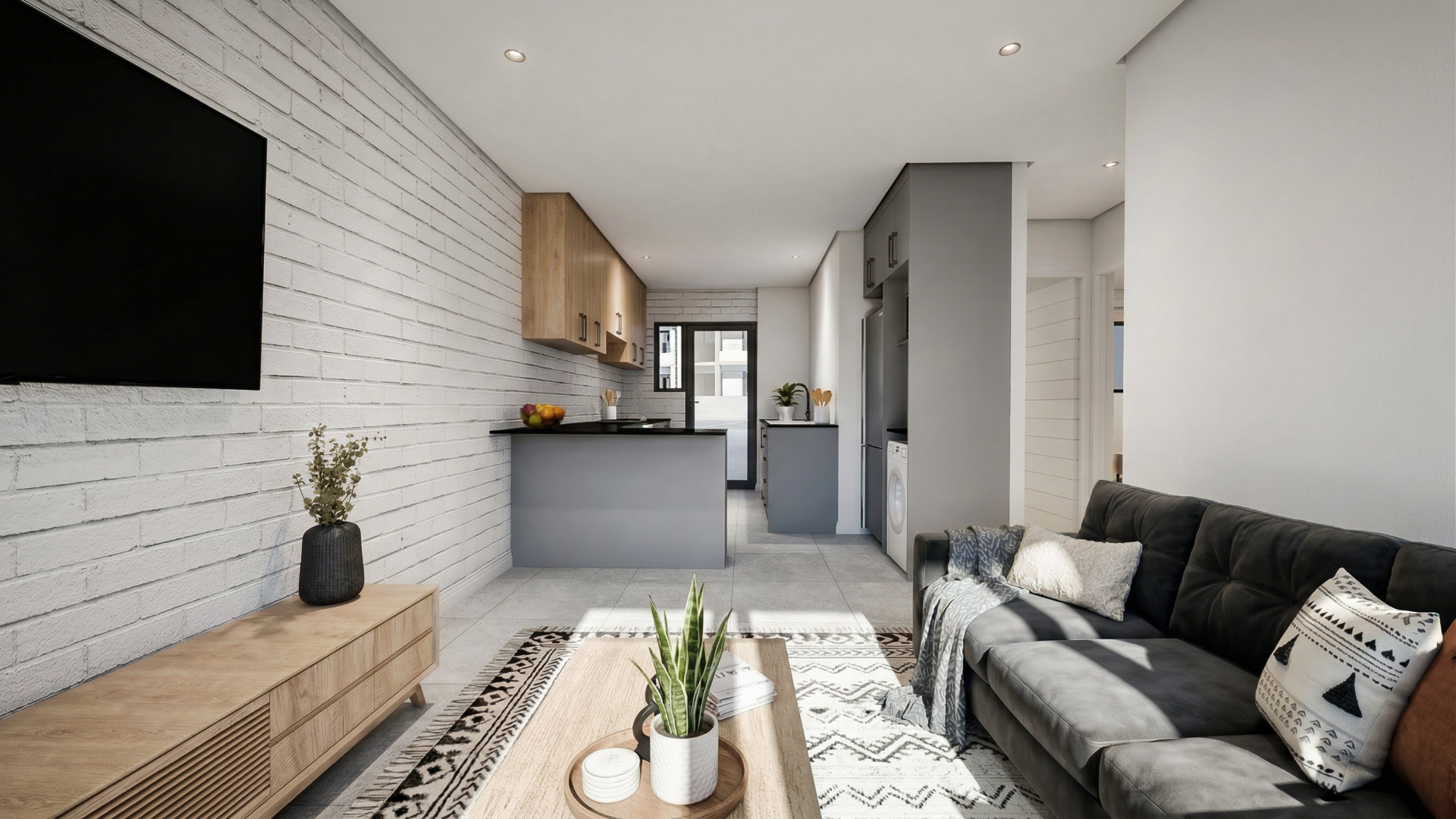 Designed for easy, low-maintenance living, the open-plan kitchen and living area create a bright, functional space. The main bathroom features a bath with a shower over, toilet and basin, while the en-suite includes a shower, toilet and basin. The main bedroom opens with a sliding door onto the covered balcony, while the lounge also leads out to the same balcony, creating seamless indoor-outdoor flow. The balcony includes a built-in braai, ideal for relaxed entertaining with elevated privacy.