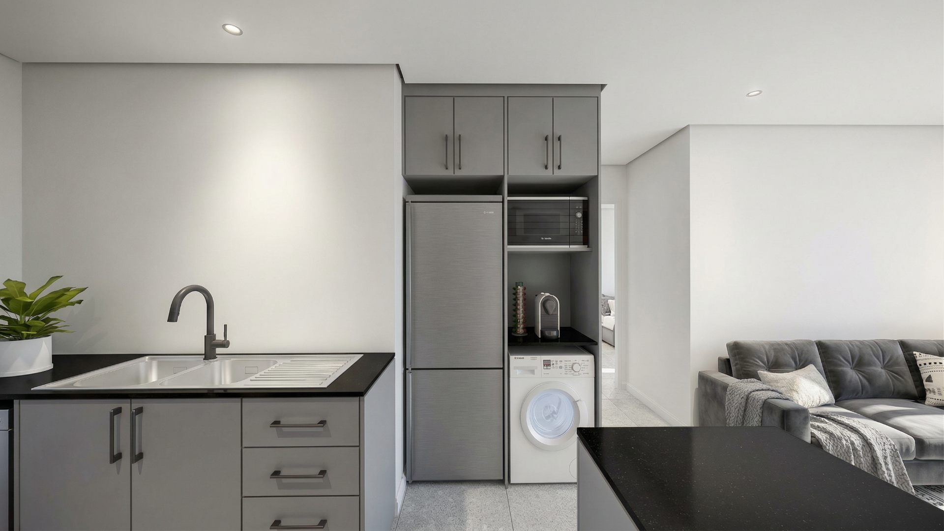 This stylish top floor apartment offers the same generous layout at a more accessible price point and features two well-sized bedrooms, including a main bedroom with en-suite.