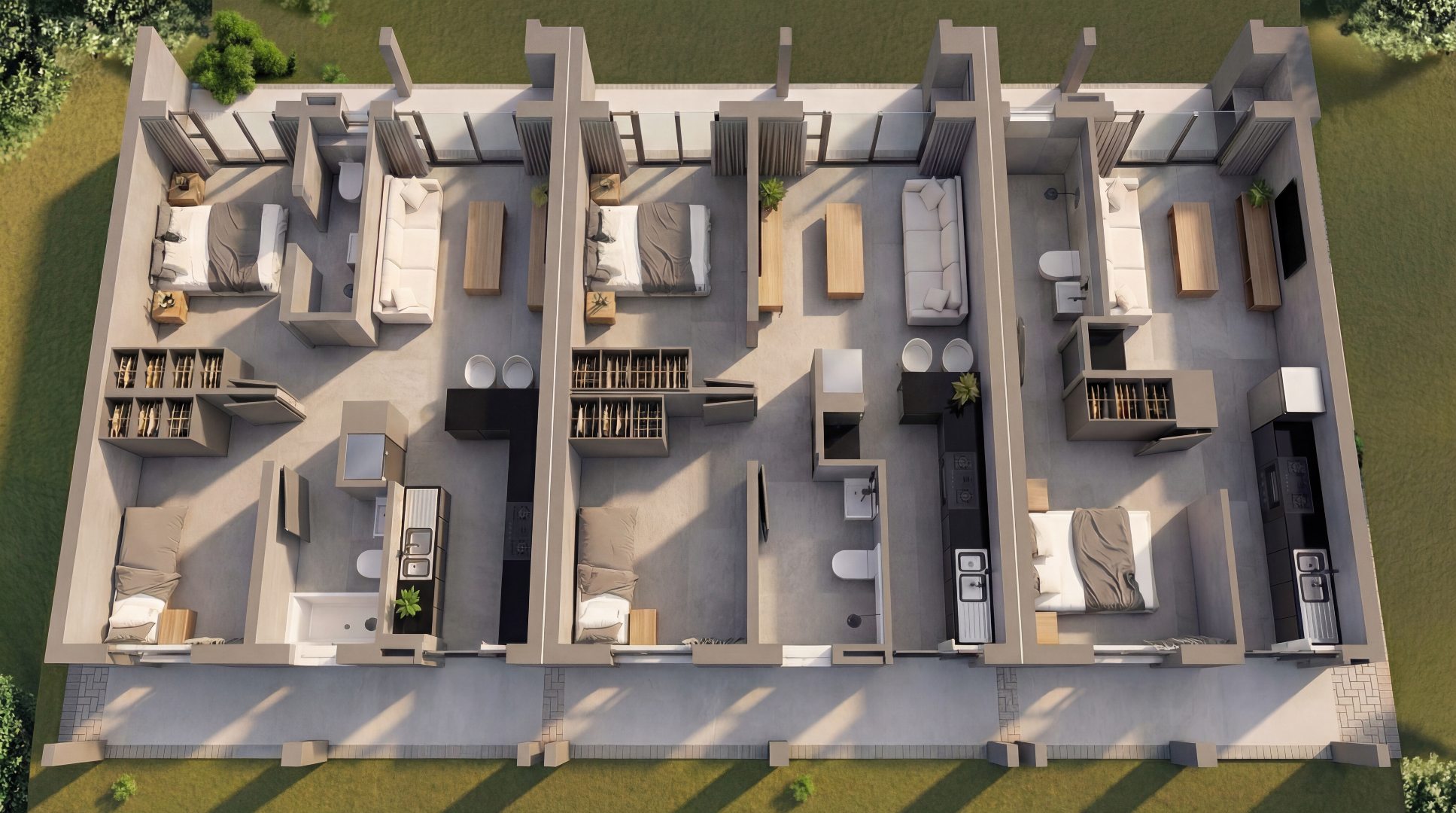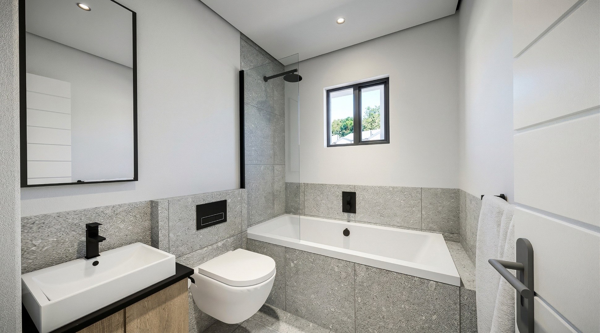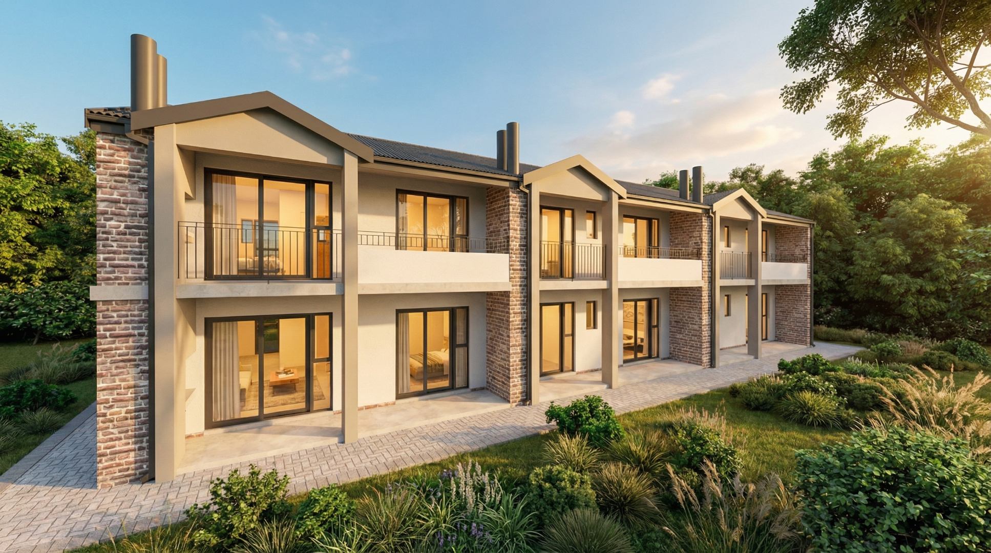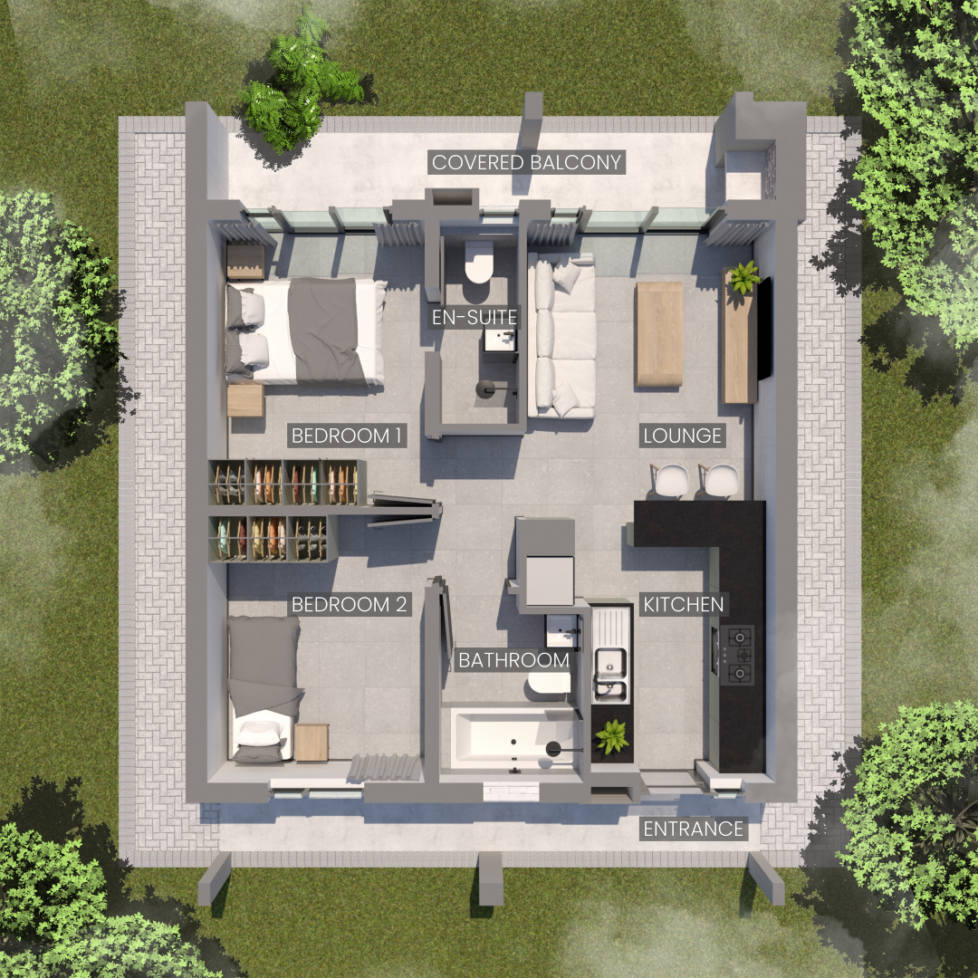 Designed for easy, low-maintenance living, the open-plan kitchen and living area create a bright, functional space. The main bathroom features a bath with a shower over, toilet and basin, while the en-suite includes a shower, toilet and basin. The main bedroom opens with a sliding door onto the covered balcony, while the lounge also leads out to the same balcony, creating seamless indoor-outdoor flow. The balcony includes a built-in braai, ideal for relaxed entertaining with elevated privacy.