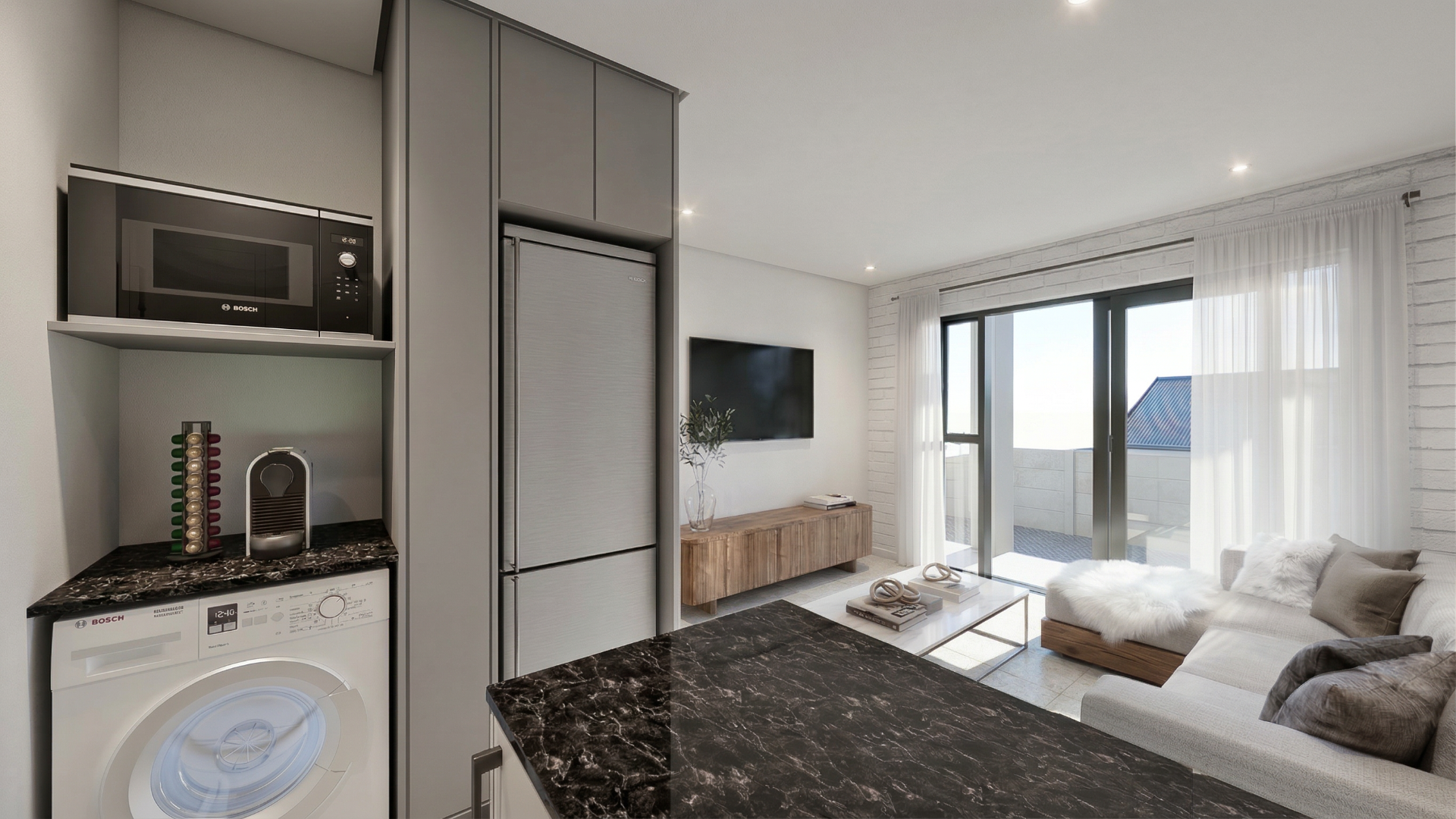 The open-plan kitchen flows into the living area, leading out to a covered patio with built-in braai, creating a functional and welcoming space ideal for everyday living or entertaining. Two well-sized bedrooms are serviced by a modern bathroom.