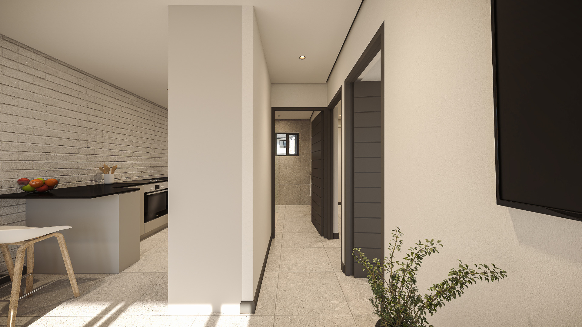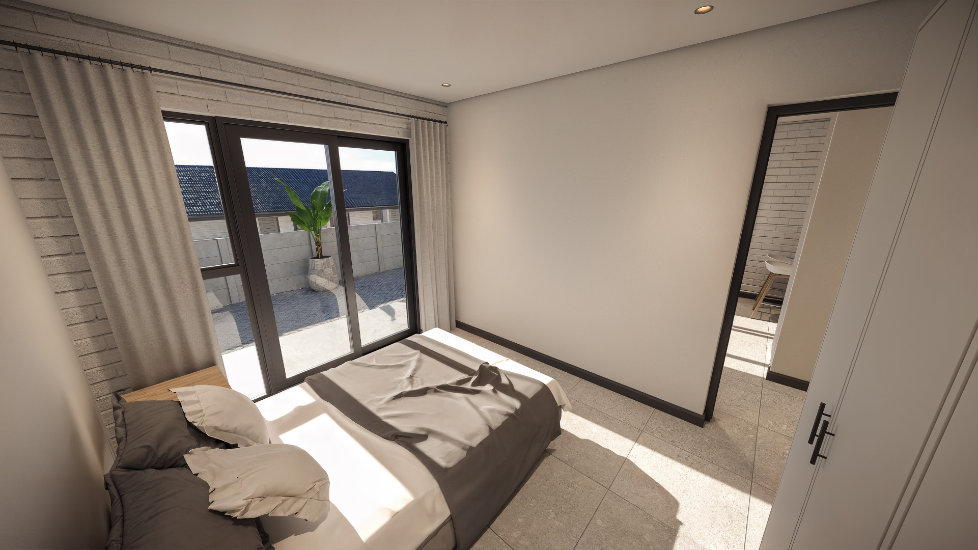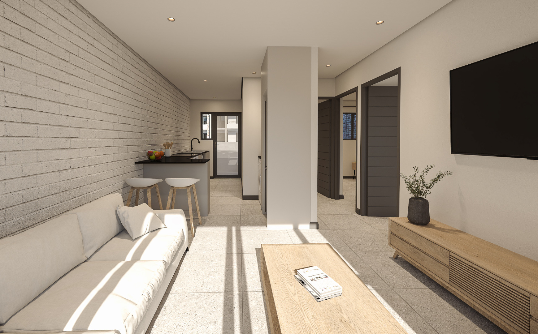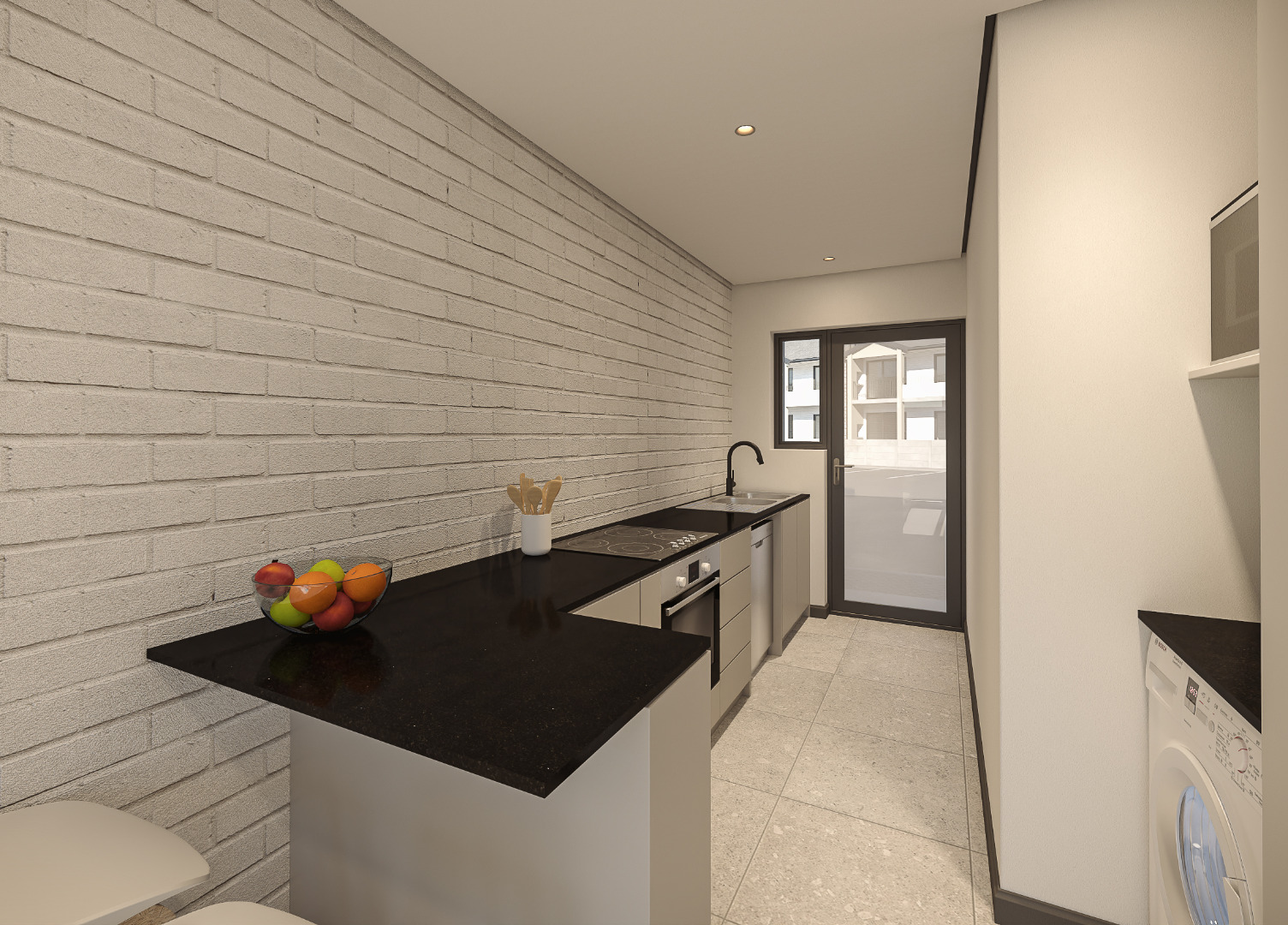 The open-plan kitchen flows into the living area, leading out to a covered balcony with built-in braai, creating a functional and welcoming space ideal for everyday living or entertaining. Two well-sized bedrooms are serviced by a modern bathroom.