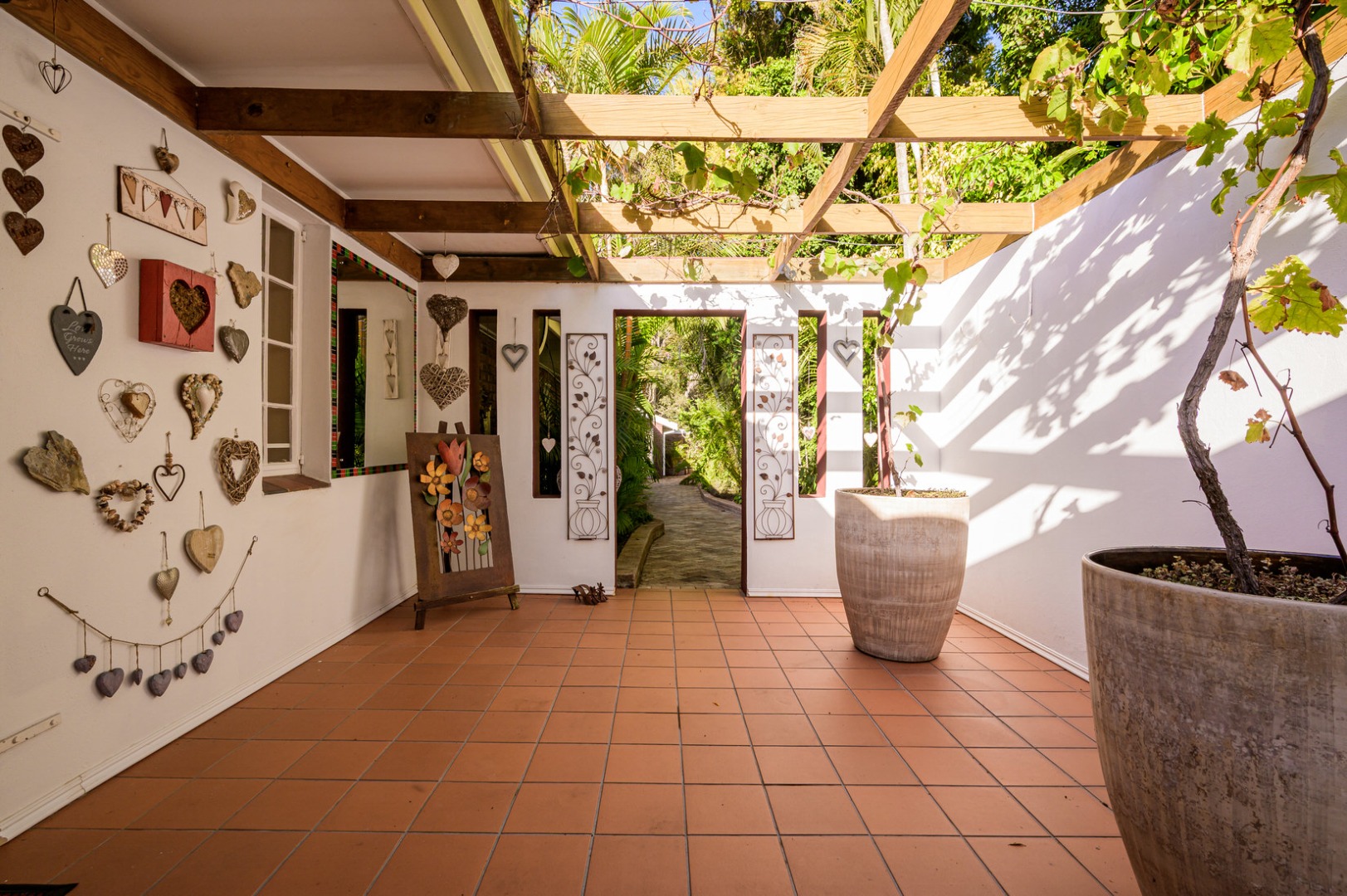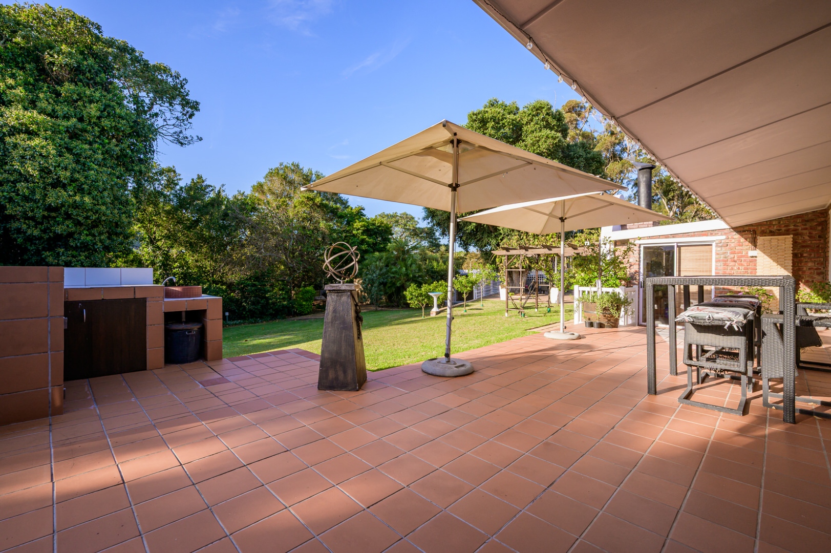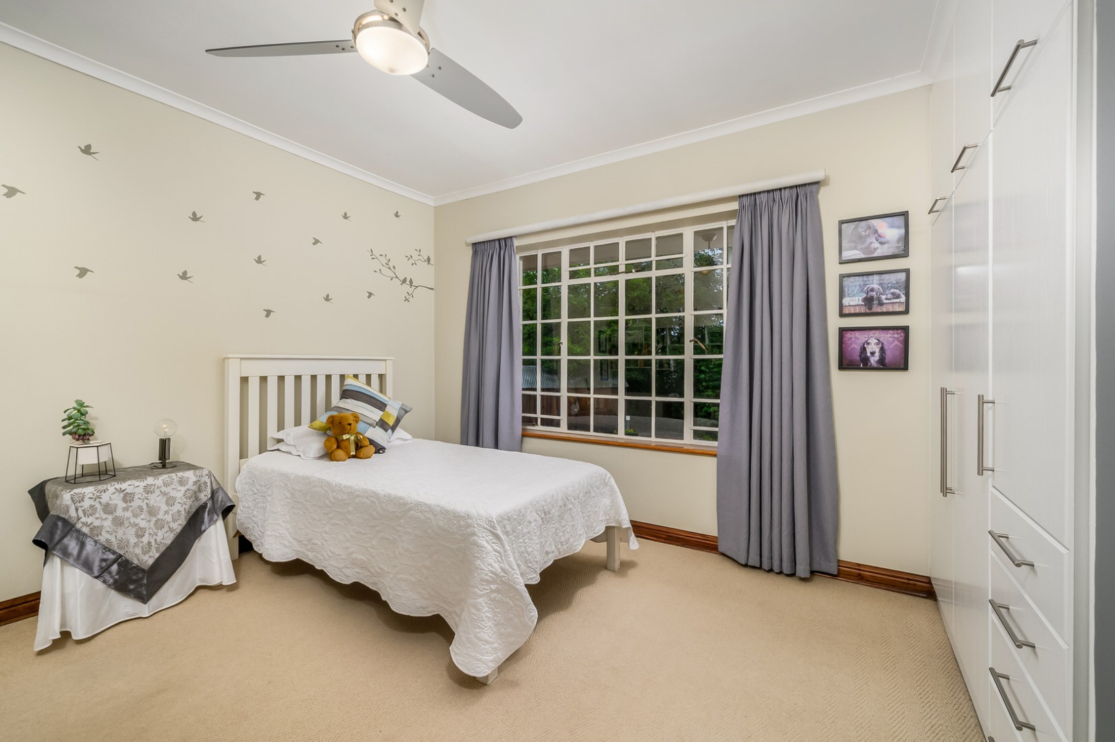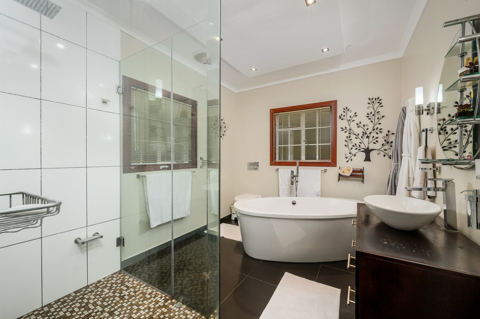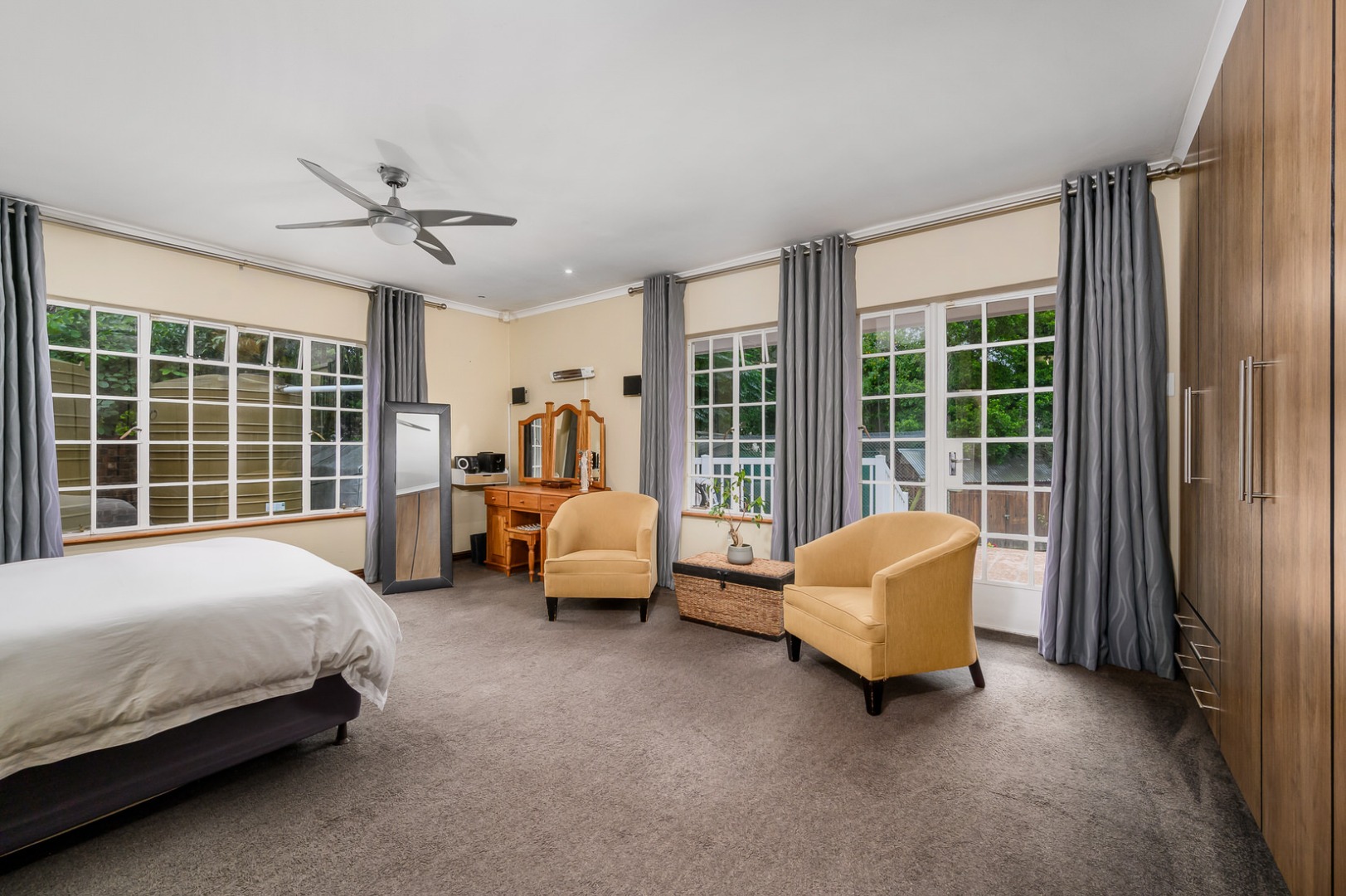 The home offers five generously sized bedrooms, with the main suite being a true retreat. This luxurious space opens onto a private patio, offering a serene escape. The ensuite bathroom is a masterpiece, featuring a shower, bath, toilet, and basin, while a fitted study in the corner adds to the suite’s functionality.