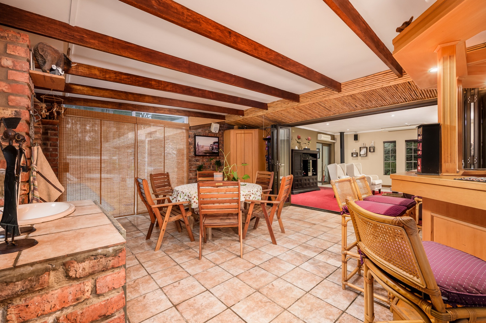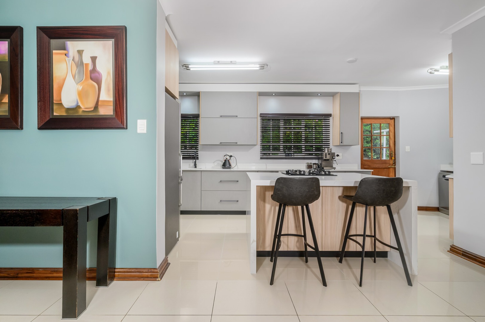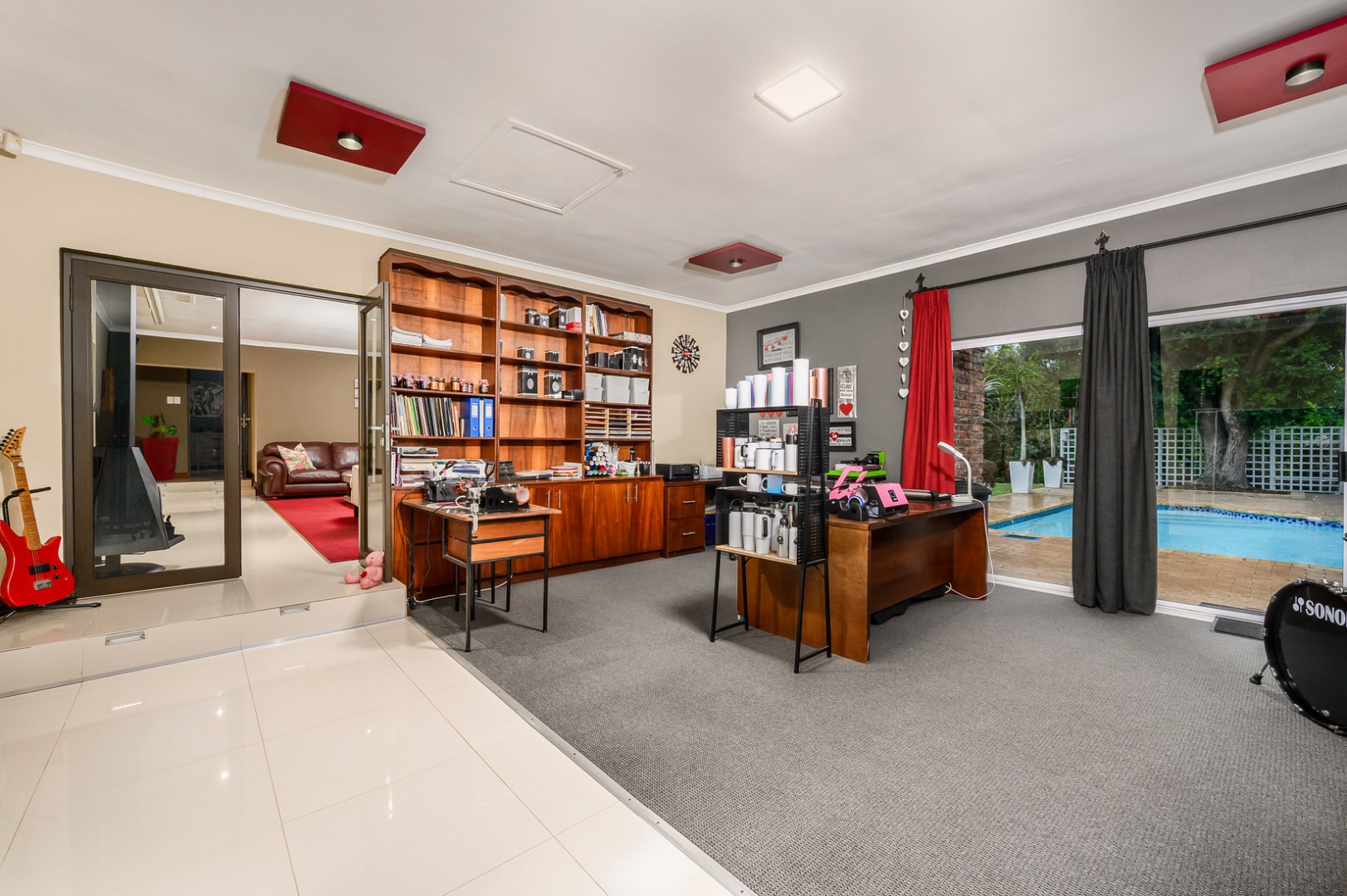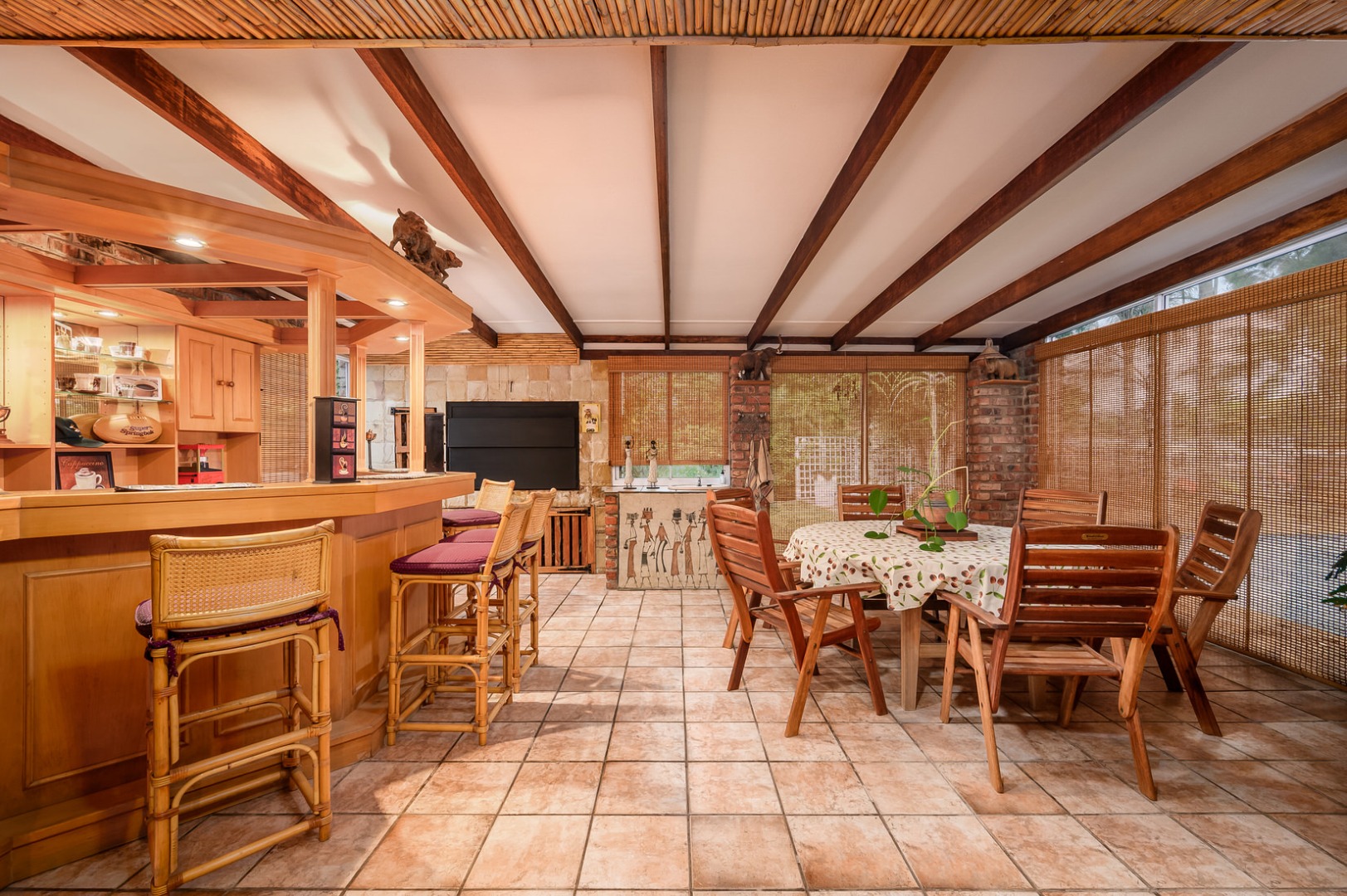 Entertainment is at the heart of this home, with a well-equipped cinema room offering the perfect space for movie nights. This leads into a welcoming braai room, complete with a fitted bar and built-in braai, opening onto the pool and outdoor patio areas—ideal for hosting guests or unwinding with family.