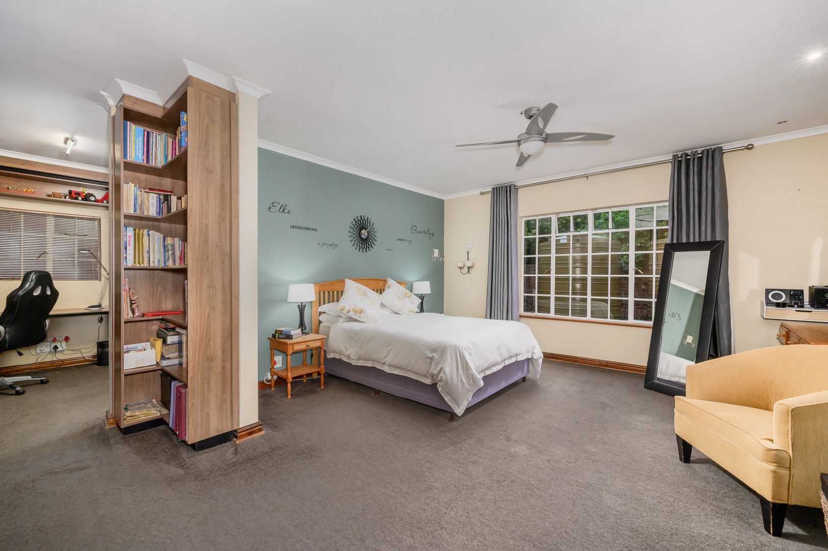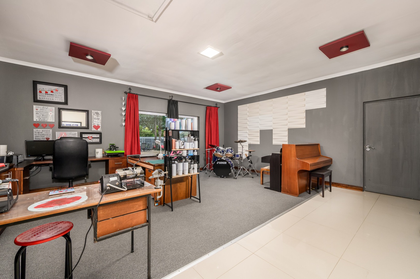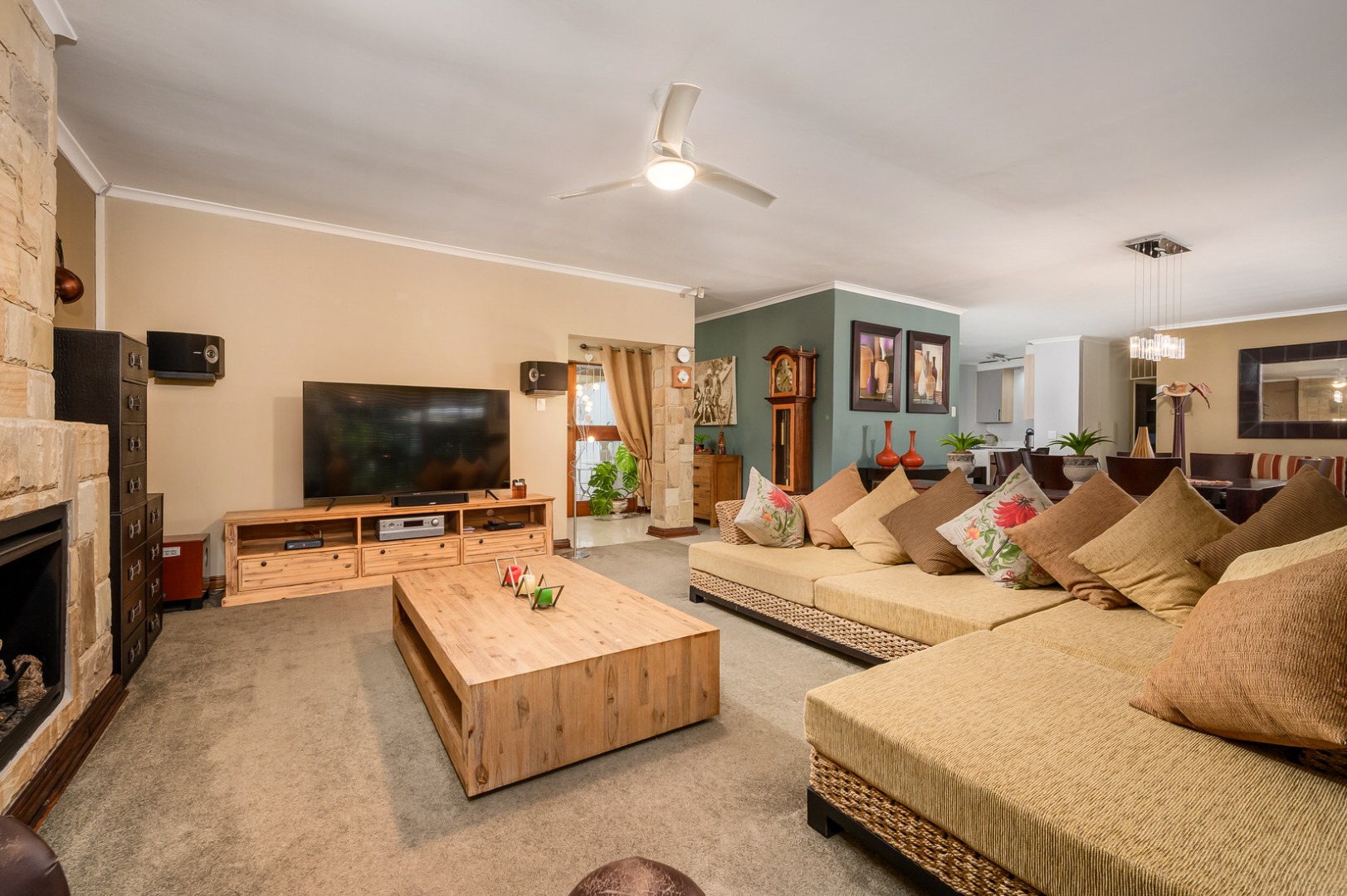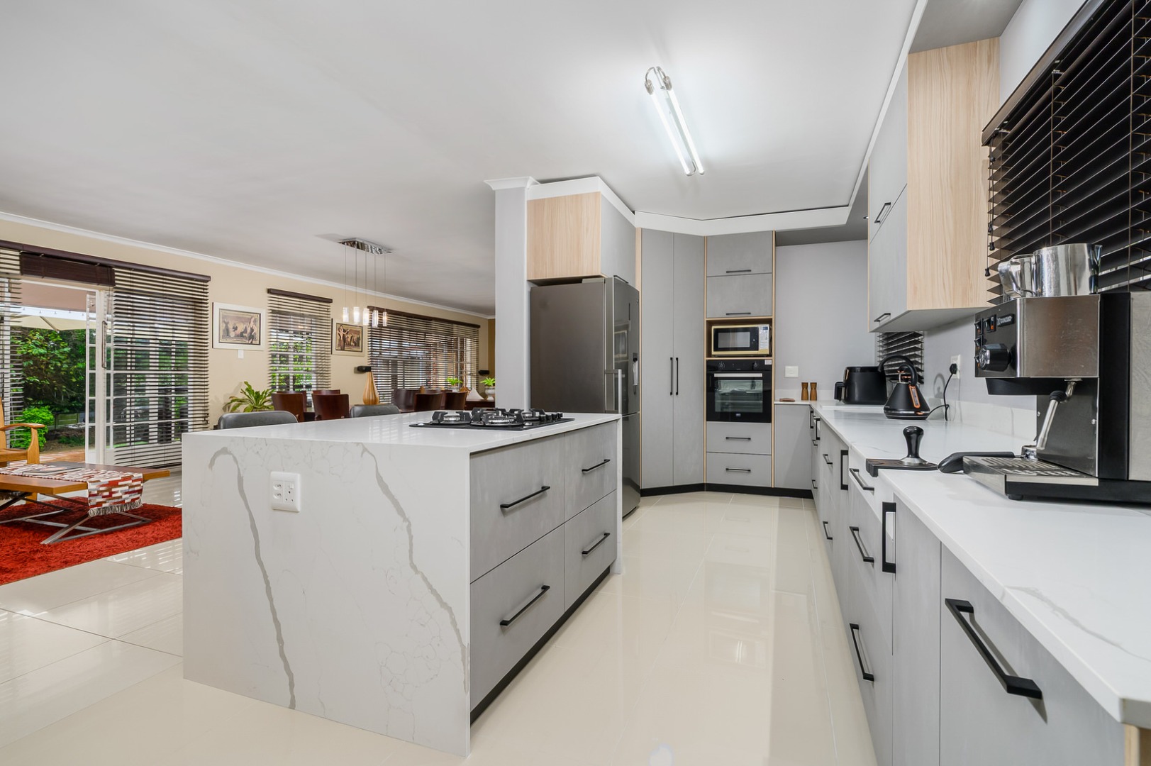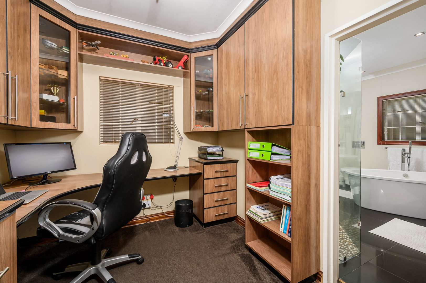 Entertainment is at the heart of this home, with a well-equipped cinema room offering the perfect space for movie nights. This leads into a welcoming braai room, complete with a fitted bar and built-in braai, opening onto the pool and outdoor patio areas—ideal for hosting guests or unwinding with family.