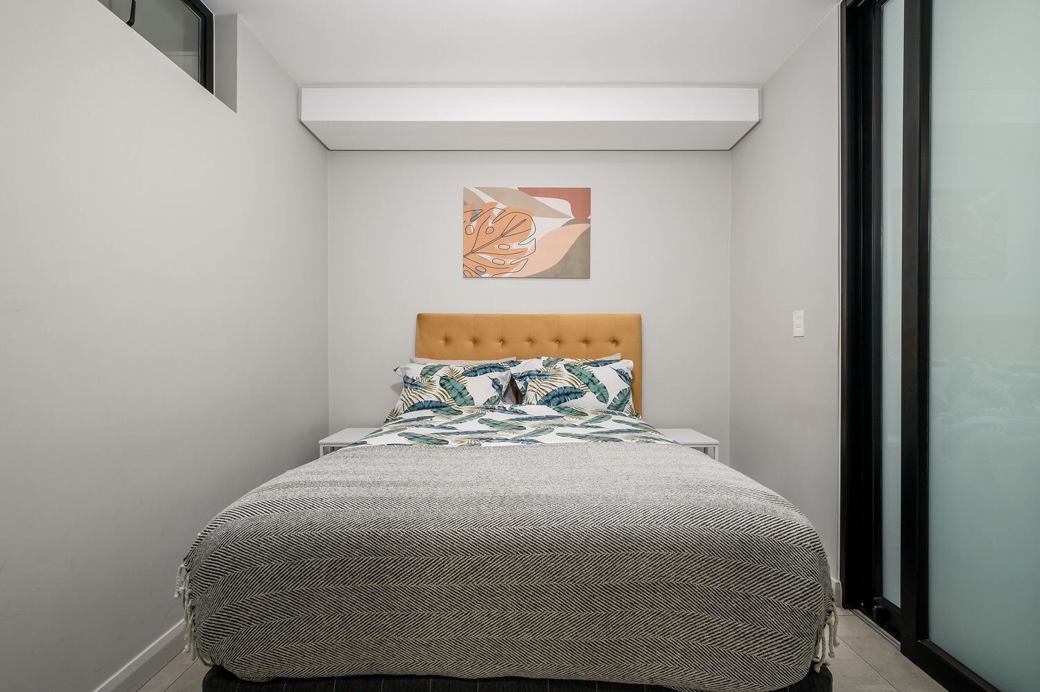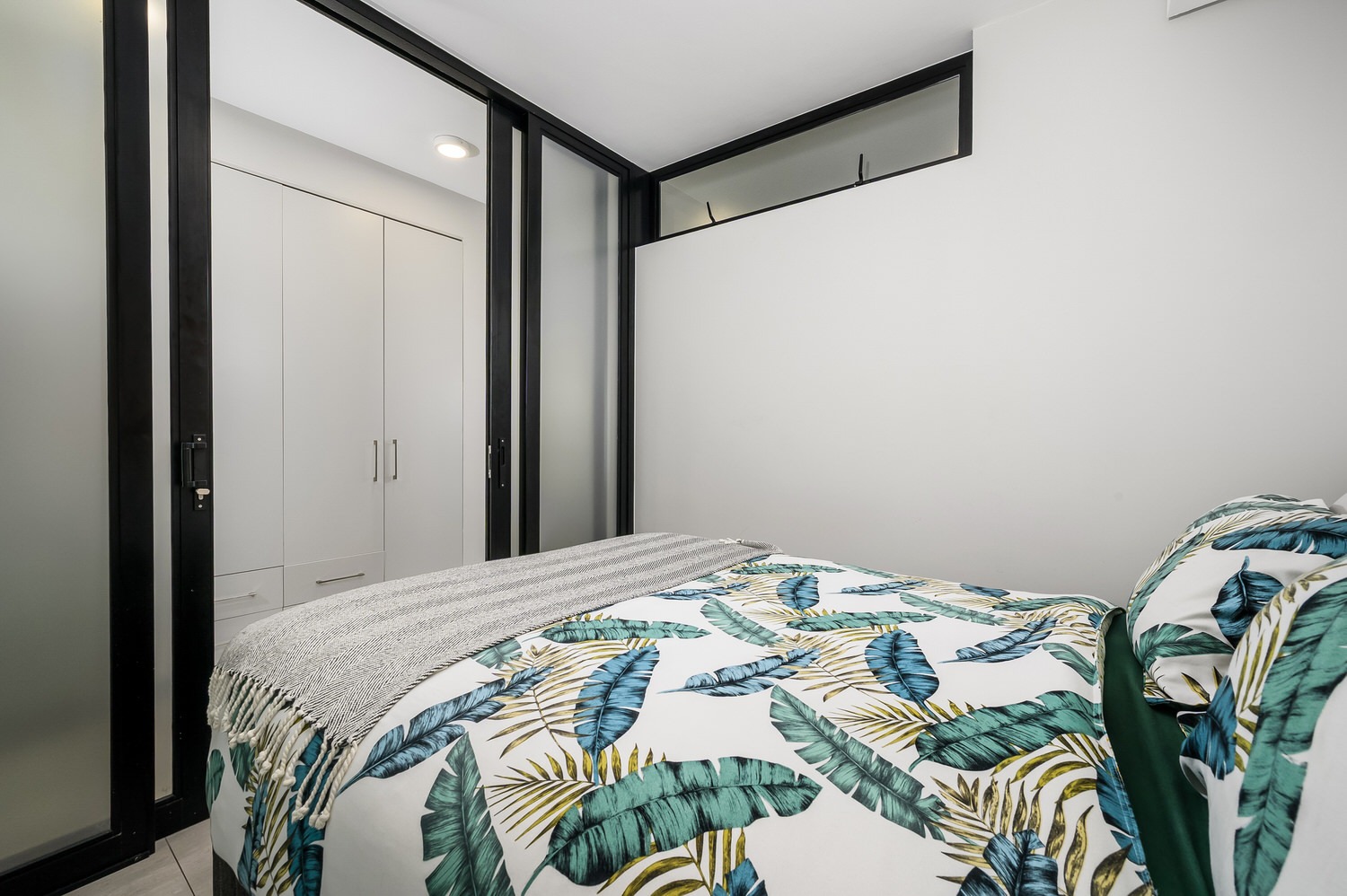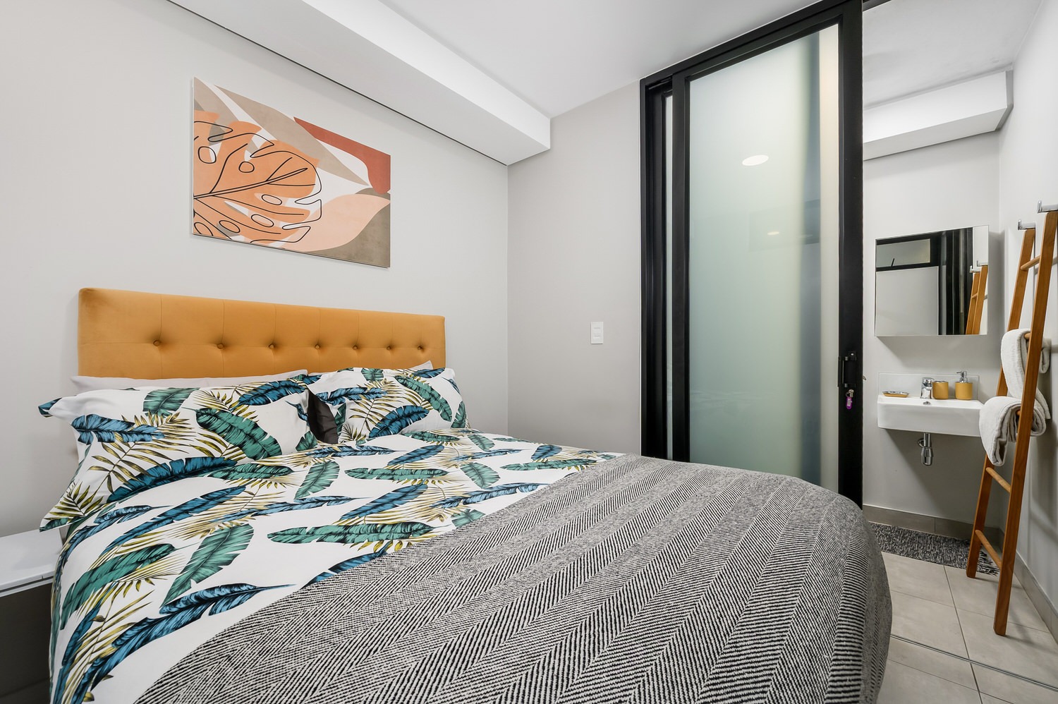 The apartment offers a cozy bedroom and a chic, compact bathroom. The bathroom is designed with a modern aesthetic, featuring a shower with stylish fixtures and a glass enclosure, a wall-mounted toilet, and a floating sink – all super easy to keep sparkling clean. You'll also appreciate the private balcony, accessible through large glass sliding doors from the living area, perfect for enjoying a breath of fresh air and even catching a glimpse of the sea view.